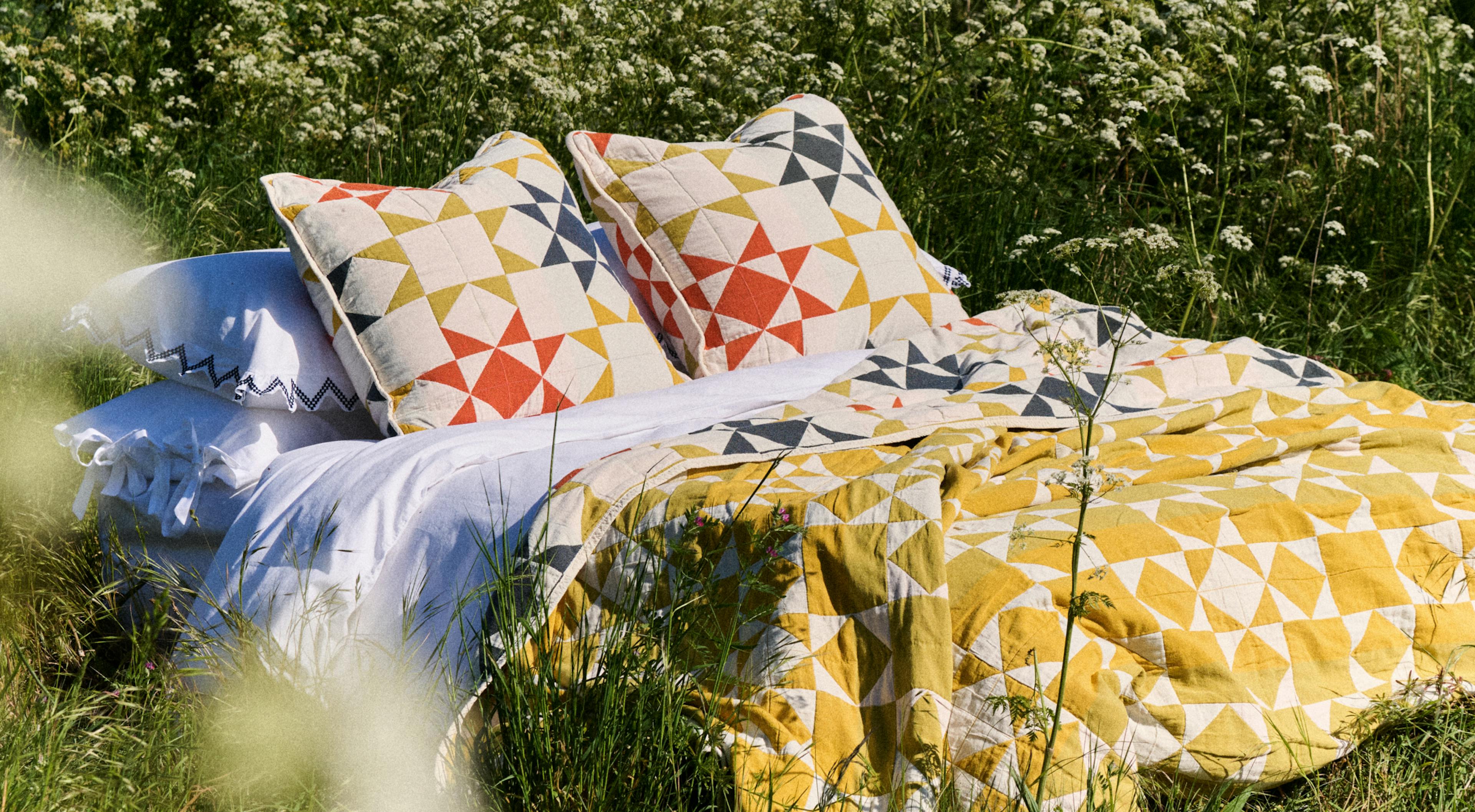 Stella was inspired by a vintage American quilt Laura discovered and loved in a small store in New York. Reimagined through a Glassette lens, it features a bold geometric pattern, soft quilting, and ecru binding that frames each piece with quiet contrast.