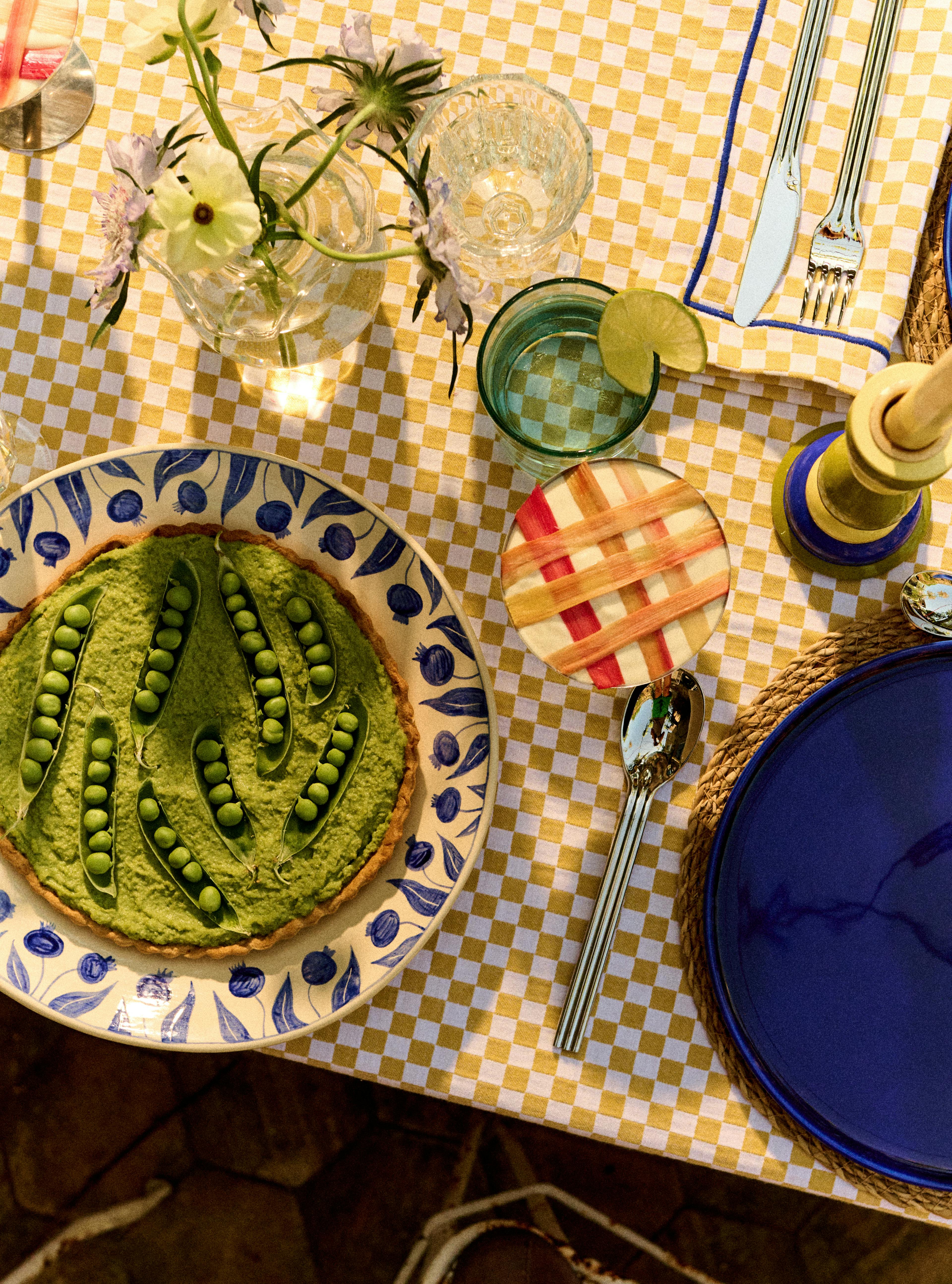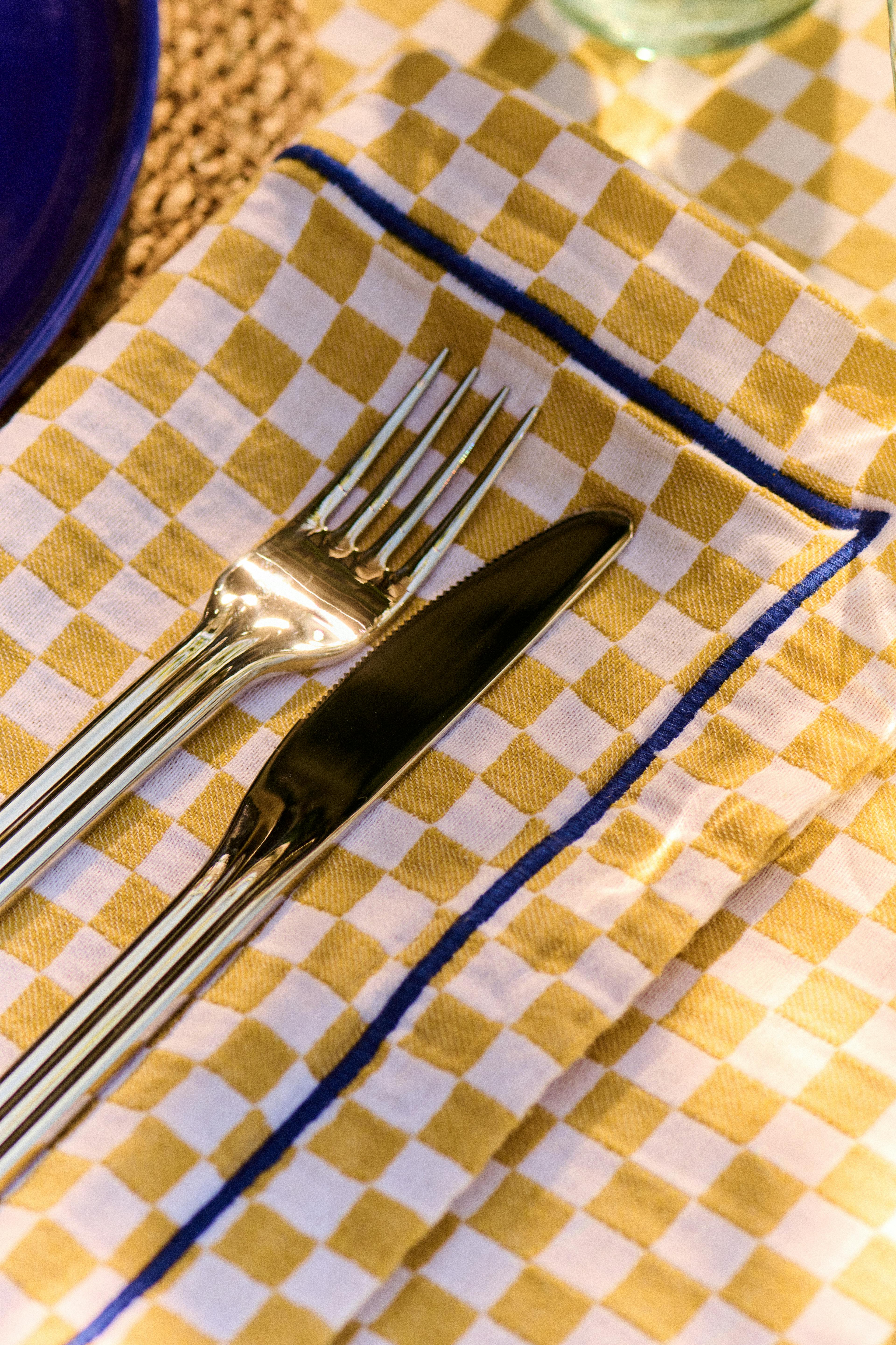 Colour, pattern and play are at the heart of the Glassette world, and the Cecilia range embodies all of that. The bold yellow and white checkerboard weave is joyful and graphic, a signature nod to our love of print and contrast. Framed with a crisp navy embroidered border and finished with mitred edges, each piece - from napkins to tablecloth - is designed to bring personality and warmth to your table.