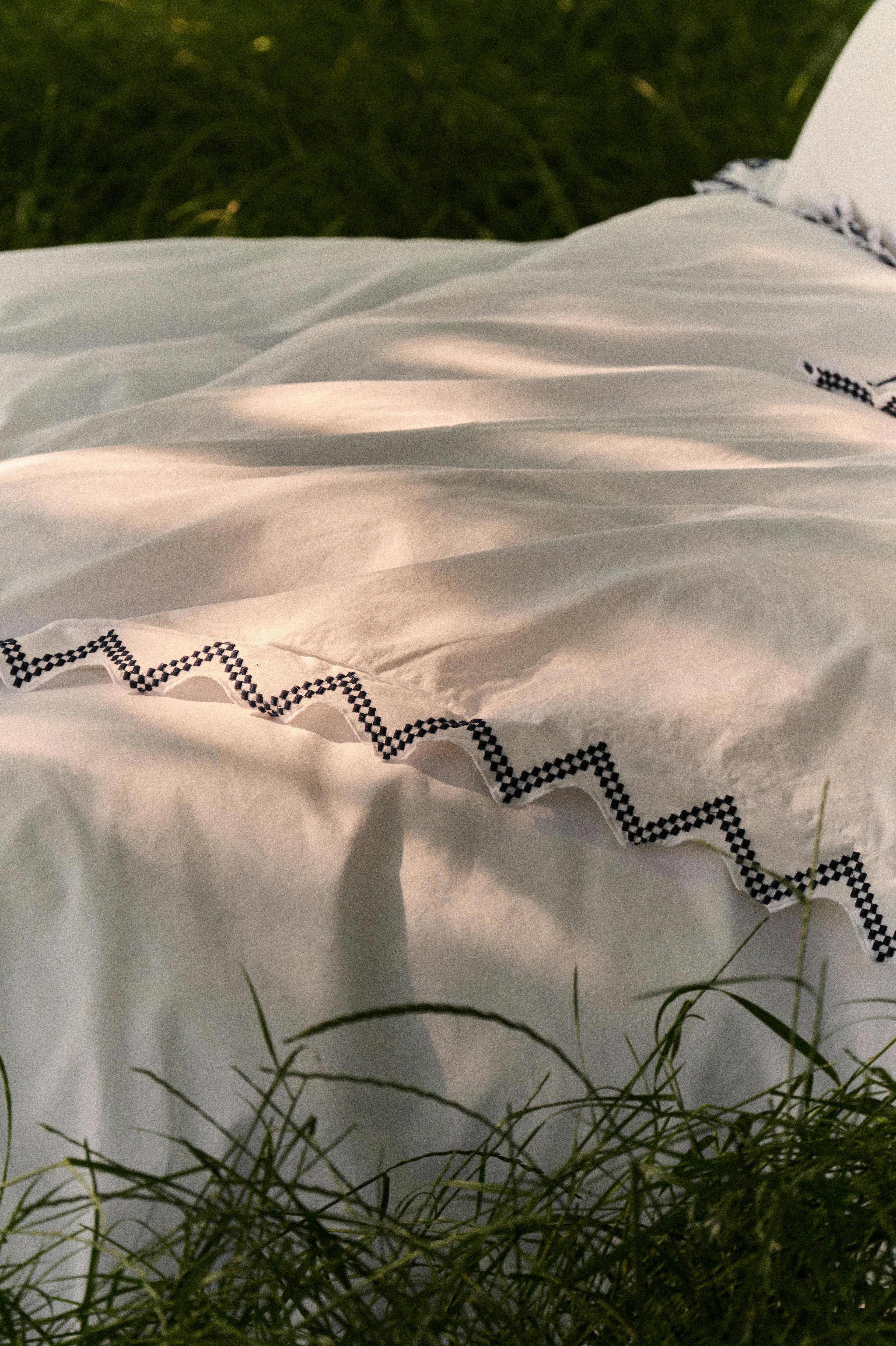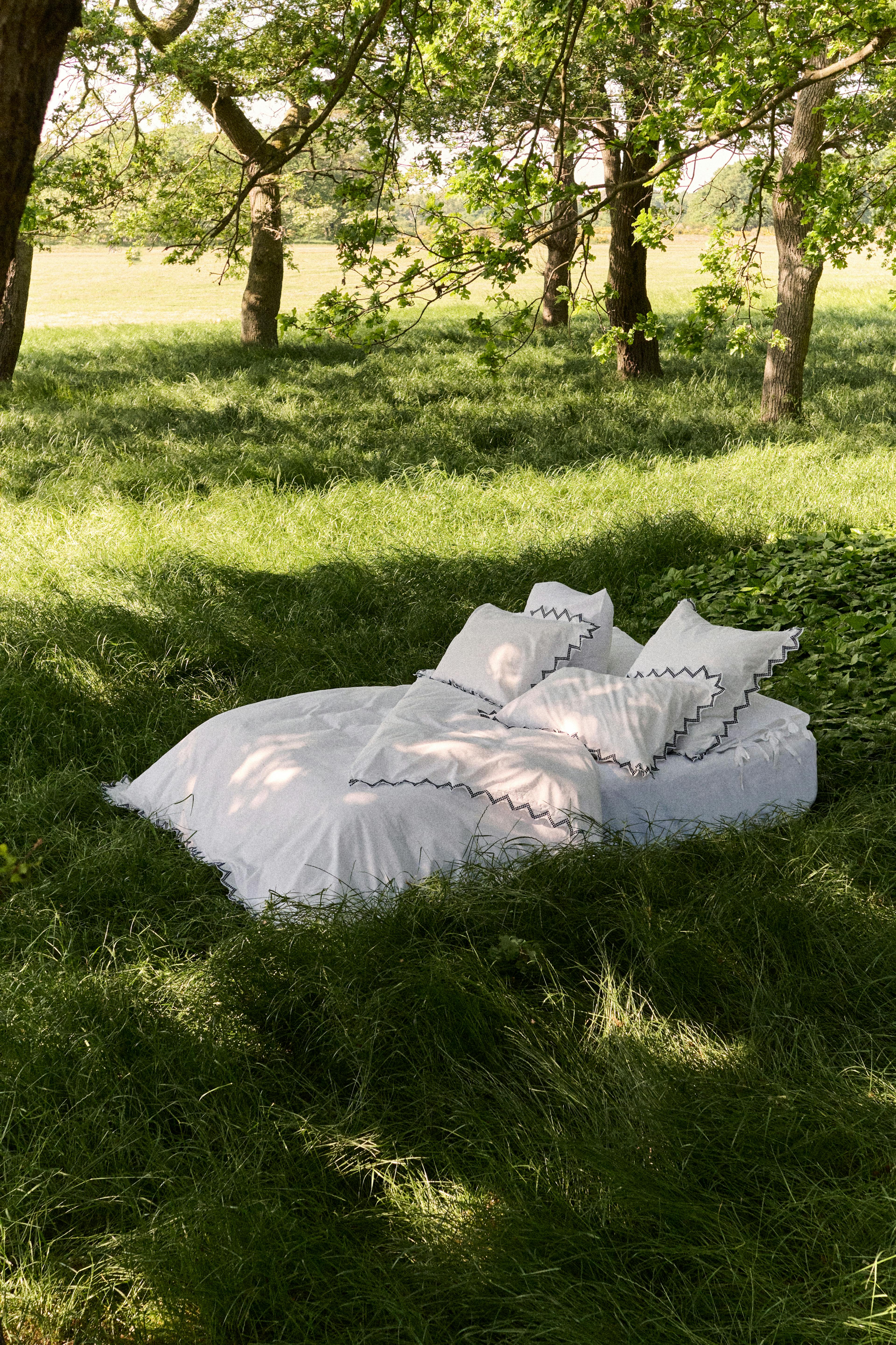 Freida is crisp, tailored, and quietly detailed. Made from optic white cotton and finished with deep navy embroidery, it brings a sense of structure and calm to the bedroom.