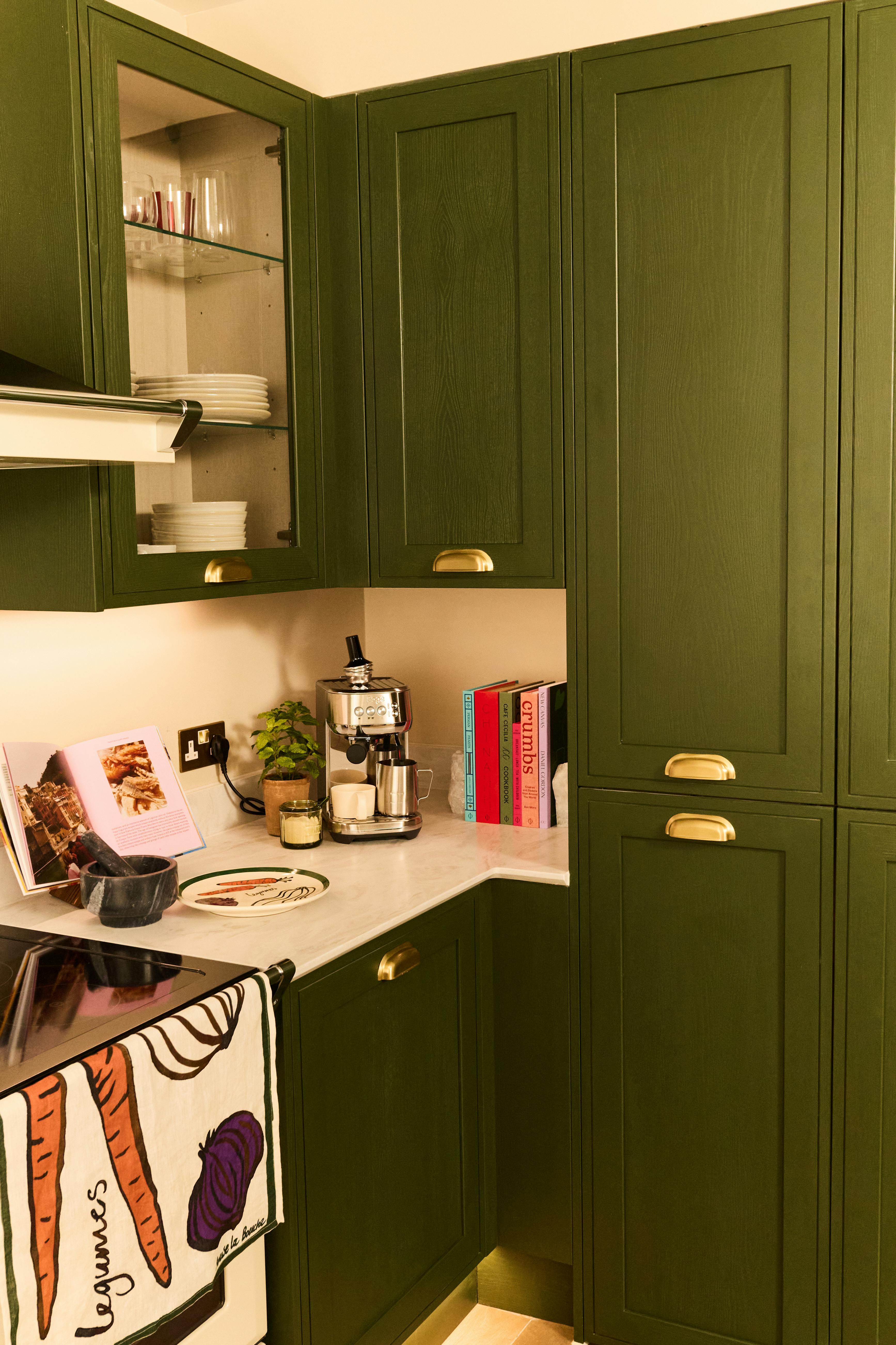 The kitchen has a warm, shaker-style charm with rich timber cabinetry and a cleverly concealed pantry that keeps the space feeling calm and considered. On the worktop, we stacked a handful of vibrant Phaidon cookbooks – they’re as practical as they are beautiful, adding a burst of colour and a touch of personality to the space.