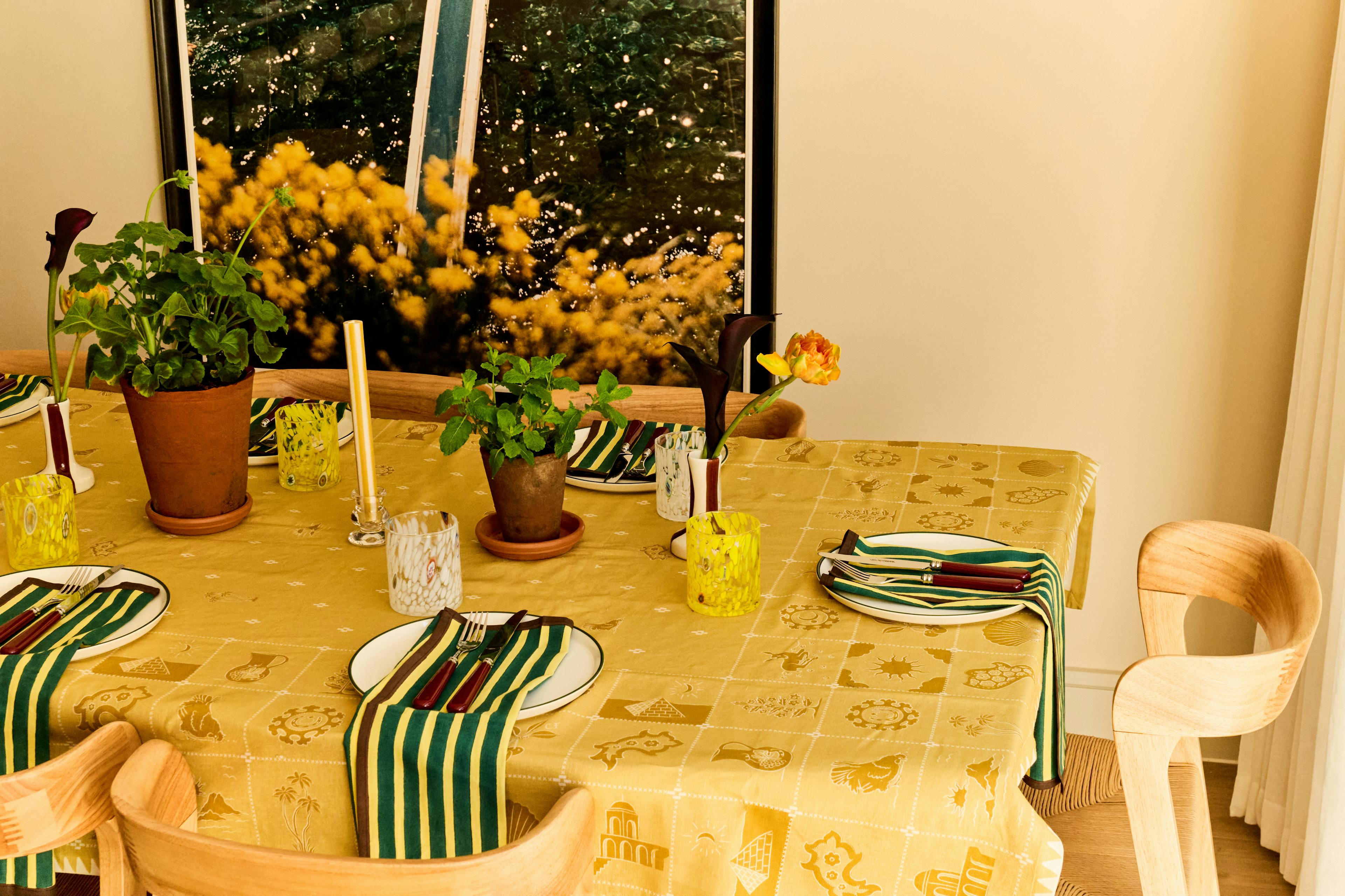 We carried the colour and contemporary energy of the interiors to the outside, where a boldly striped tablecloth by Late Afternoon sets the tone for sunny, laid-back lunches. Yellow cutlery from Sabre adds a playful pop – making the whole space feel vibrant and joyful.