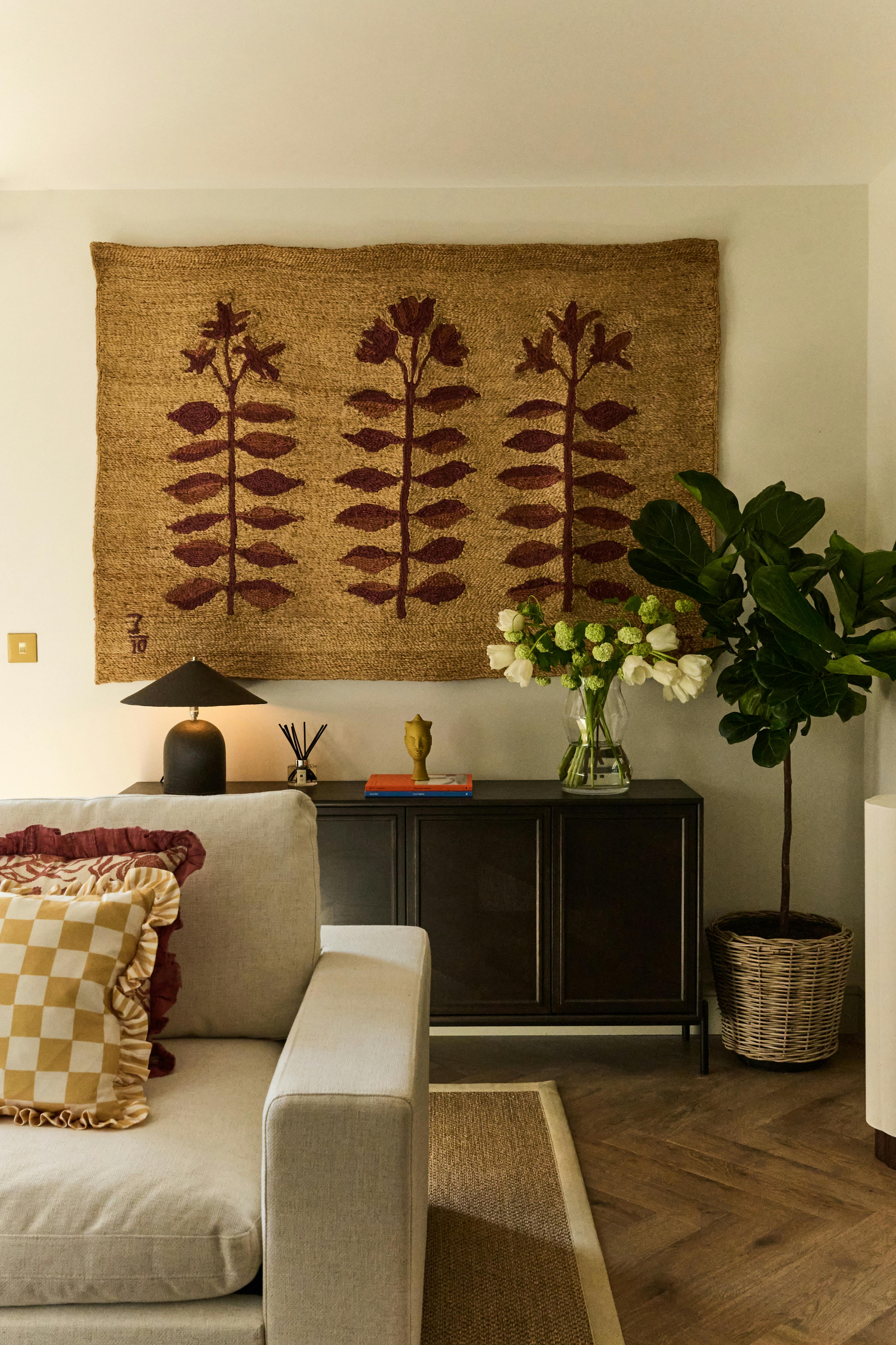 We layered the living room with warmth and texture, bringing in a beautifully handwoven tapestry by Pelican House and playful cushions from Colours of Arley and Volga Linen. These pieces add a sense of depth and personality to the space – tactile, comforting, and full of character.