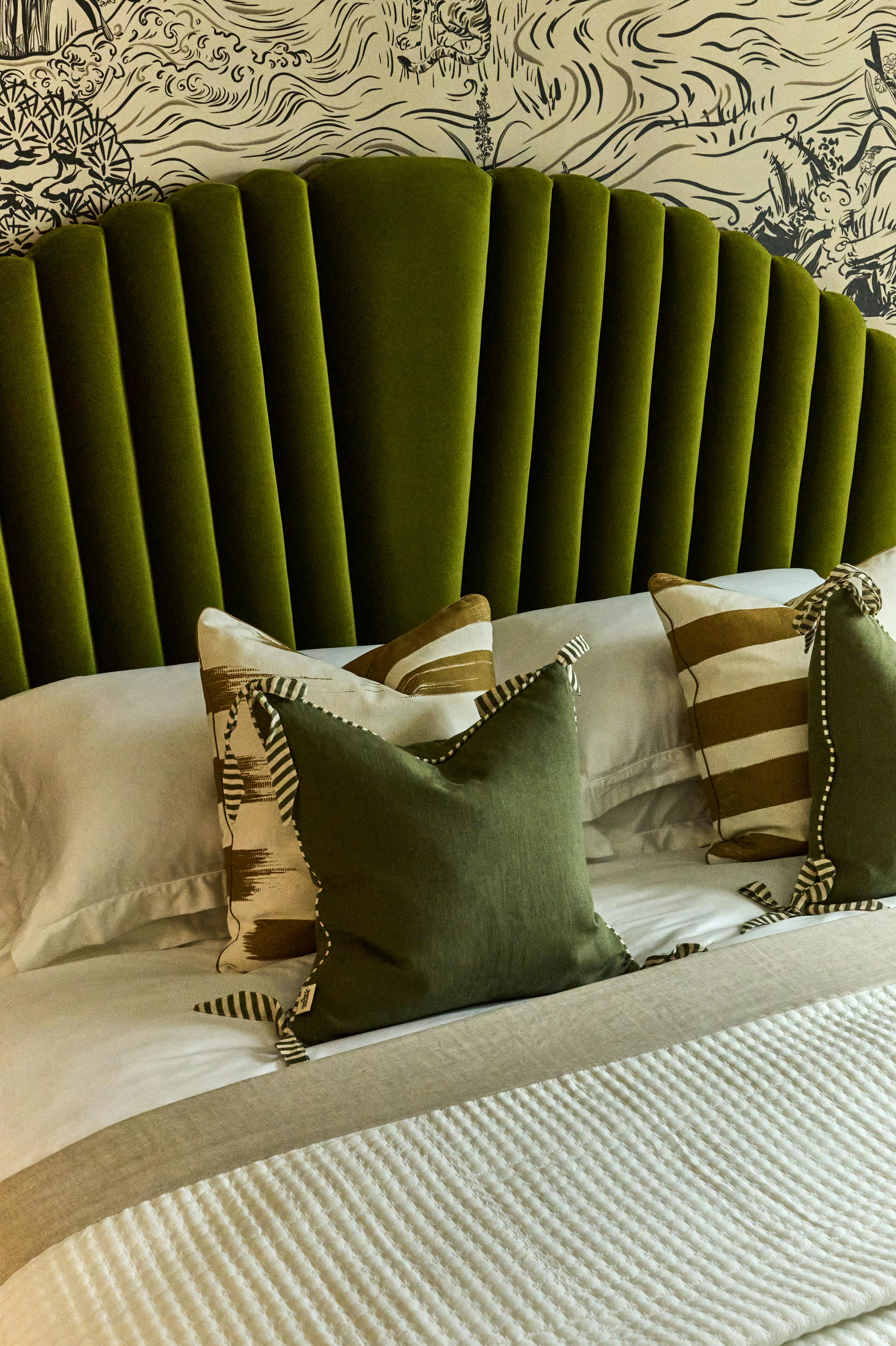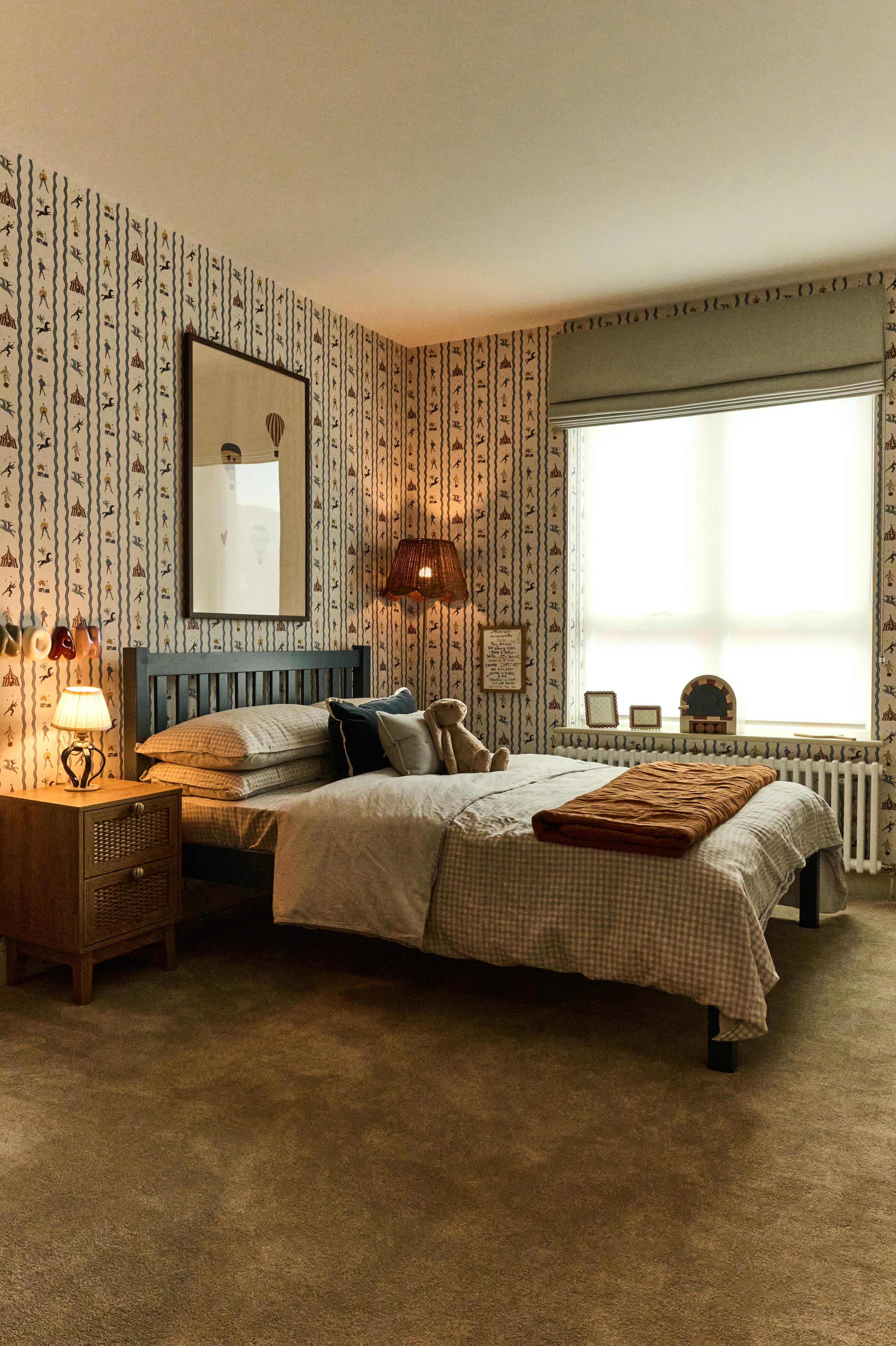 The children’s bedrooms embody the lighthearted joy of youth, with a quirky print hand designed by Queen of the Rodeo sparking a sense of curiosity and adventure, while a matte peach lamp by Hannah Simpson Studio and a Lucy Mahon print bring a touch of vintage chic.