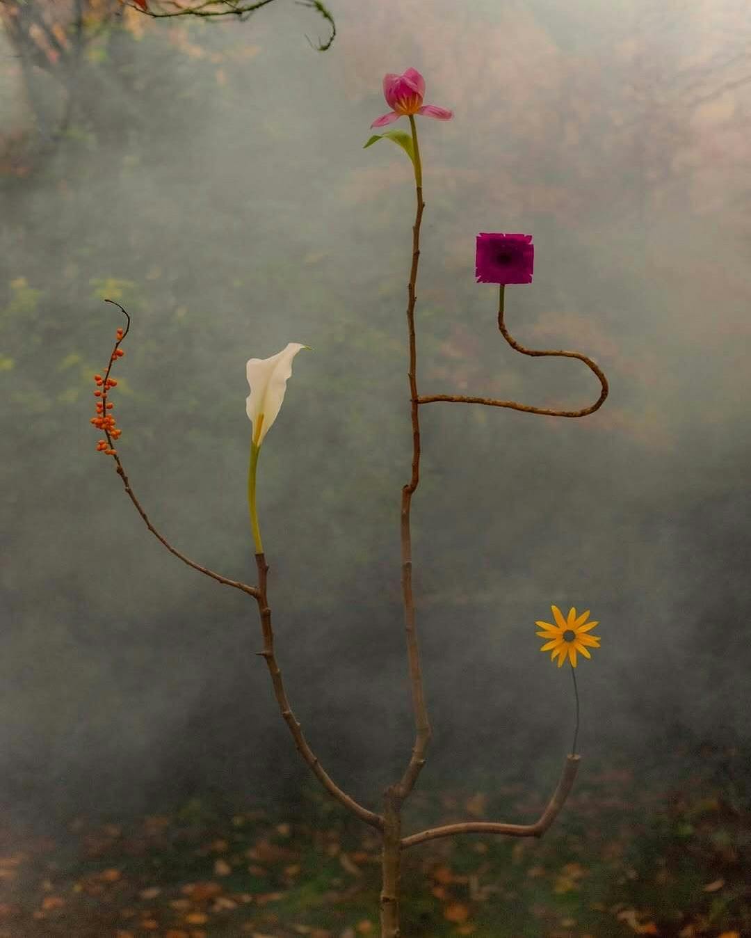 The results are beautiful, flowers fused in unexpected harmony, stems meeting in improbable unions, petals reimagined as limbs or plumage. Her floral hybrids recall the structured beauty of Karl Blossfeldt’s botanical studies and the playful subversions of Joan Fontcuberta, yet remain unmistakably her own - tender, uncanny, and alive.