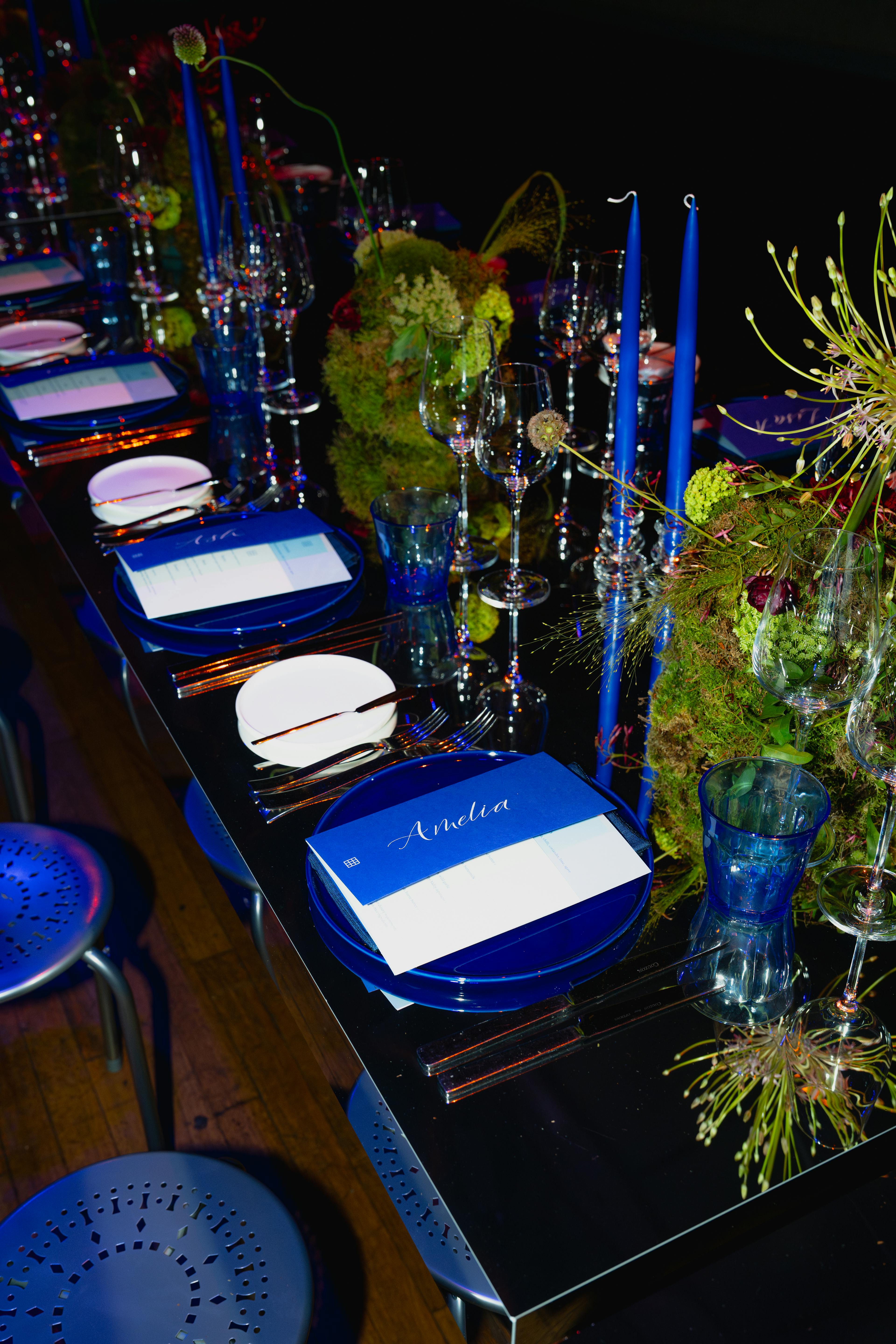 Glassette was proud to supply many of the tableware and decorative objects that shaped the evening’s atmosphere. The tables were layered with considered touches, all themed around cobalt blue - chosen to complement the rhythm of the night. Every piece was selected to enhance the mood, invite conversation, and reflect our belief that a table is more than a surface, it’s a stage for memory-making.