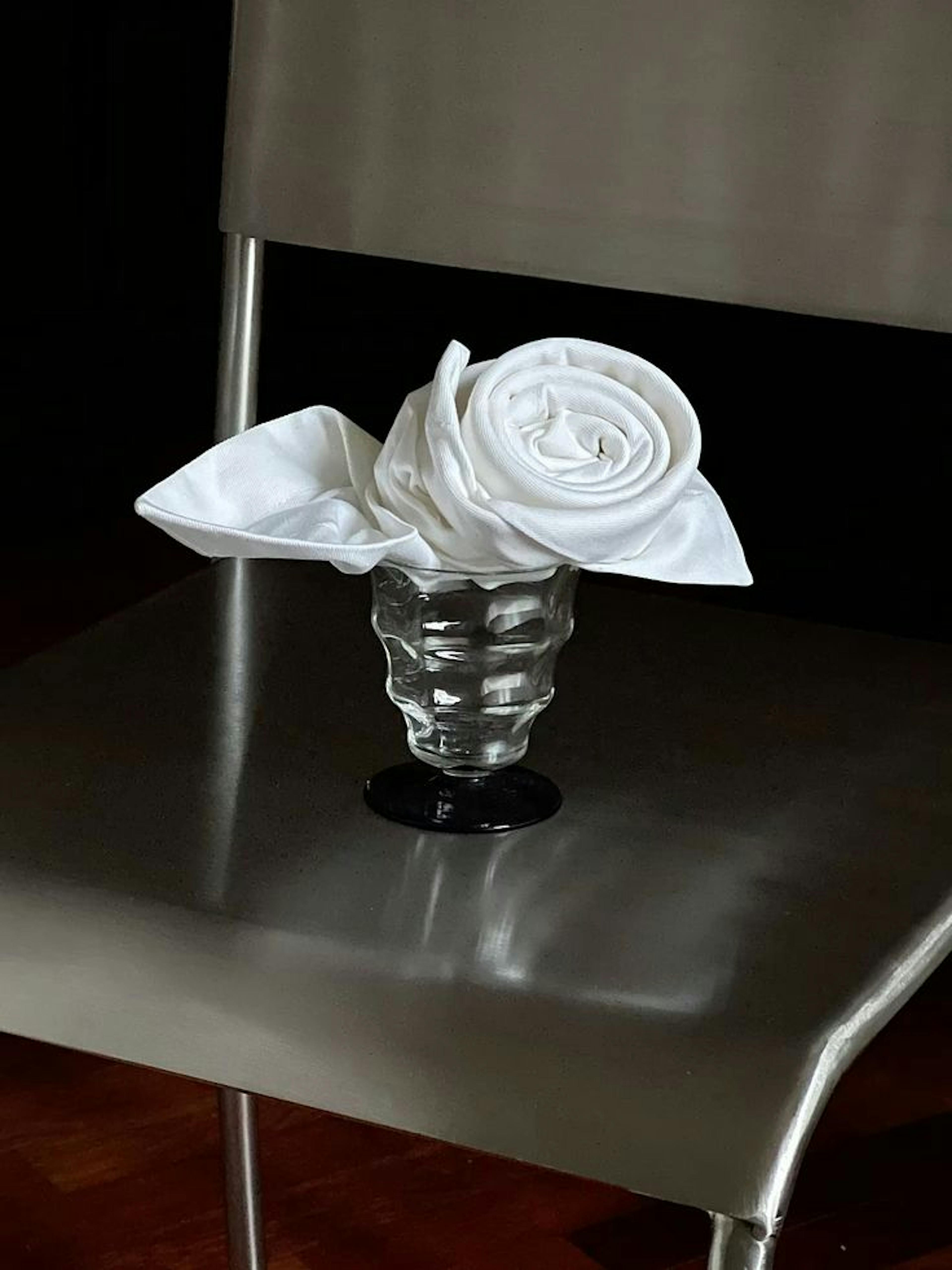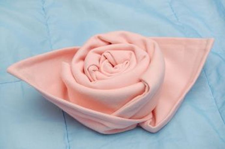 Napkin Rose Fold - Bring the garden to your table with a napkin rose. Begin with a cloth napkin and roll it tightly from corner to corner. Once you’ve created a long tube, wrap it around itself in a spiral, tucking the end beneath to secure it. Gently pull back the edges to form soft petals, and you’ll have a rose ready to grace each place setting. This fold is an easy way to add charm, romance, and a delightful surprise for your guests.