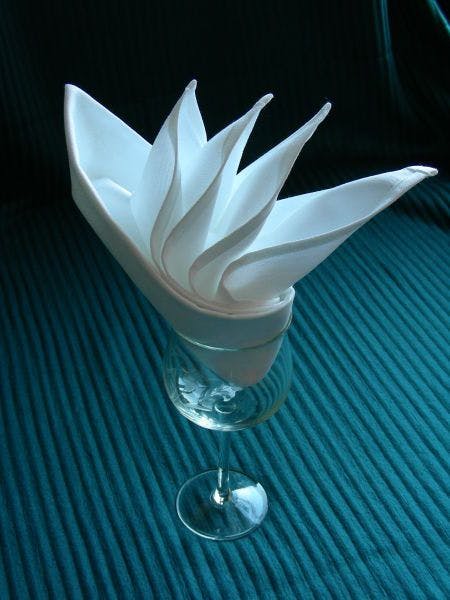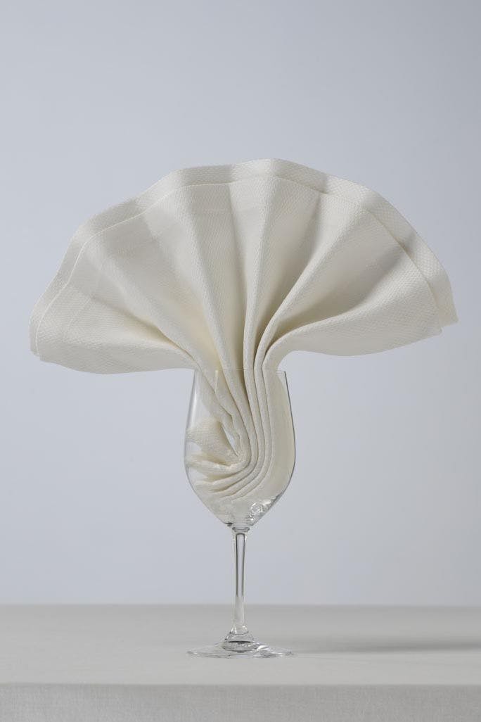 Fan Fold in a Glass - Add height and elegance to your table with a classic fan fold displayed in a glass. Start by folding your napkin into an accordion, working back and forth in even pleats. Once the entire napkin is folded, pinch the base together and slip it into a wine or water glass. The pleats will spread out at the top, creating a graceful fan effect. This presentation instantly draws the eye, adding texture and sophistication while making each place setting feel extra special.