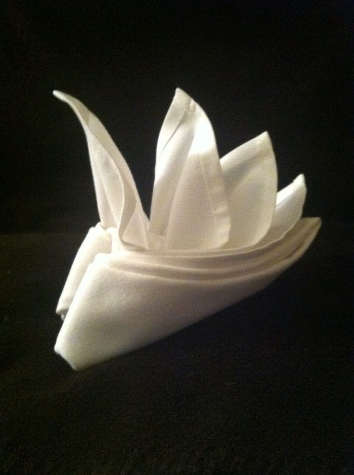 Swan Fold - Bring a sense of elegance to your table with a graceful swan napkin. Begin by folding a square napkin in half to form a triangle, then roll the two outer points inward until they meet in the centre. Fold the shape in half lengthwise and gently curve one end upward to form the neck and head. The remaining section fans out naturally into the body and tail. This fold creates a striking centerpiece for each plate, adding charm and a touch of artistry to your setting.