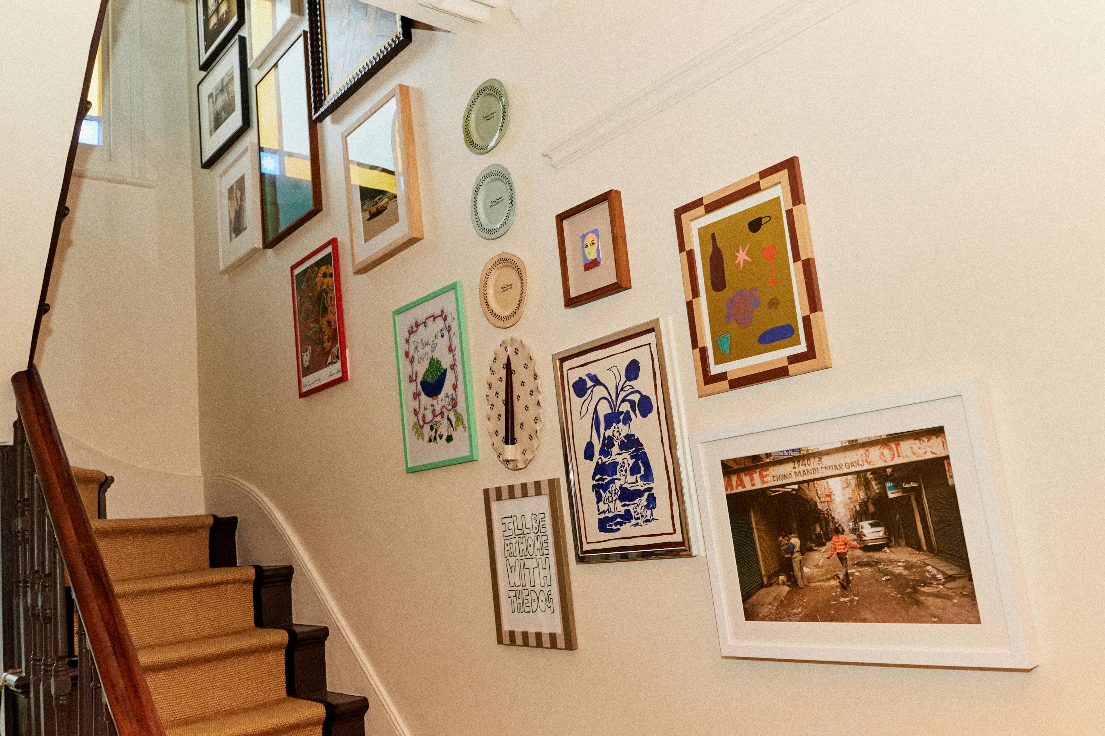 Plates. Woven pieces. A sconce. A framed textile. Small paintings. A gallery wall works harder when you mix flat art with things that have dimension. The contrast is what makes it feel collected rather than curated.