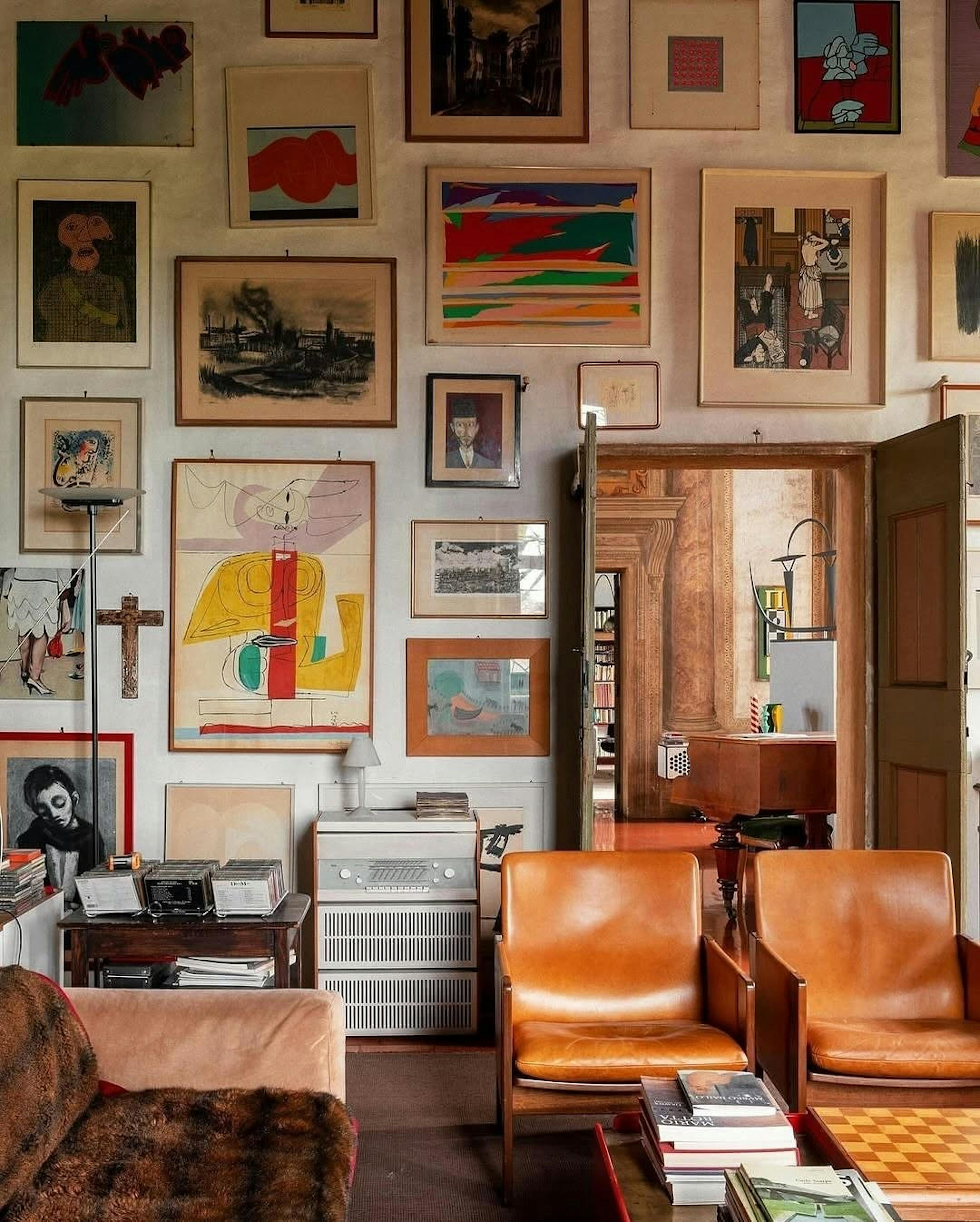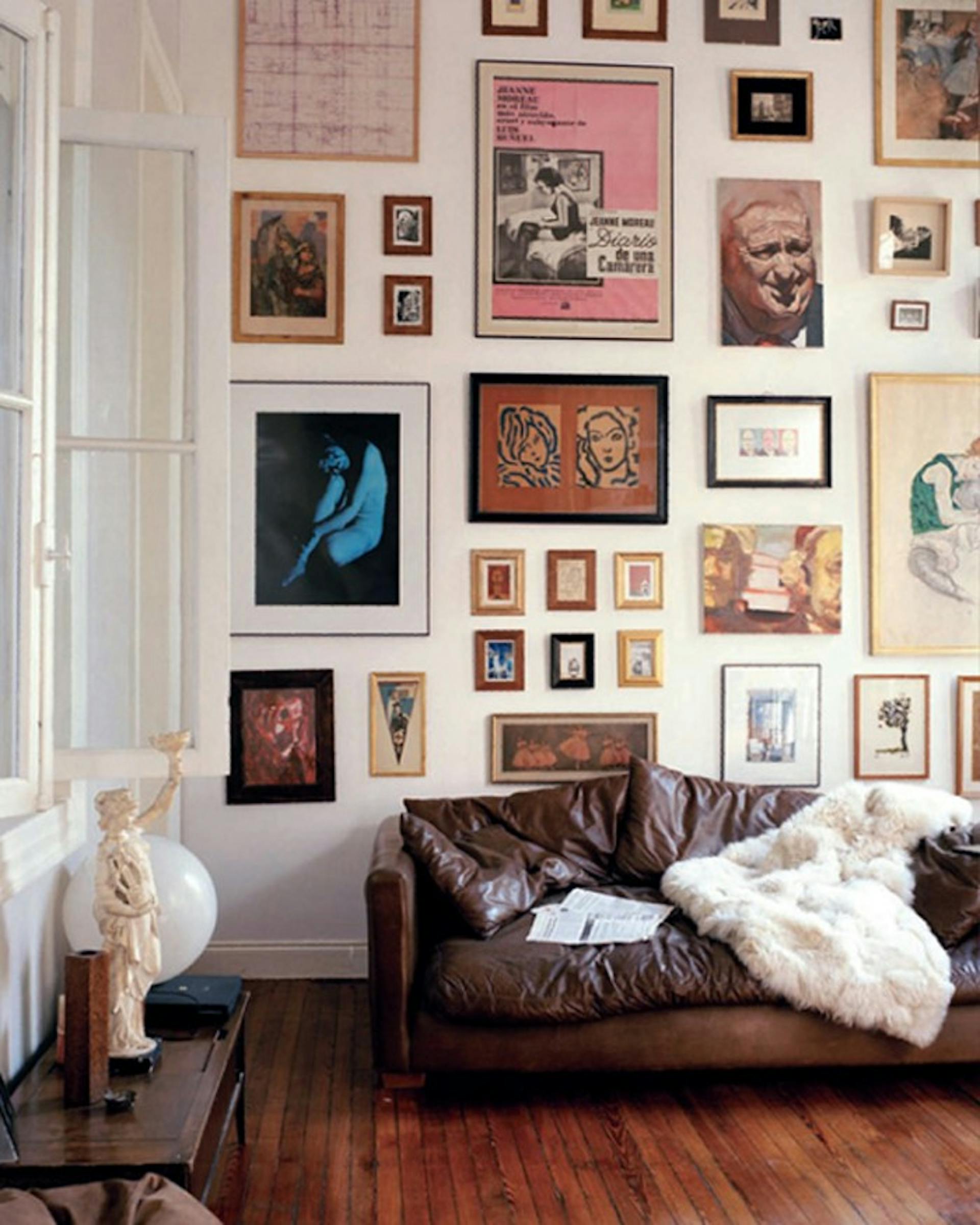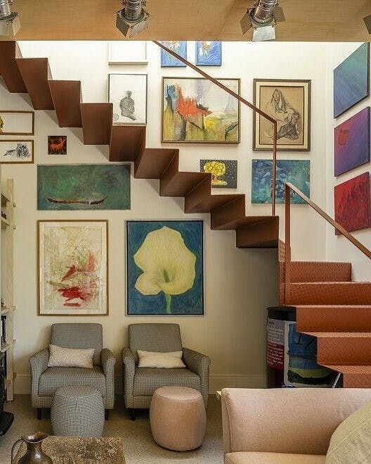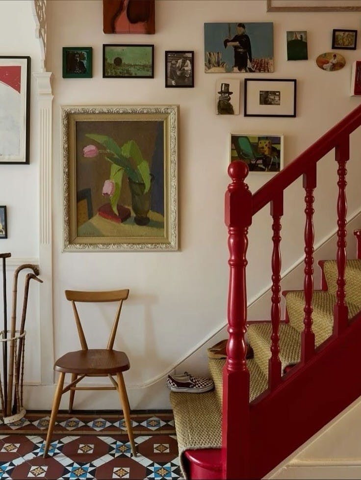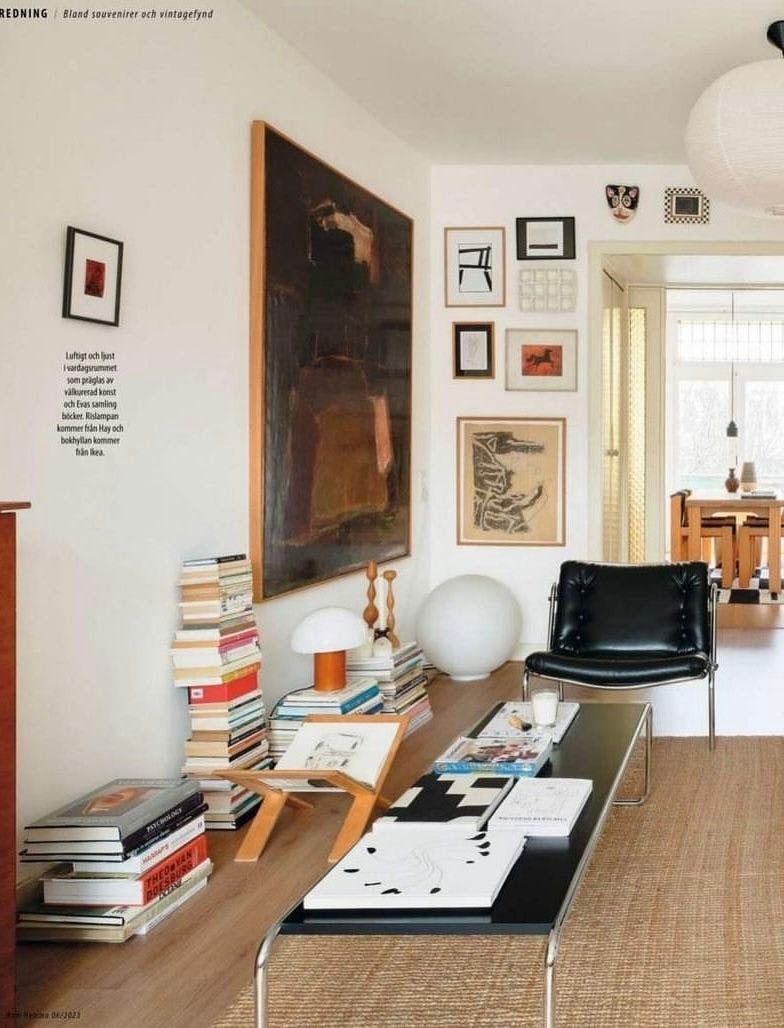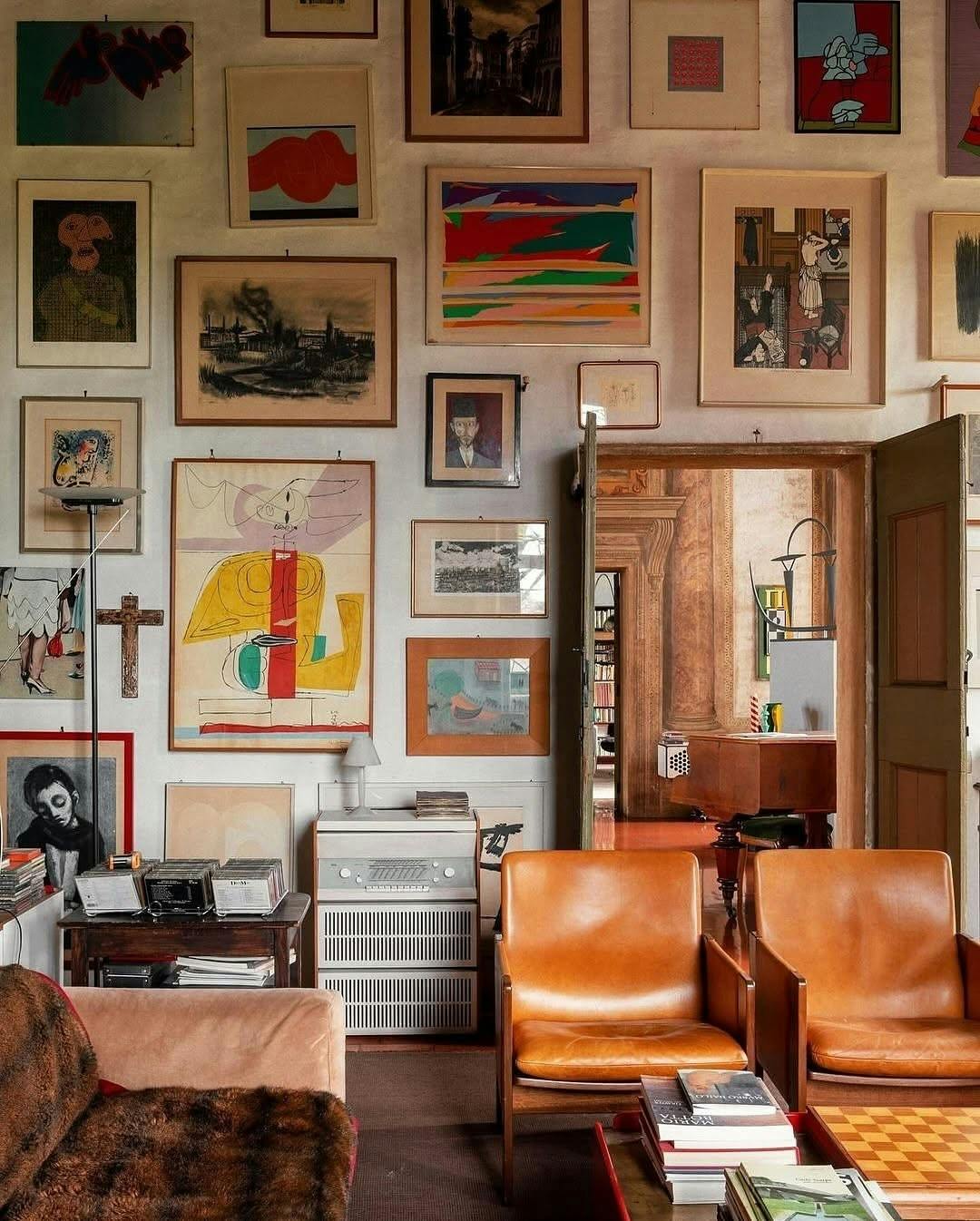 Same spacing, different sizes. Photography next to illustration next to something typographic, a vintage find, maybe a mirror or a small sculptural piece that breaks the pattern just enough. Structured without being rigid. The one unexpected piece is usually what people comment on.