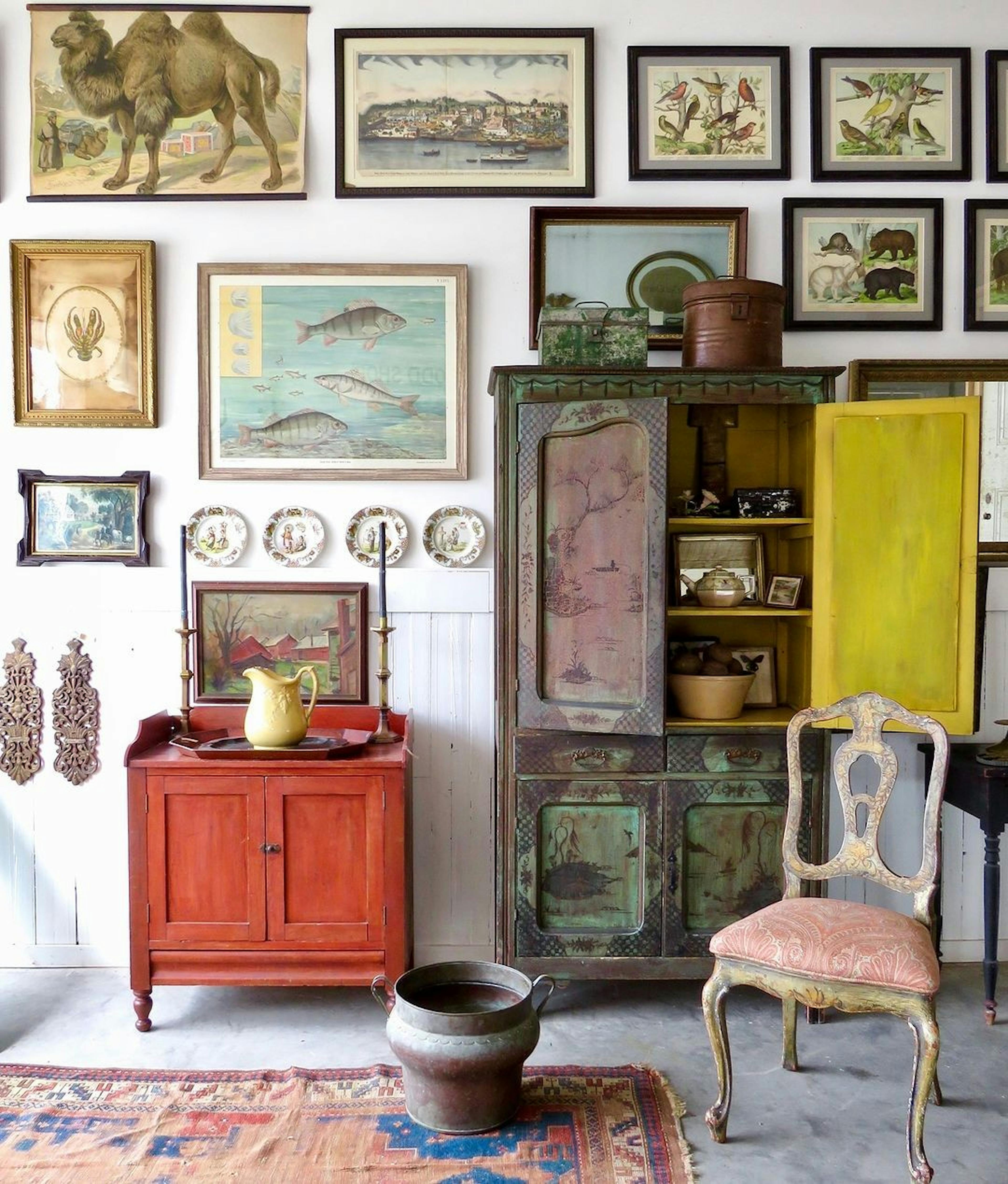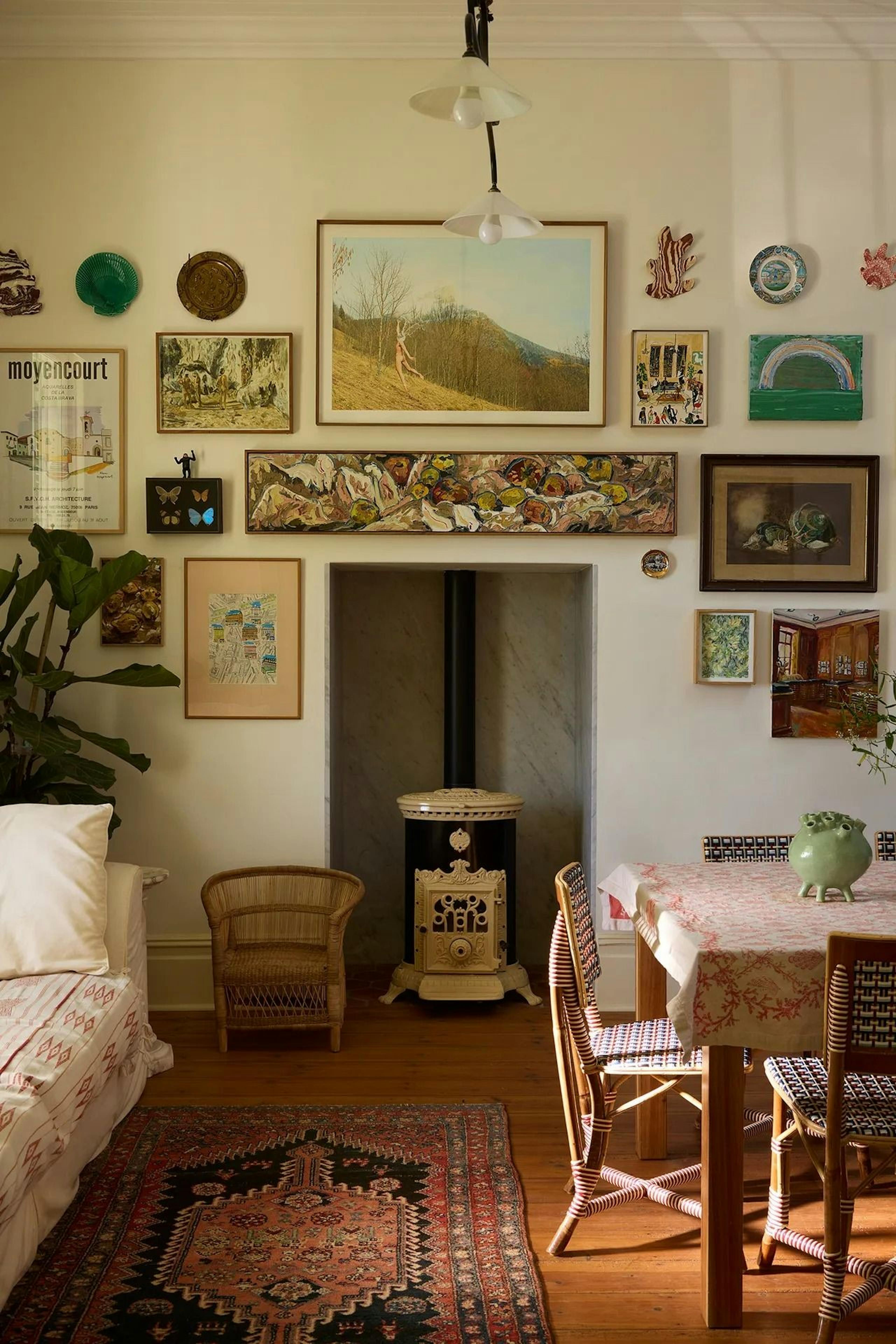 One colour family. Layered, not matching. Let terracotta shift from dusty to burnt, or butter yellow go soft then warm across prints, a vintage poster, something painted, maybe a fabric scrap you liked too much to throw away. Frames in wood, brass, lacquer. Mixed, never uniform. When it starts feeling too considered, a wall light or small shelf breaks it up.