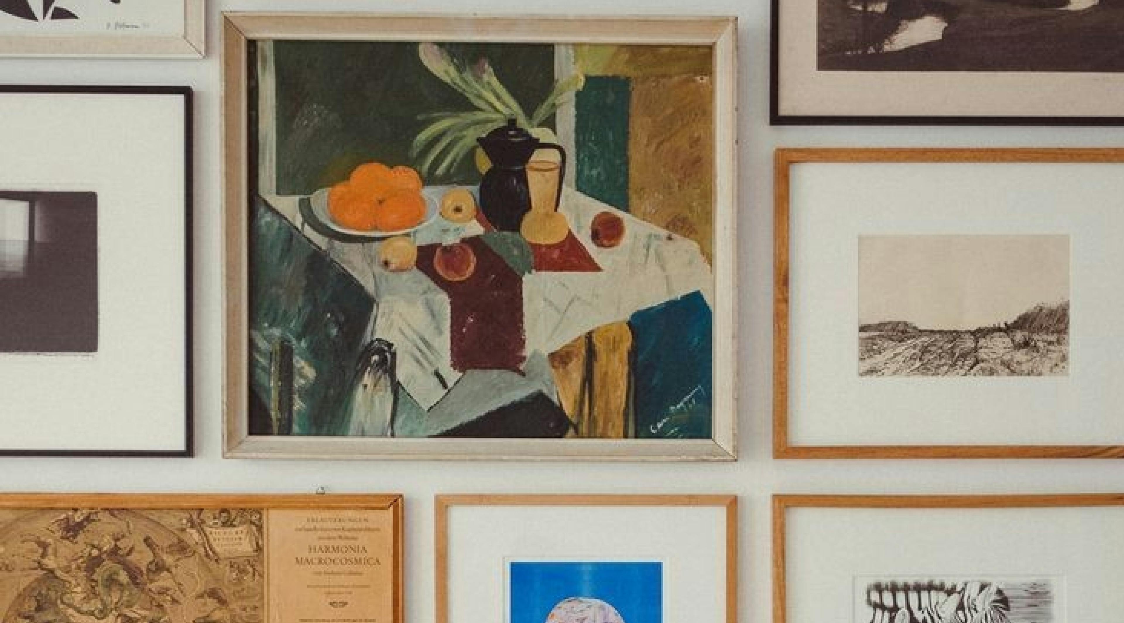 One large piece, slightly off-centre. Everything else builds around it. Smaller works, sketches, a photograph or two. Leave space. The oversized anchor is what stops a gallery wall from looking like you just filled a wall, and starts making it look like you meant it.