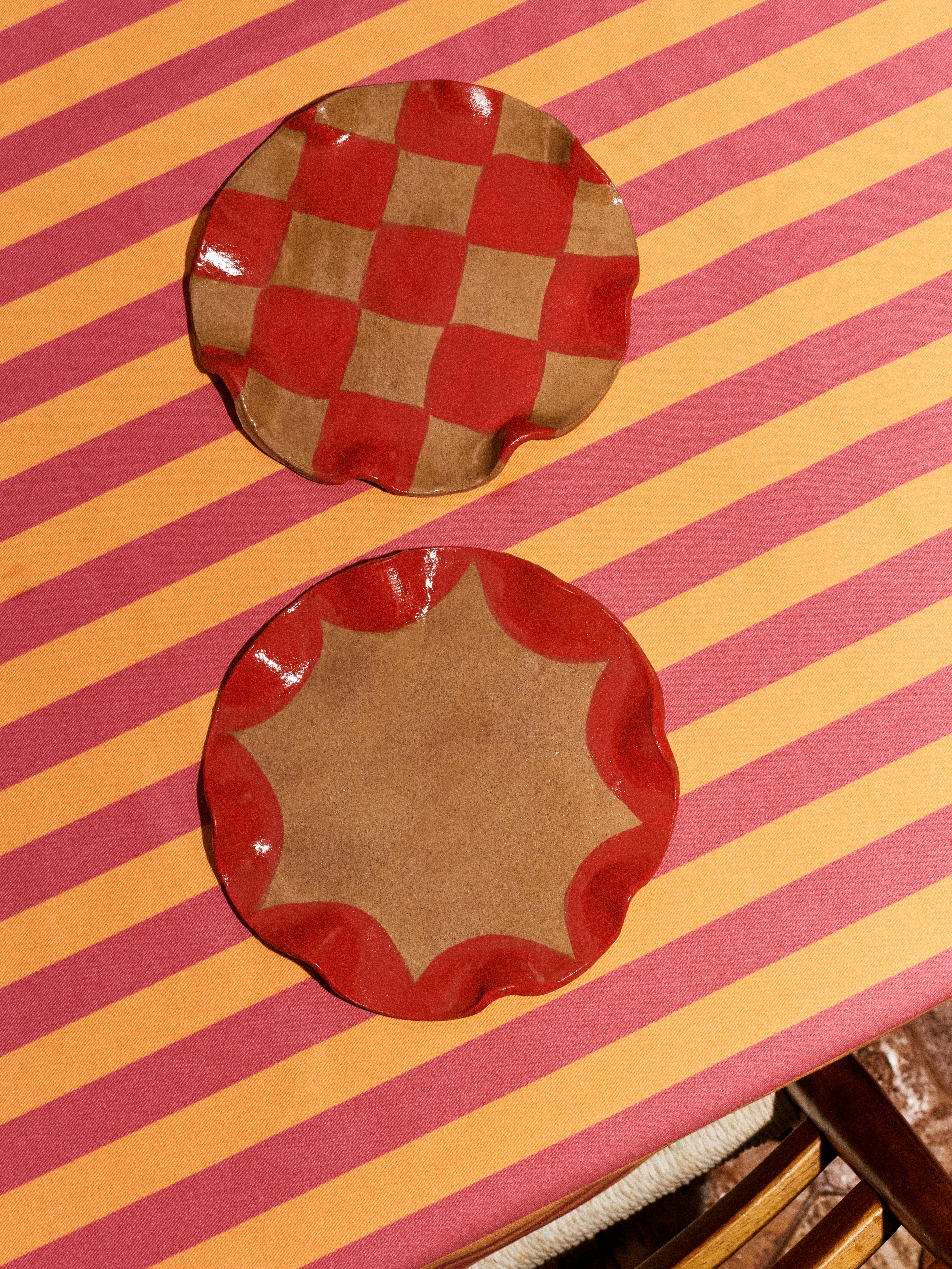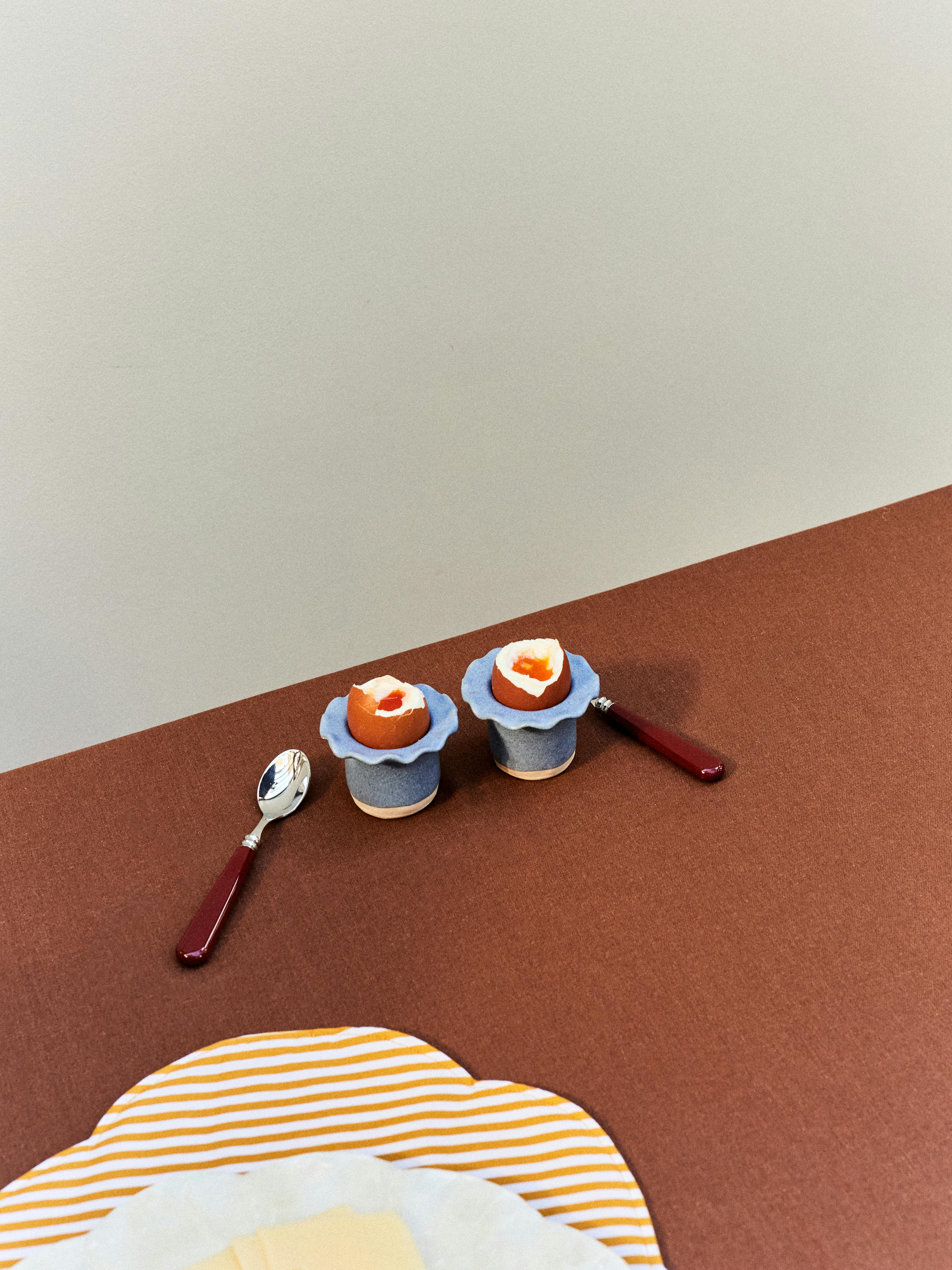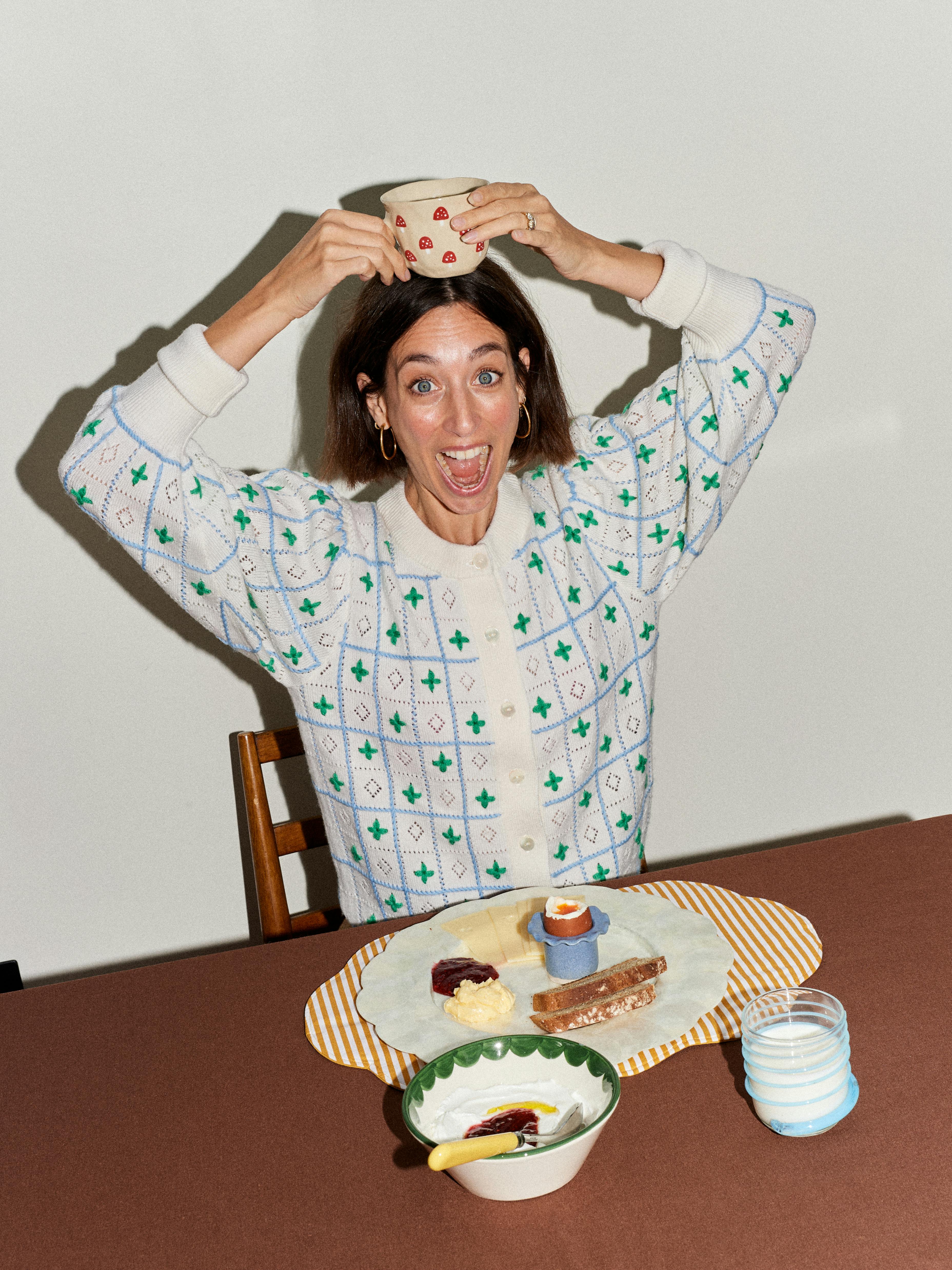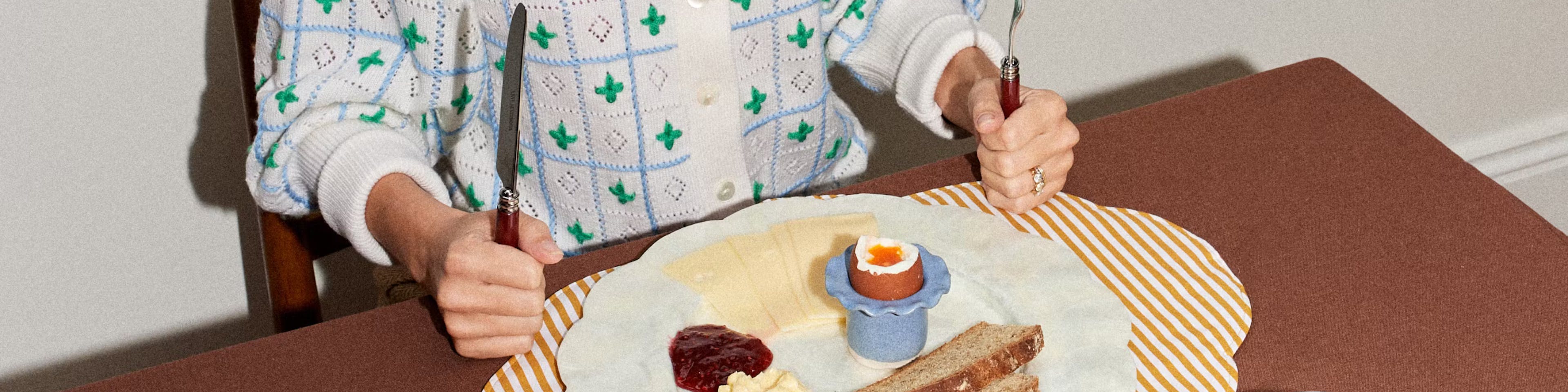 A breakfast scene captured at Laura's home in London. We wanted to celebrate our favourite ritual of the day with an edit of products that felt cinematic and of another time. Featuring a mocha brown tablecloth by Same Time Tomorrow, croissant placemats by L'amour des Bonbons, a shell-like charger plates by Truffle Tablescapes, the sweetest mushroom mug by Yamine, a swirling blue glass by Blow, a scalloped green bowl by Late Afternoon Home and a chequerboard painted plate by L'amour des Bonbons.