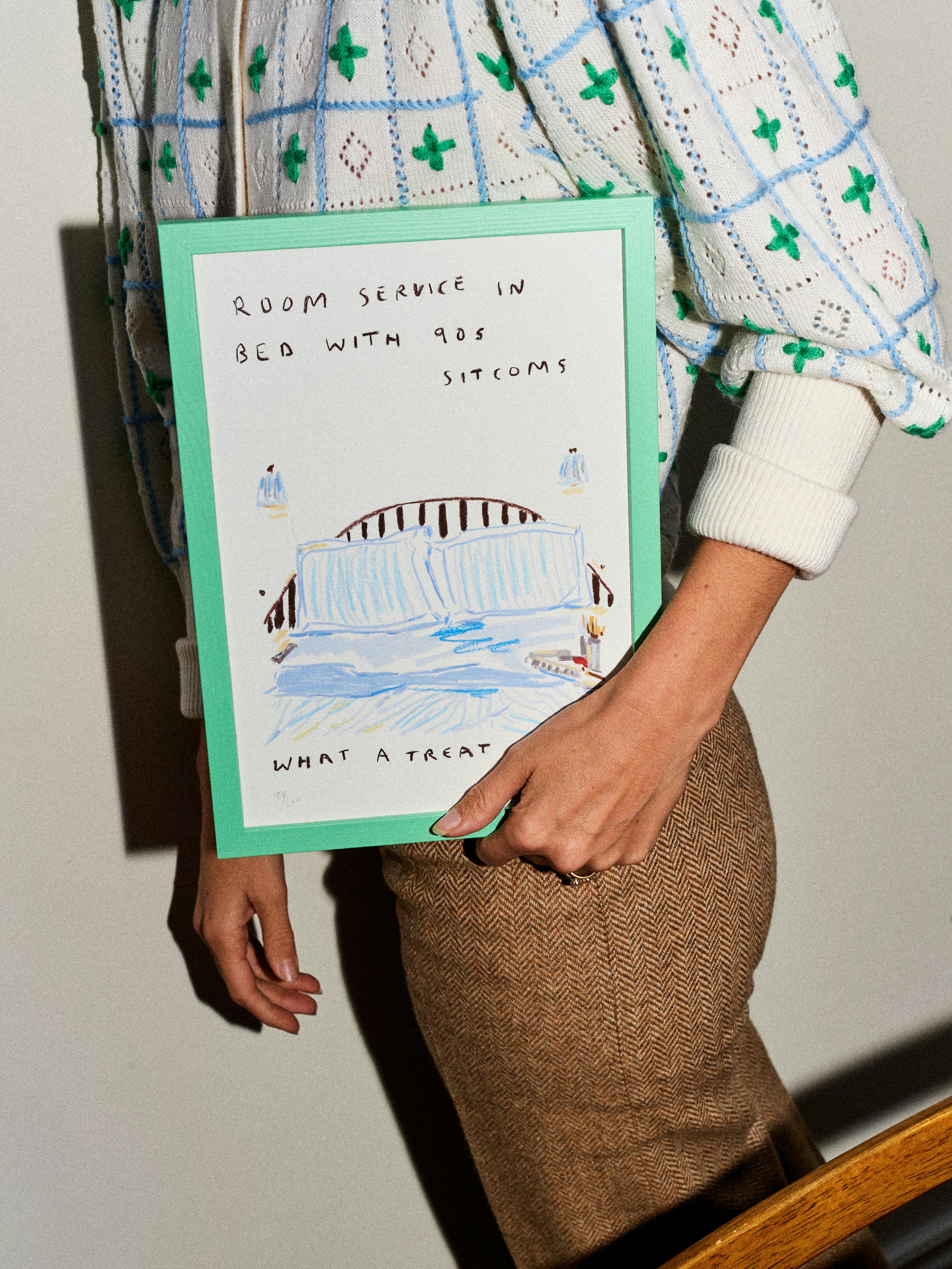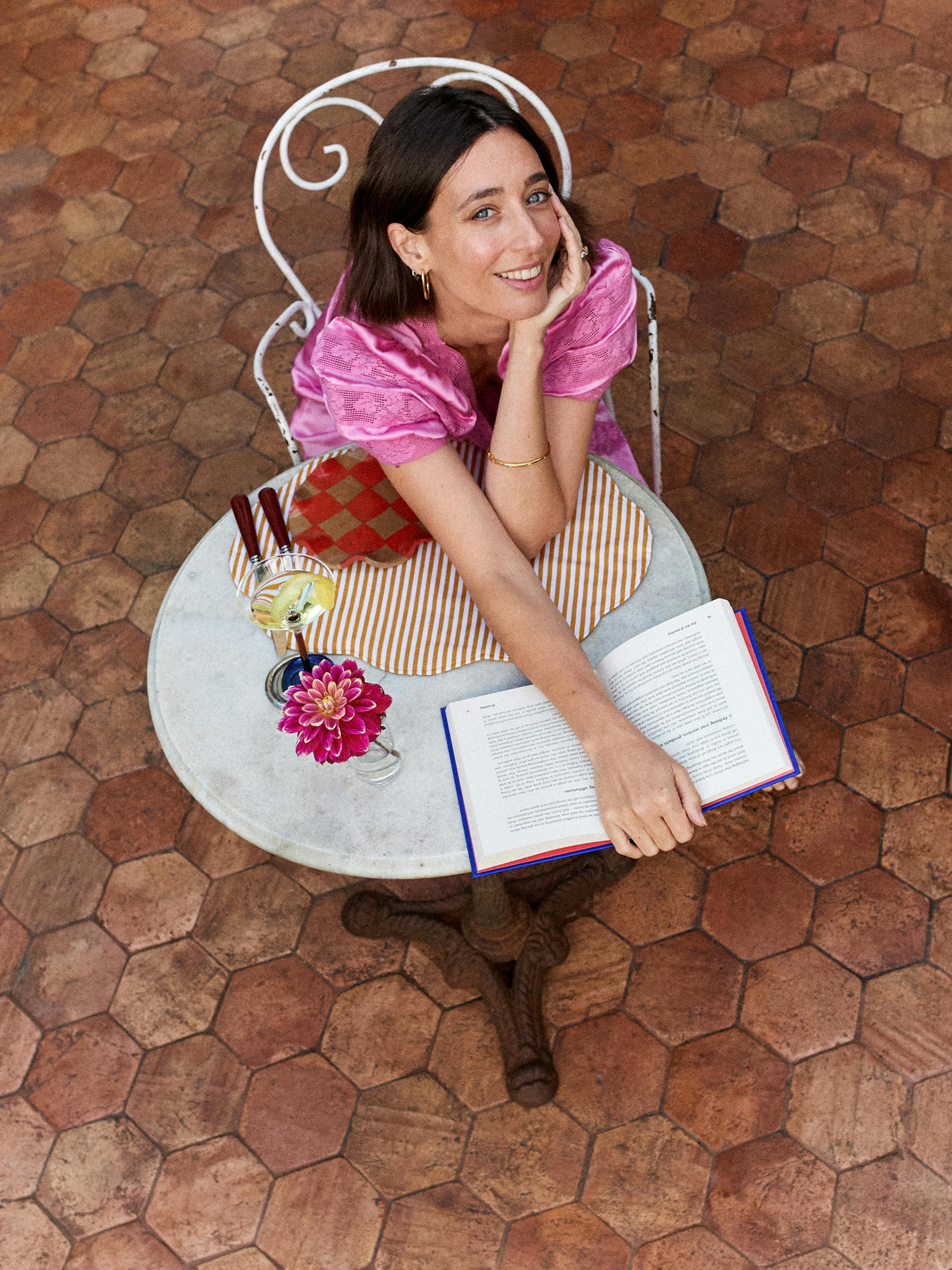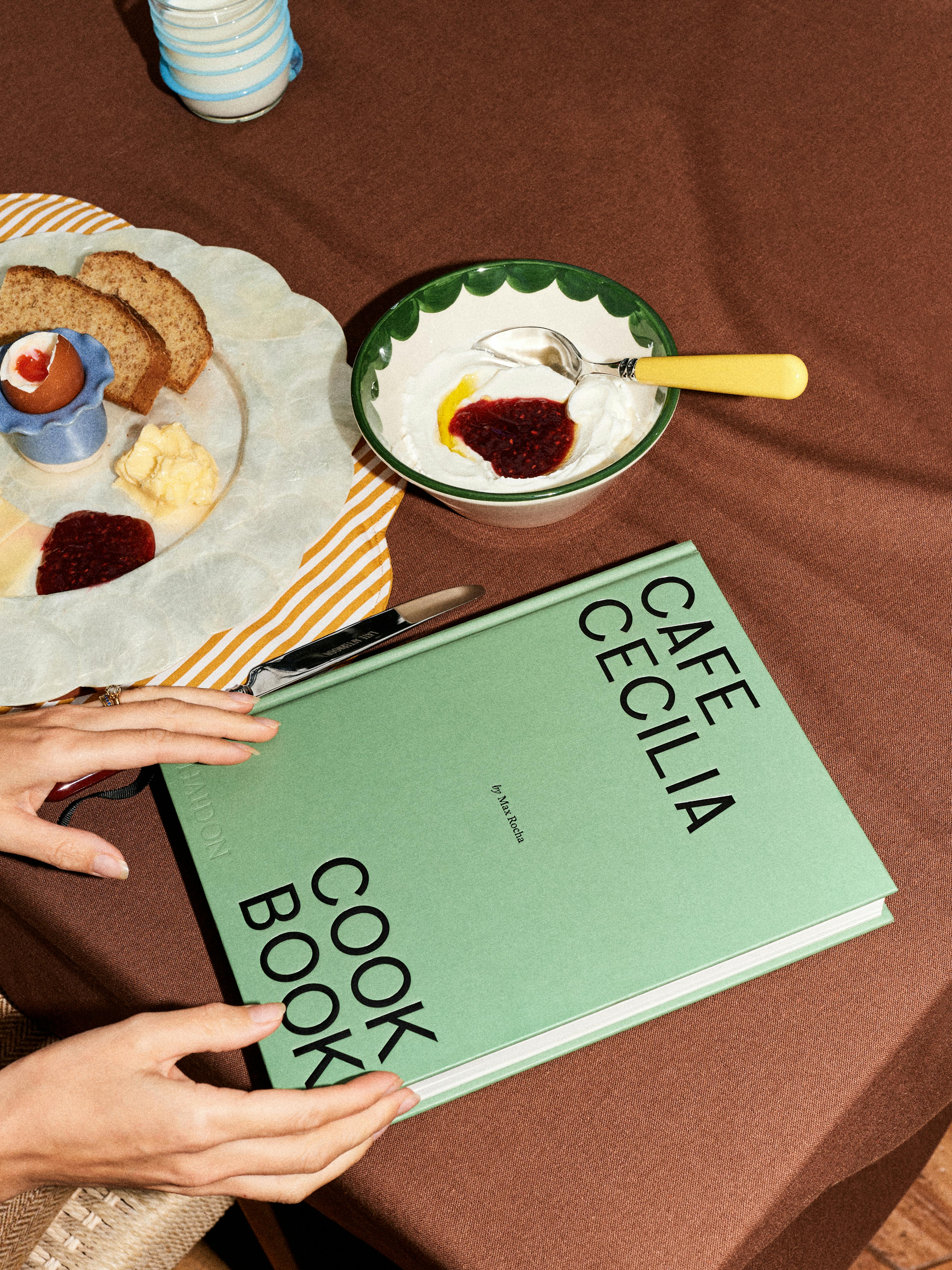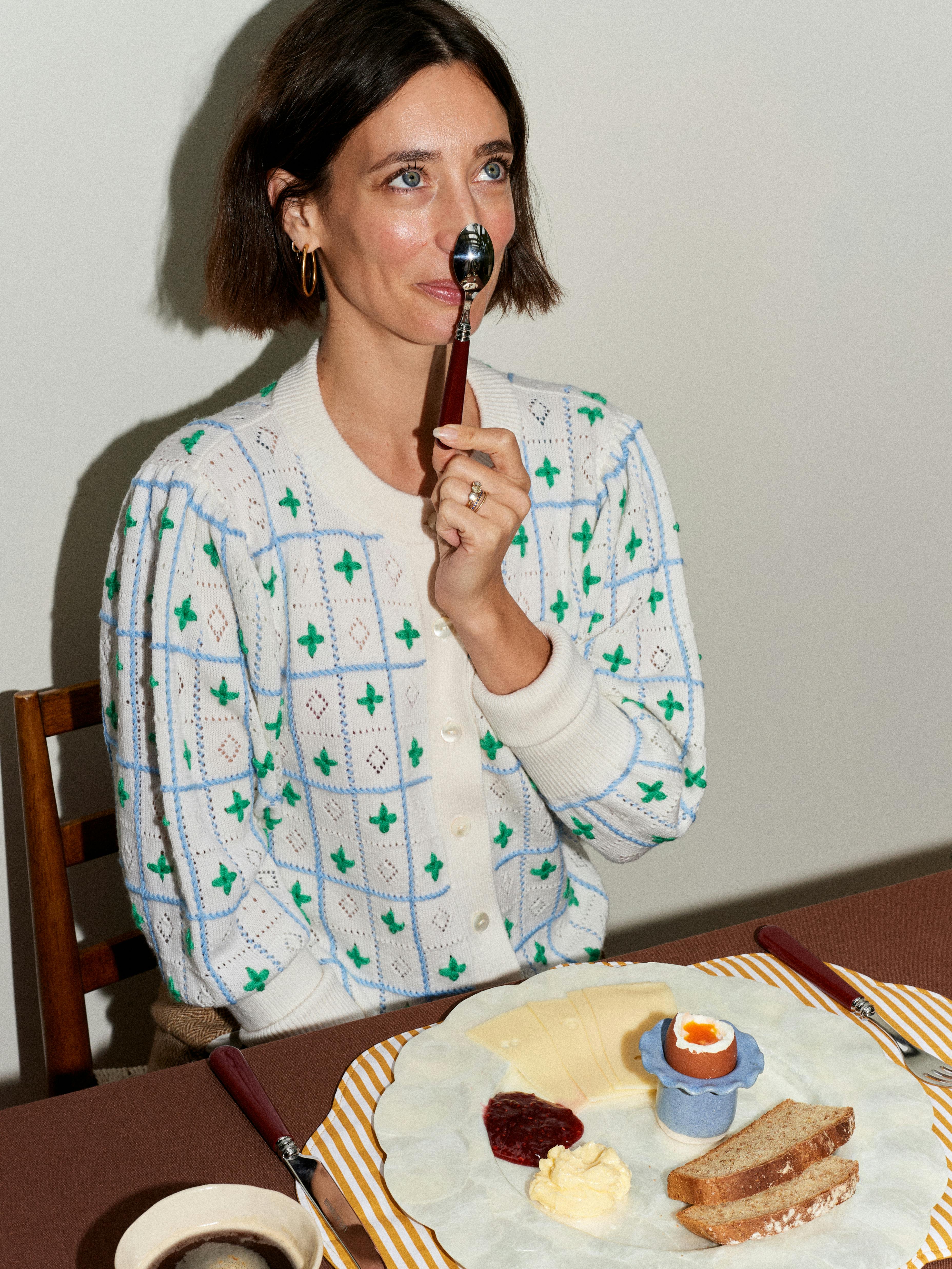 Laura is wearing a cardigan by Shrimps and is reading the Cafe Cecilia Cookbook, available to buy now on Glassette - the perfect gift for foodies in your life.