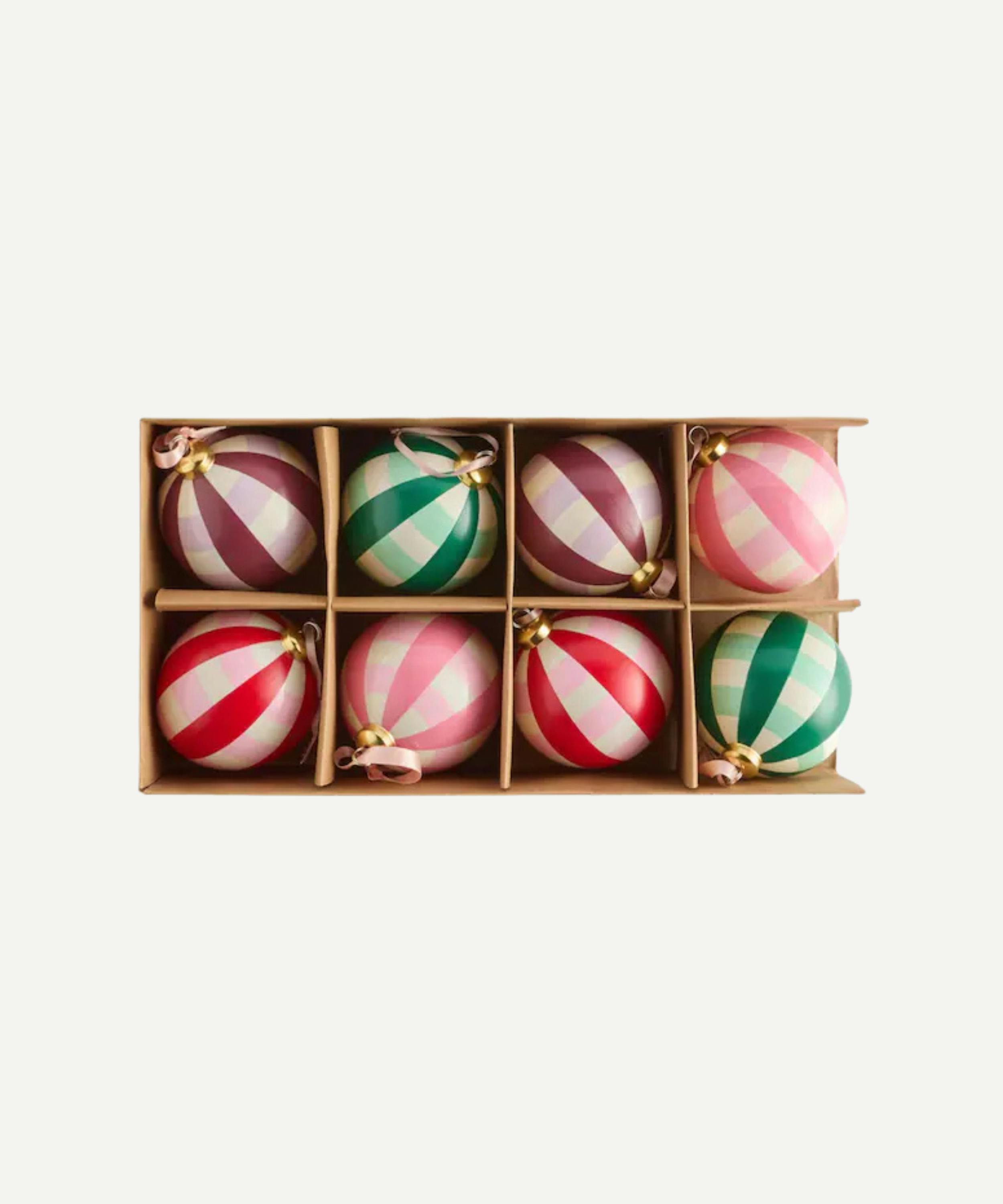 Ribbons, bows and stripes bring a playful twist to festive decorating. The Check Christmas Baubles and Bright Stripey Bow Christmas Baubles add pattern, colour and cheer - wrapping the season in bright detail and bringing a sense of celebration to both tree and table.