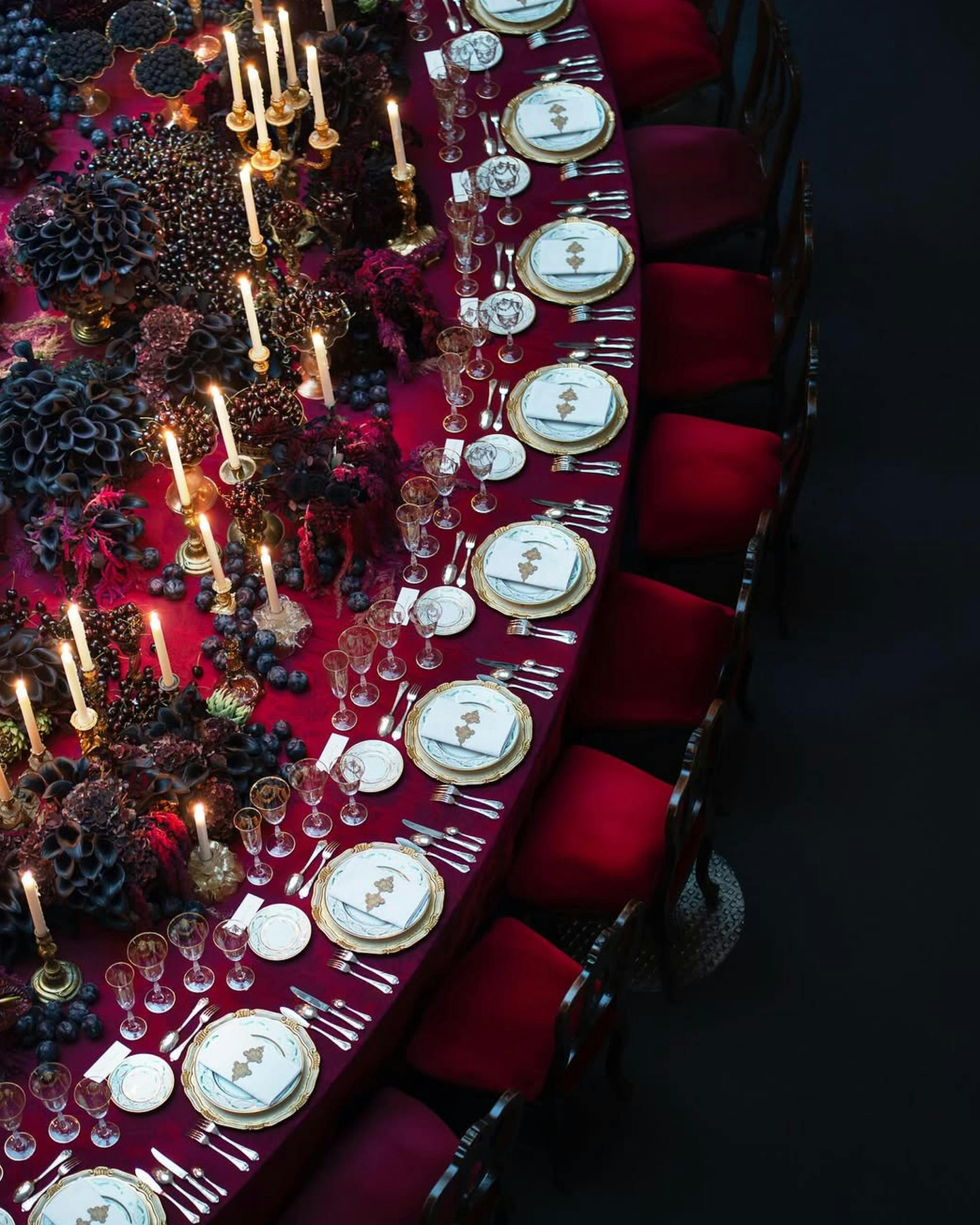 The event took place inside Palazzo Grassi, where Tadao Ando’s modernist design intersects with the Baroque palace. In collaboration with Bureau Betak, Saint Laurent arranged a fuchsia-hued tablescape: jewel-toned flowers and fruit spread across round crimson tables, set with white china, glass goblets, and platinum candlesticks. Here’s how we’d recreate the tablescape!