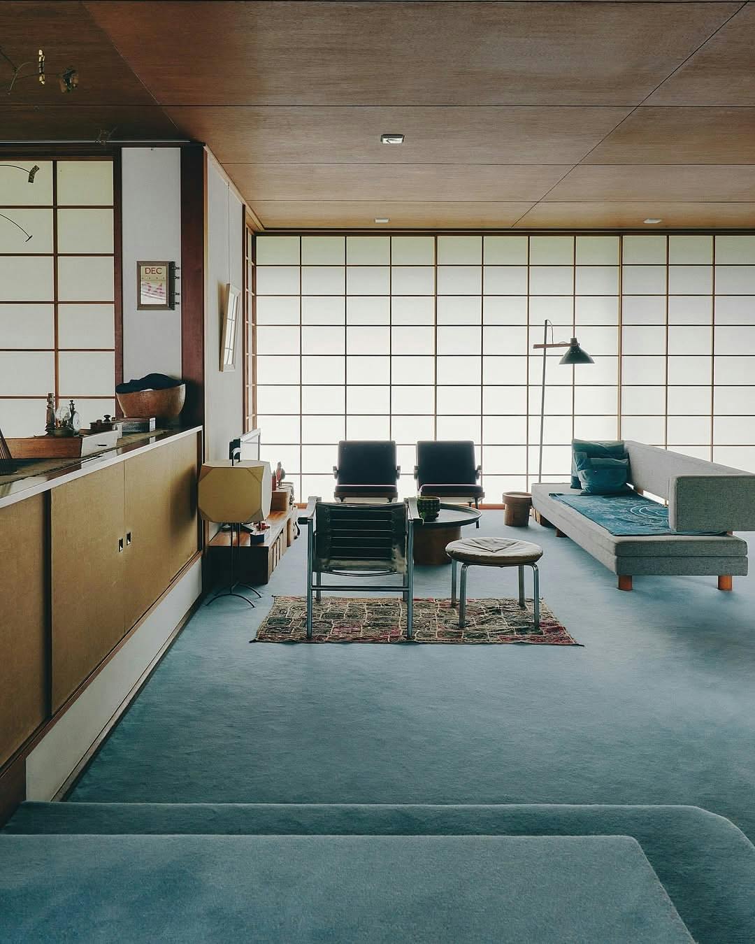 In 1967, architect Junzo Yoshimura designed the Shonan-Chigasaki House - a quiet landmark of Japanese modernism, where clean lines and soft light frame views of the sea. Nearly sixty years on, its spirit lives on in a sky-blue carpet, originally custom-made for the home and recently revived by @yamagatadantsu from the archives.