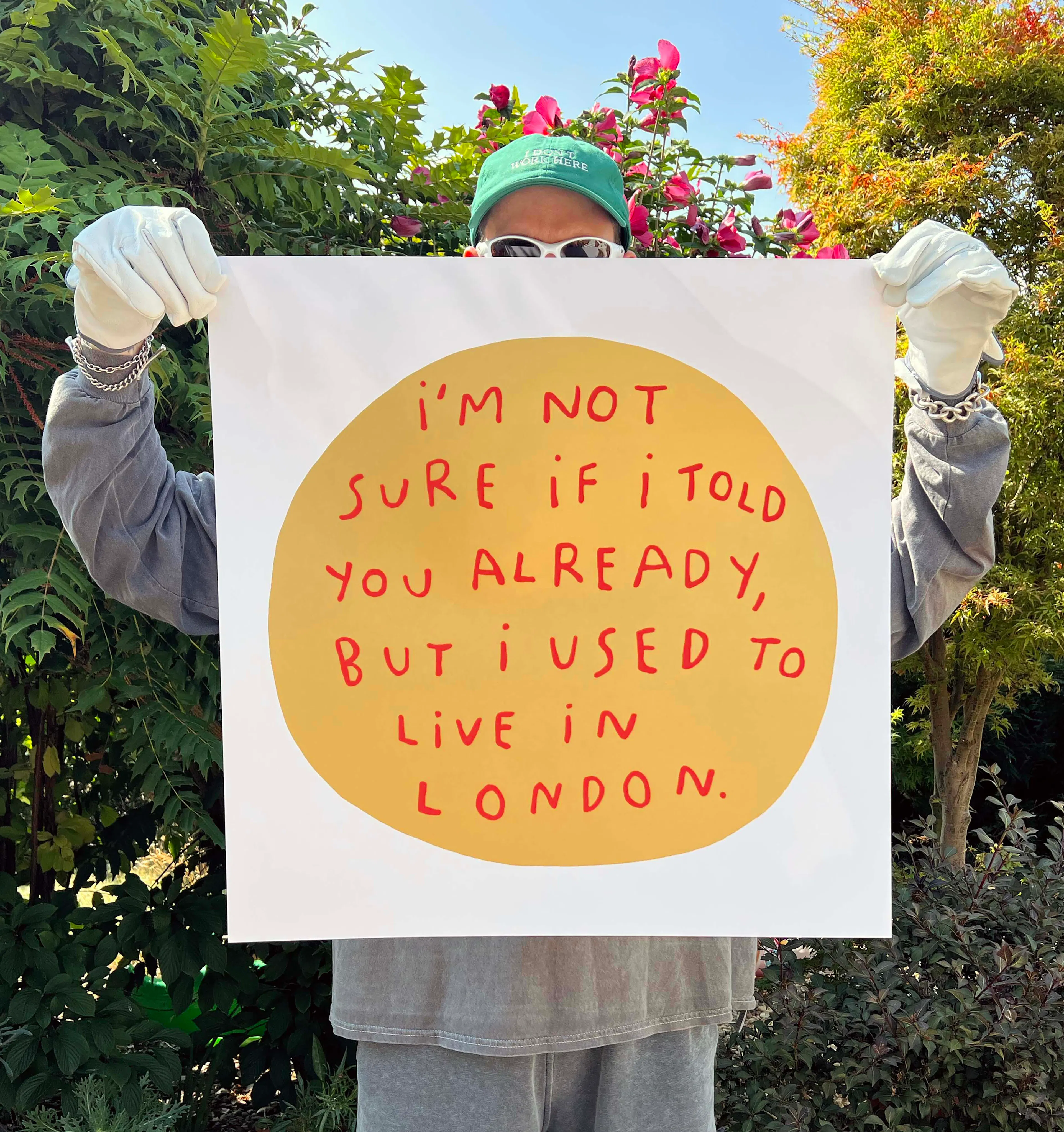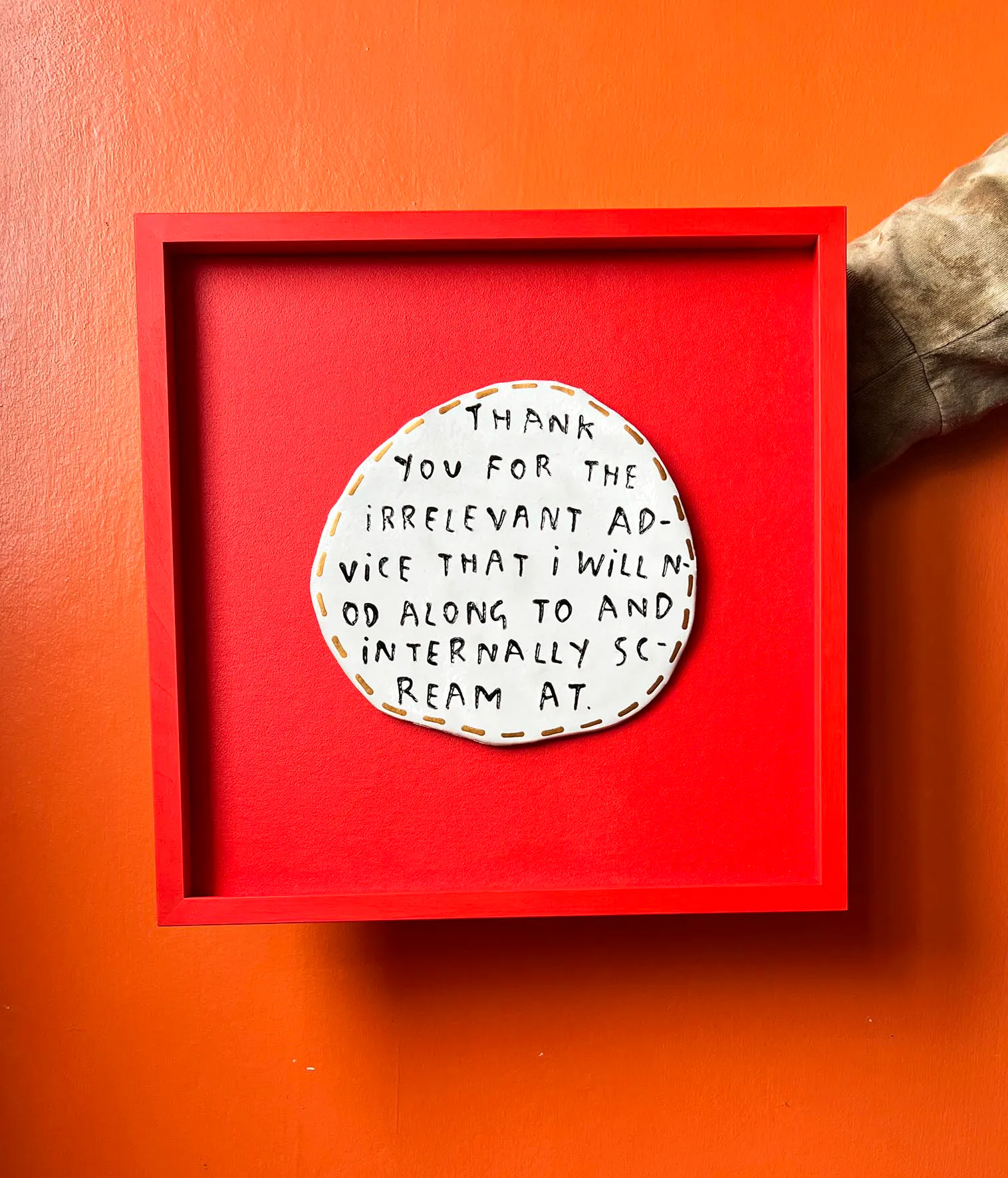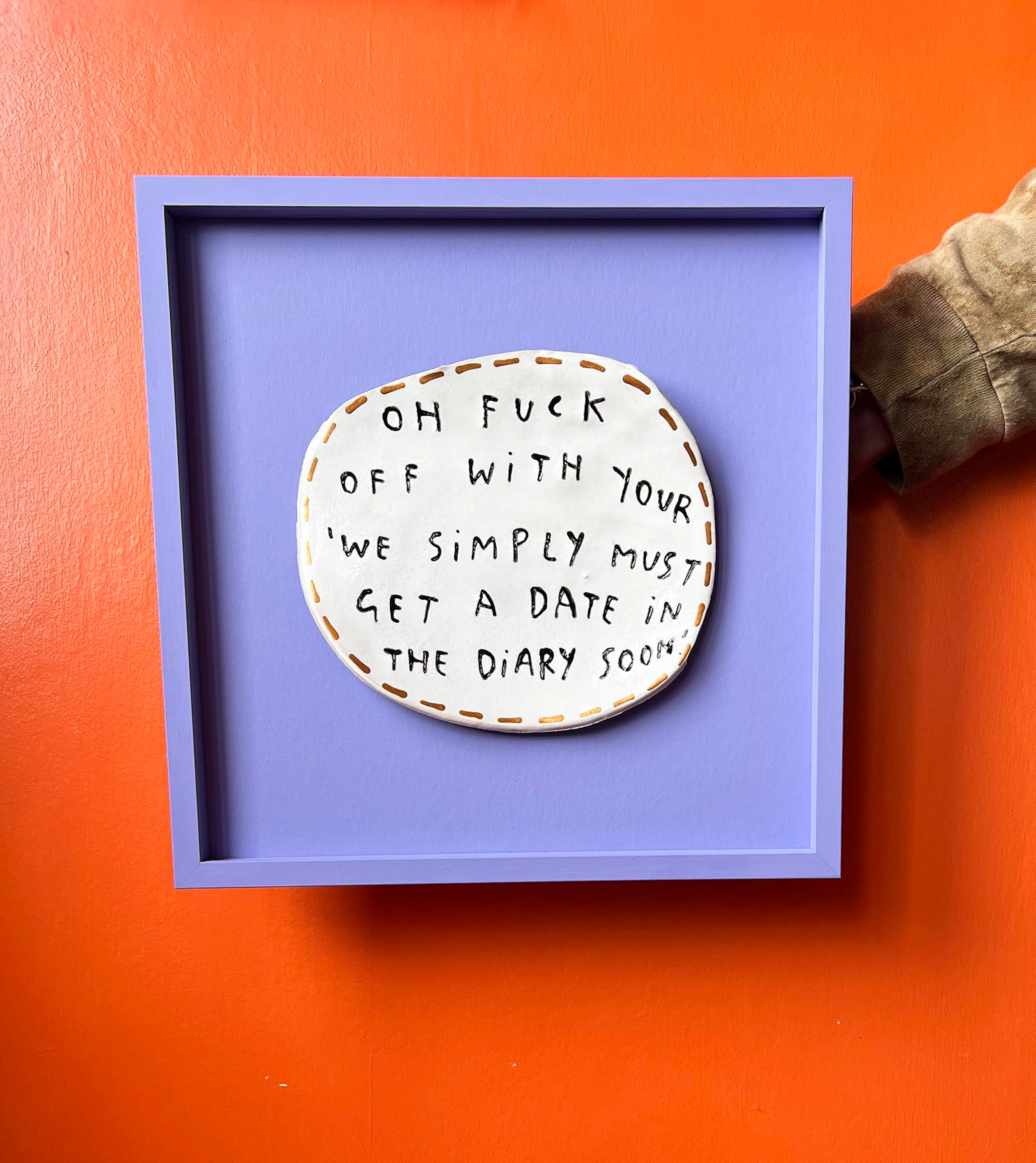 It's intentional, it's like the way that I work with ceramics, like it all starts with a slab of clay cut out, not too much strict thought about the shape but obviously a roundish shape. And then I'll scratch in the text so then the text helps form the actual piece, and then there’s more decorative elements, like the glaze, text colour and edge finishes. With the screen prints, its a bit different, I wanted to elevate them as with it being a larger piece, I felt it needed something extra, for example for the London print, a tasty gold glitzy background, so it's not just a straight replica of the hate plates. With using that larger scale, I felt they would benefit from being more brilliantly bold and eye-catching. So, yeah, I also wanted the gold shape to mimic the shape of an original hate plate, and then the text to fill in that with different colours, so that one is more attention seeking.