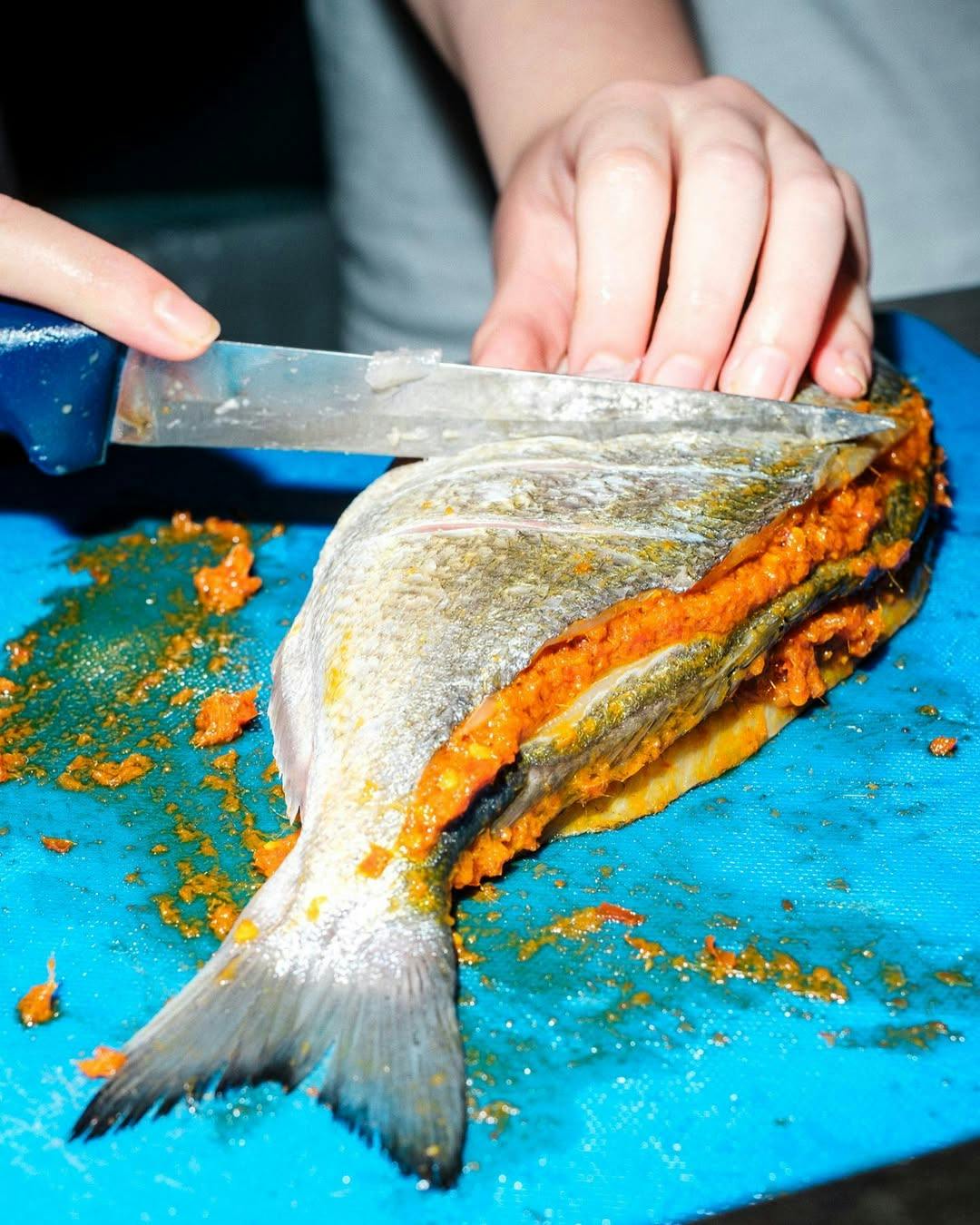 Step 3. Slice down both sides of the back bone of the bream, to make two pockets. Careful not to get to the stomach, you want that side sealed. Salt both sides of the fish, leave for 10 minutes, before stuffing both pockets generously with the sambal tumis made earlier. Try not to fill it to the brim, leaving 1cm off.