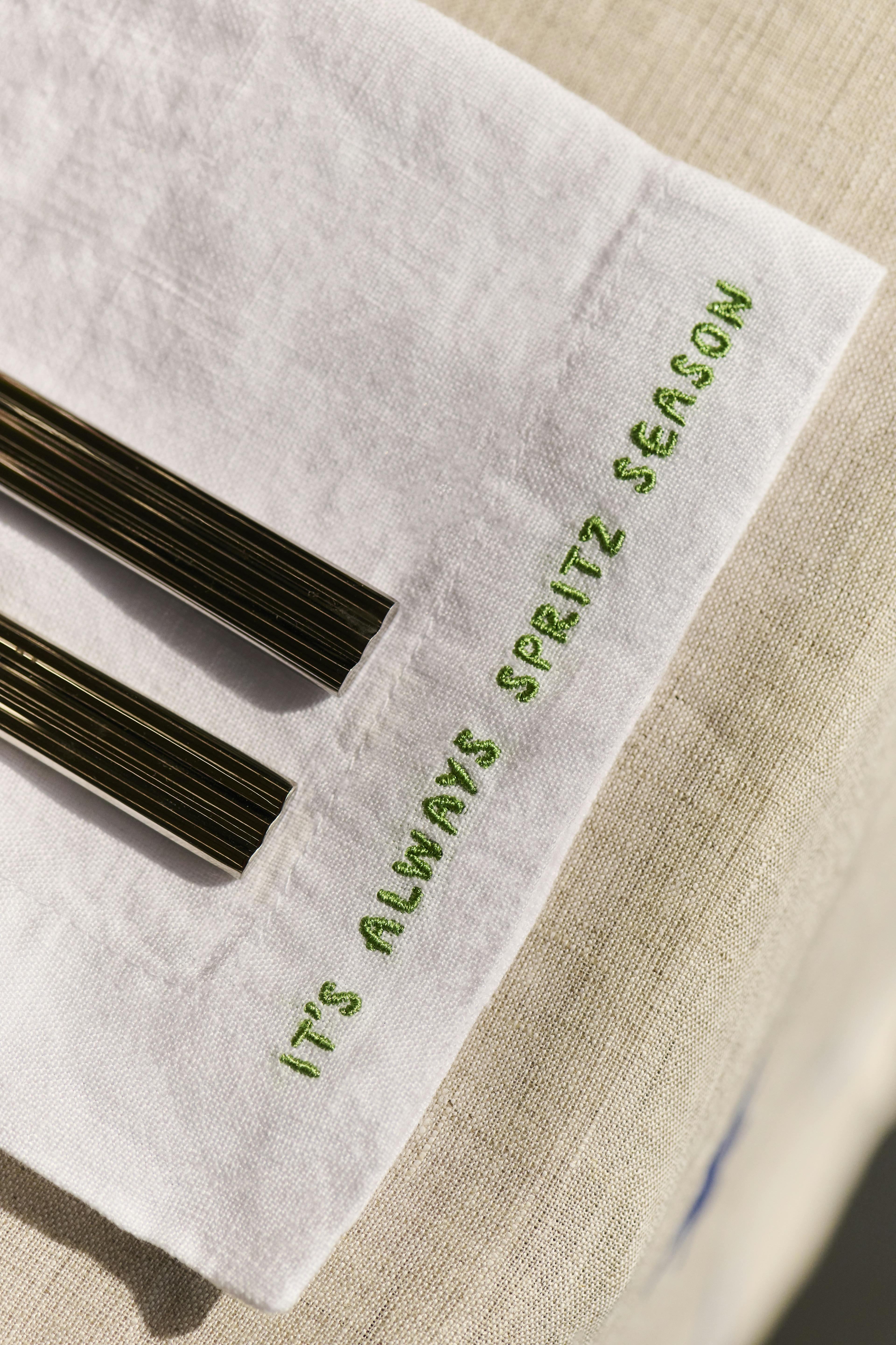 A signature ST-GERMAIN cocktail is my favourite way to set a light, joyful tone. Served in beautiful glassware and placed alongside Arkitaip’s linen napkins, each embroidered with its own playful mantra, it becomes a moment that feels both celebratory and thoughtful. Festive ST-GERMAIN Spritz brings a dash of decadence to the occasion, while the napkins spark conversation and connection as everyone takes their seat.
