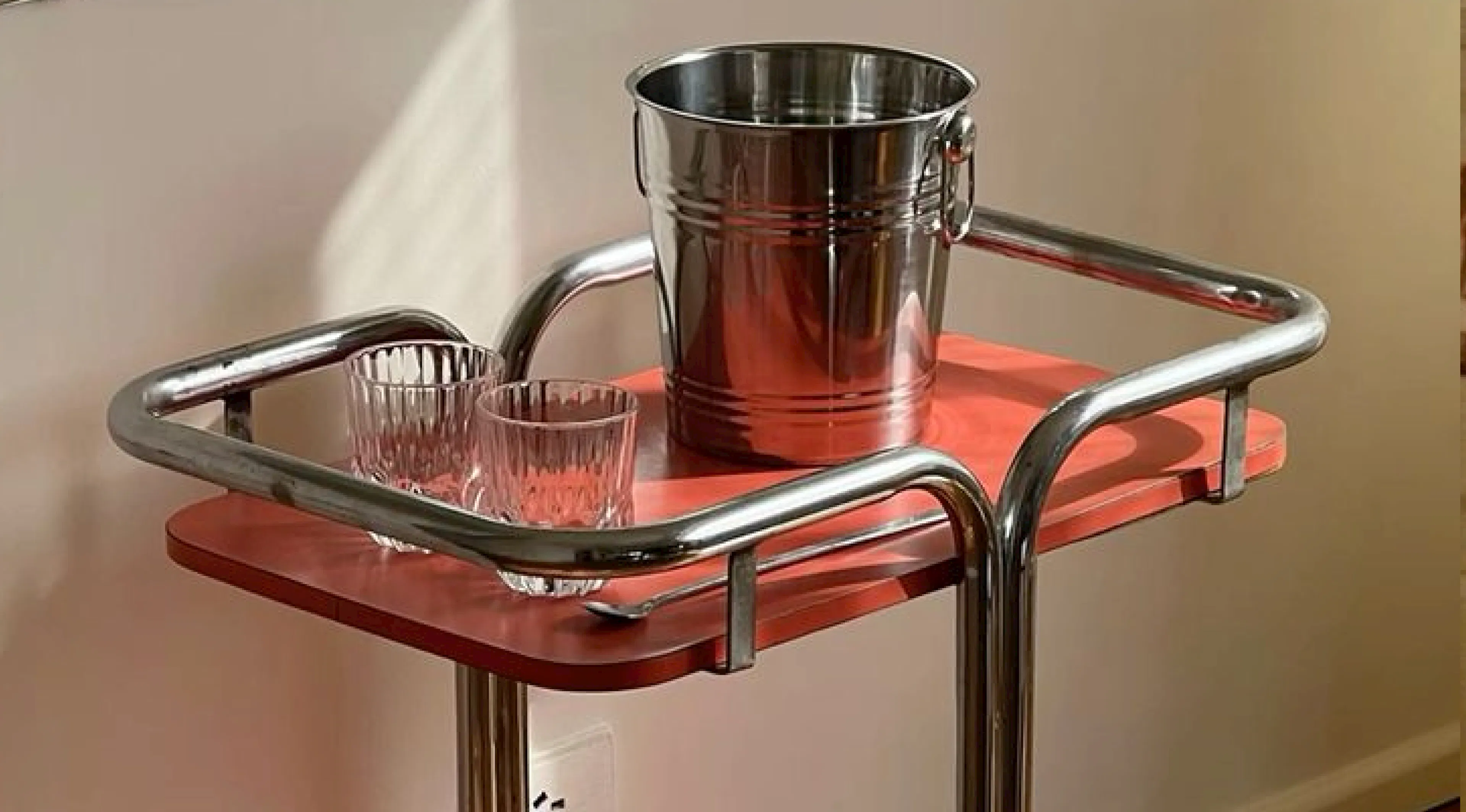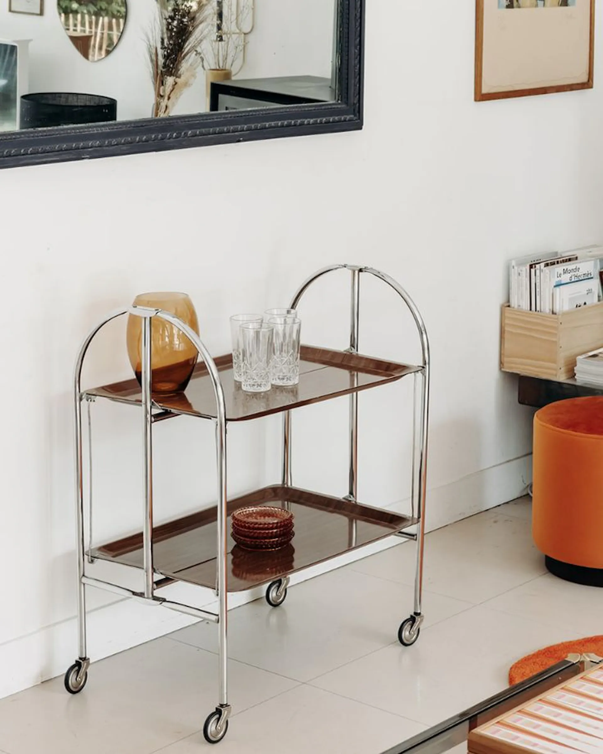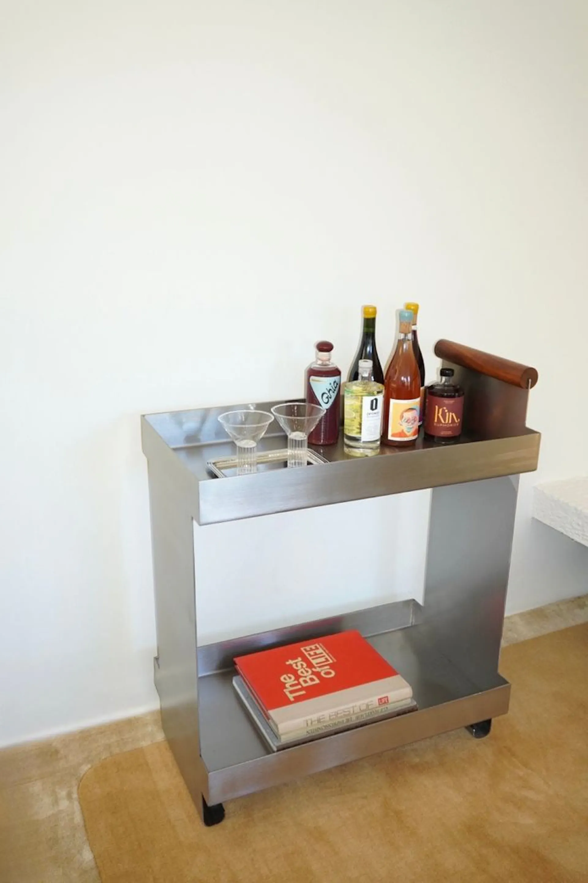A simple trolley or low shelf works best, especially one that can move between kitchen and living space. Glass and metal feel too “bar-coded”; wood, rattan or powder-coated steel read warmer.