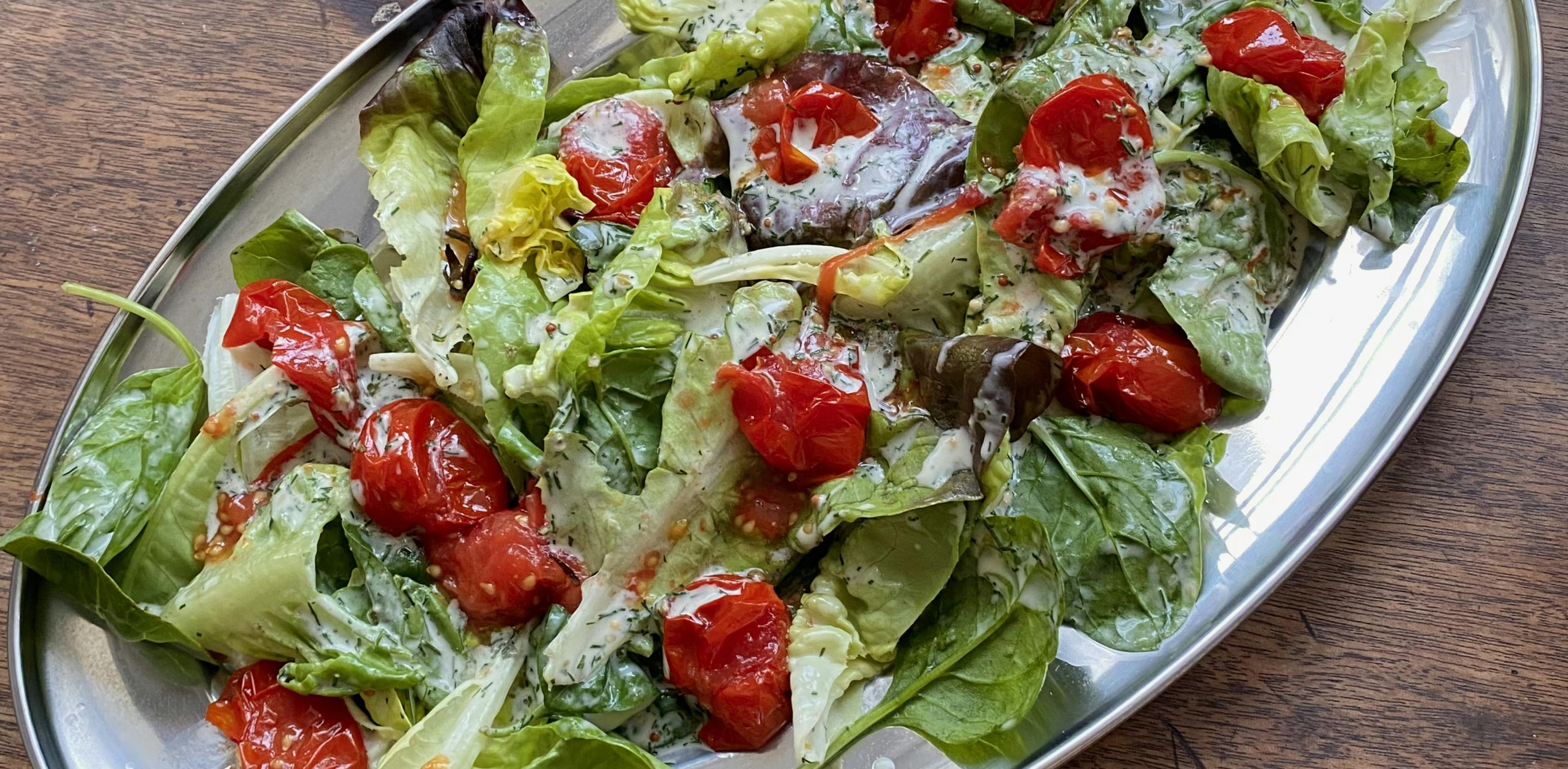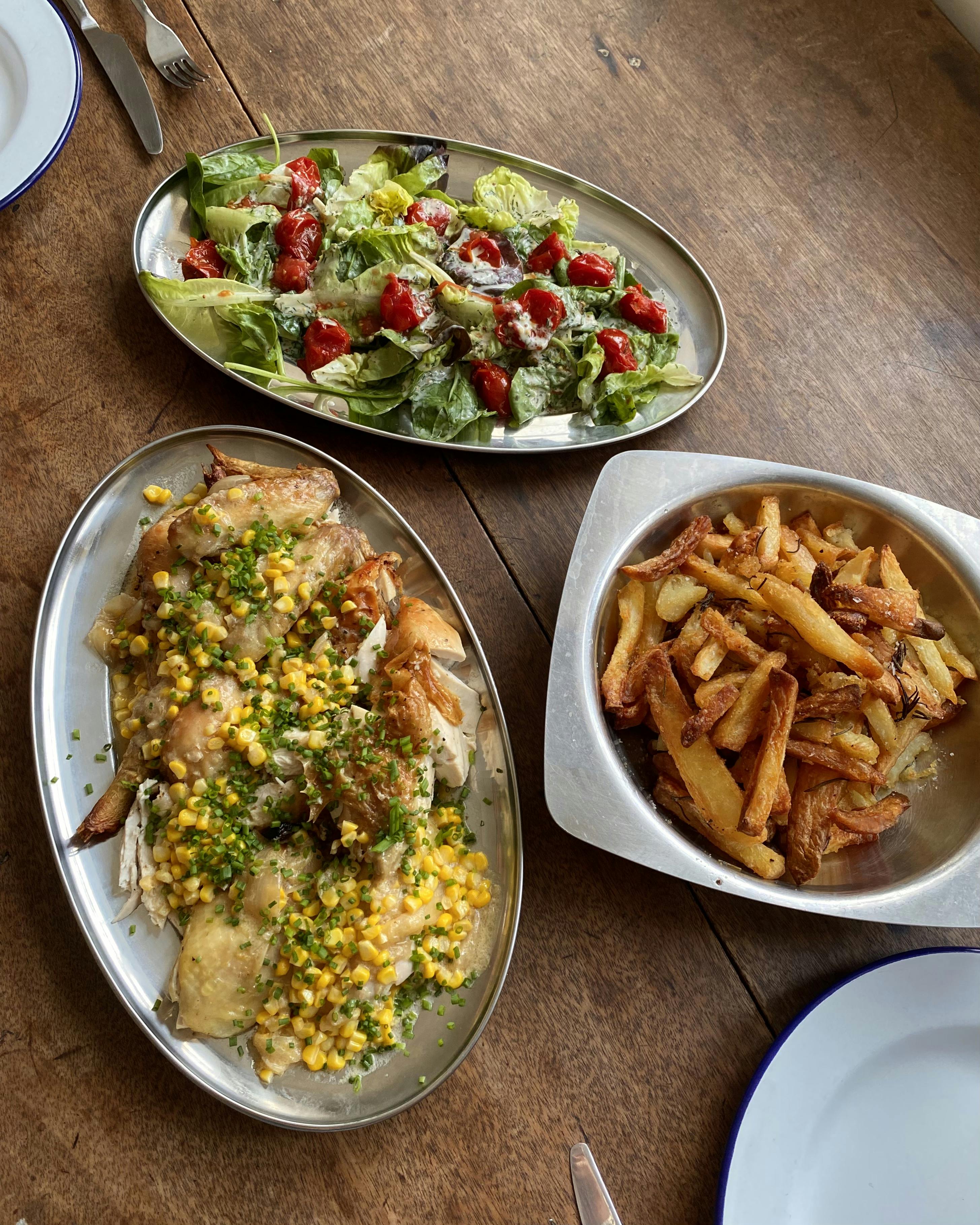 I lay the potatoes out on a baking tray with a generous pour of olive oil and fresh rosemary and let them start roasting, a few moments later, I add the chicken on a tray above. When the potatoes and chicken are cooking in the oven, everything else falls into place. I prepare the corn and cook it down in butter and salt. Once the chicken is resting I spoon the buttery corn and roasting juices over the top, toss the potatoes with some salt and finish the salad with dressing and dill. Dessert is already plated. My work here is done.