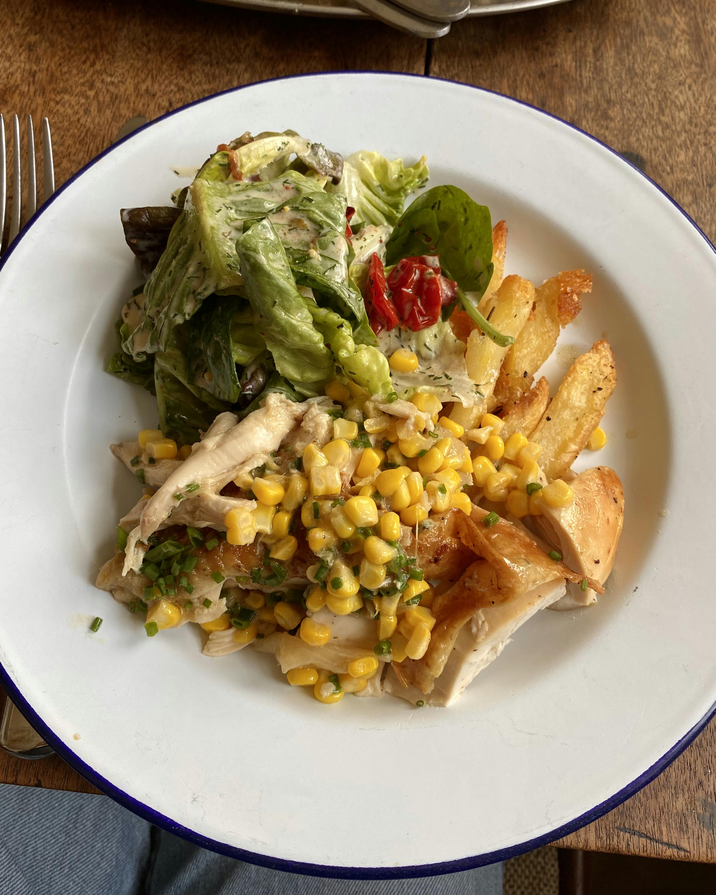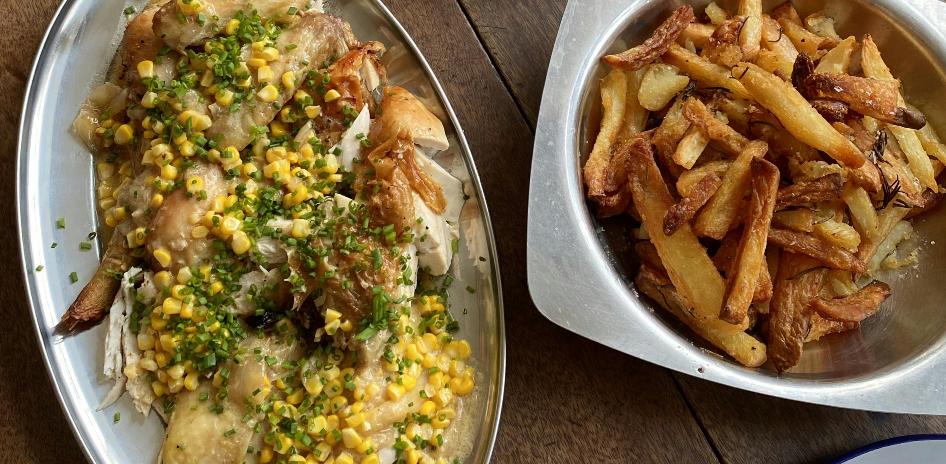 I keep a mental (and digital) library of ideas and half-scribbled recipes that excite me. One part of the inspiration for this menu came from Kitty Coles. I had seen her roast a chicken and coat it with a sauce made of creme fraiche and corn. I instantly thought about it but without creme fraiche and with a chicken butter sauce. My dream plate. I knew I wanted that to be the base as my favourite food as a child was buttered corn on the cob.