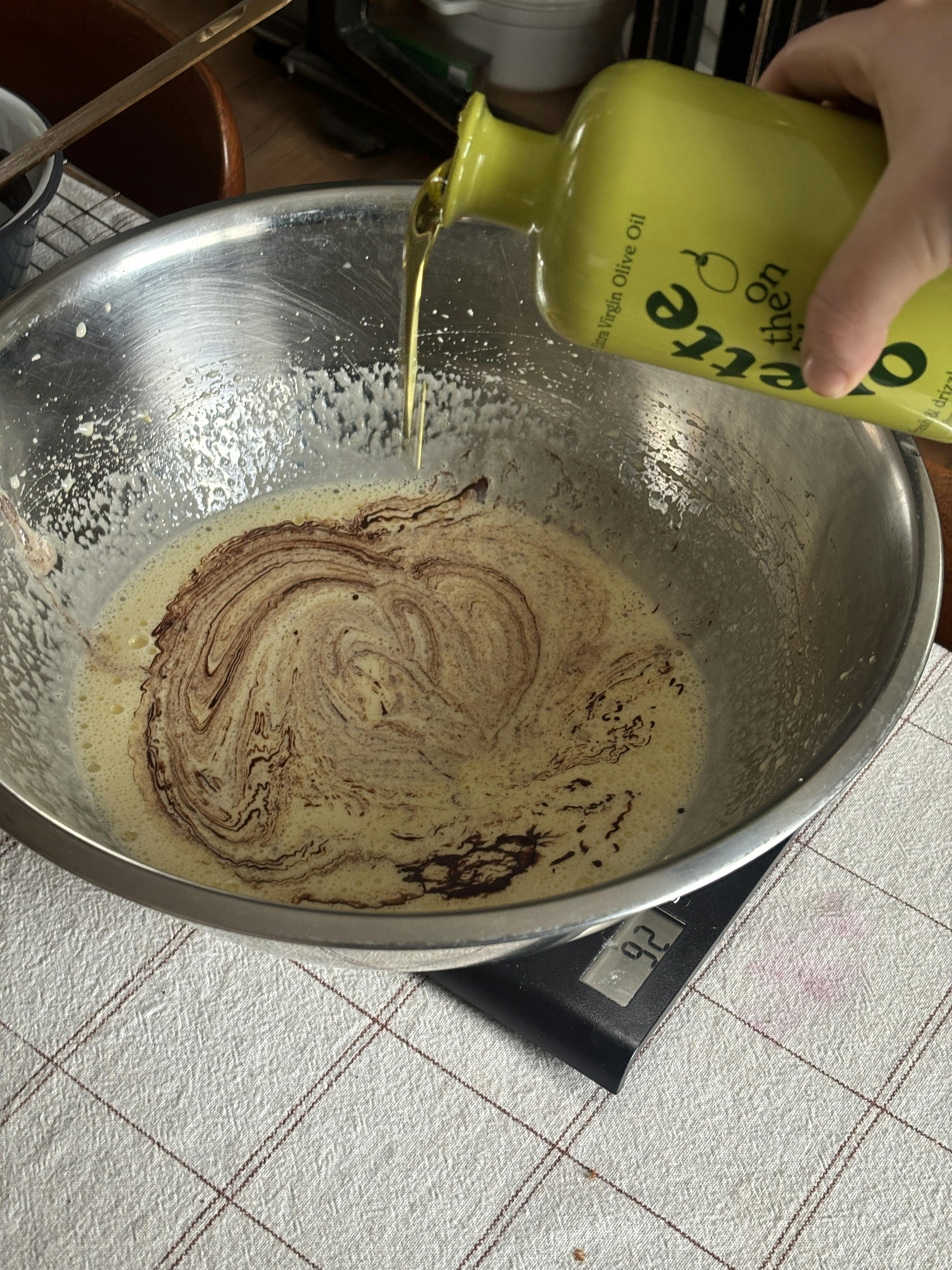 3: Gently incorporate the melted chocolate into your pillowy sugar and eggs and then the olive oil, mix again with the electric whisk. Now add the dry ingredients (salt, ground almond and clementine zest) and mix gently until fully incorporated.