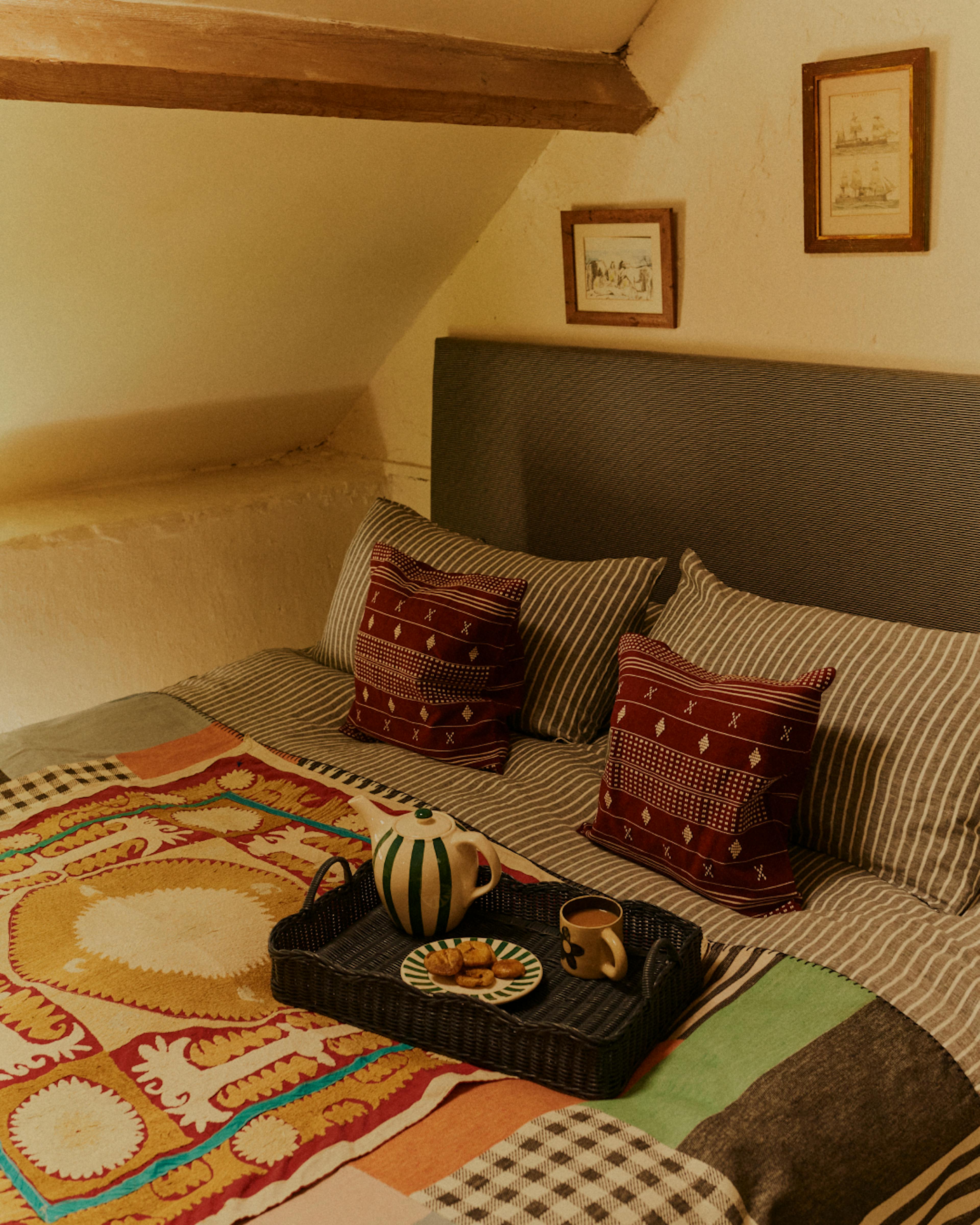 If you lived in shared accommodation and you’re thinking of refreshing your bedroom ahead of the colder months, layering mismatching blankets is a simple nod to this cottagecore feeling. Our tip is to pick blankets or throws with at least one common colour, so this colour acts as a thread, tying everything together, keeping the overall vibe cosy and quiet. Look for patchwork designs and handwoven details, mix vintage finds with handcrafted modern pieces, new heirlooms to hold new stories.