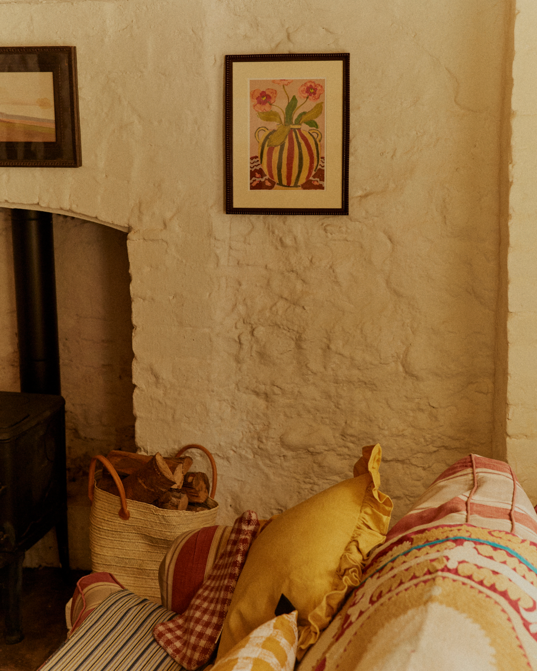 Cottagecore is a celebration of natural materials, a feeling of bringing the outside in. This can begin with a classic, neutral palette but this doesn’t mean colour can't have a role to play. Use rich, warm tones as your accent shades in a room: merlot coloured bedspreads, grass green woven doormats and cushions in navy, deep red and mustard.