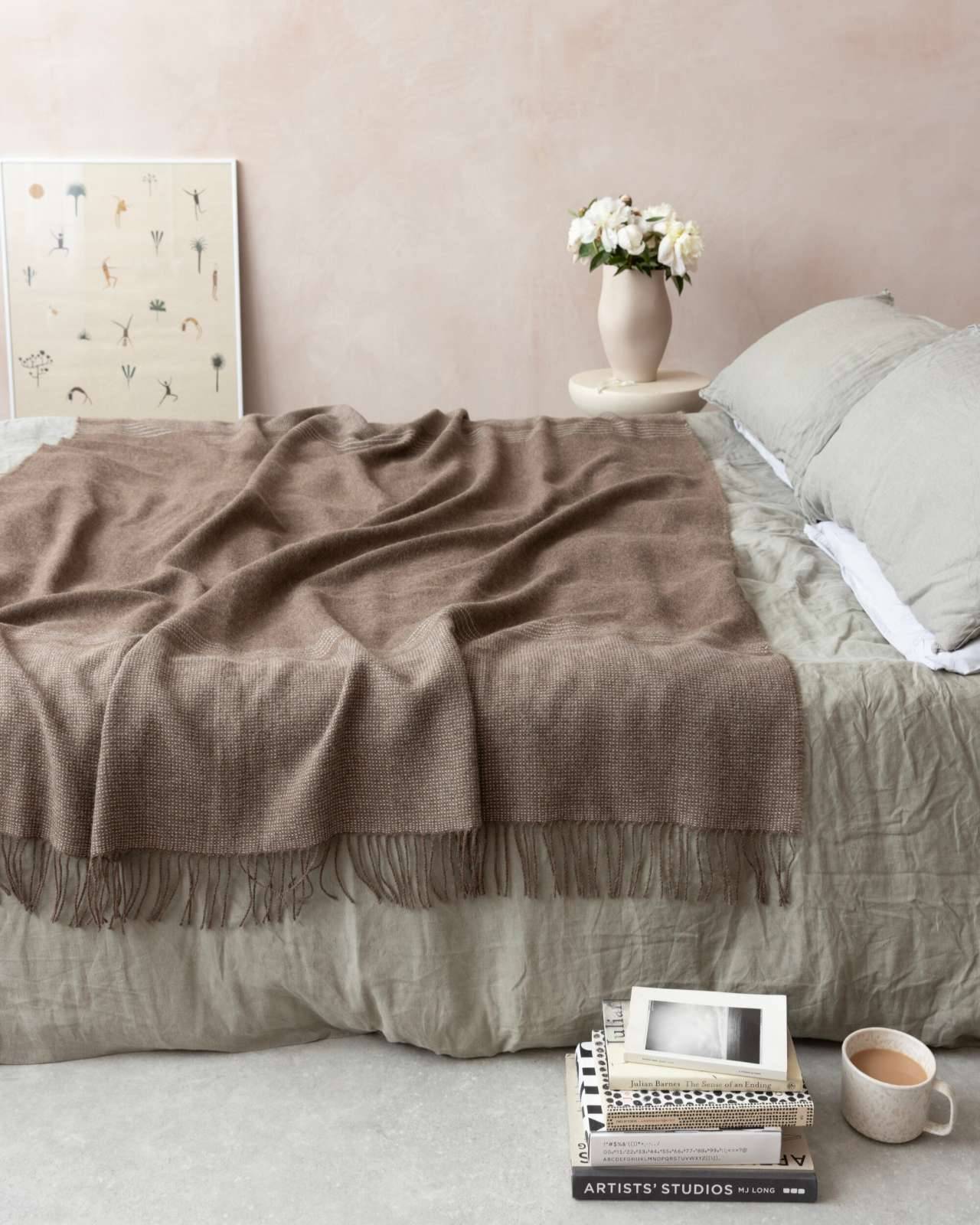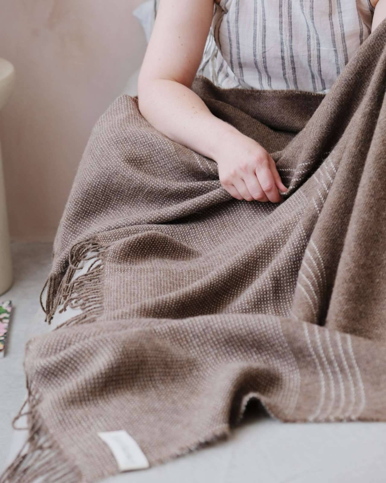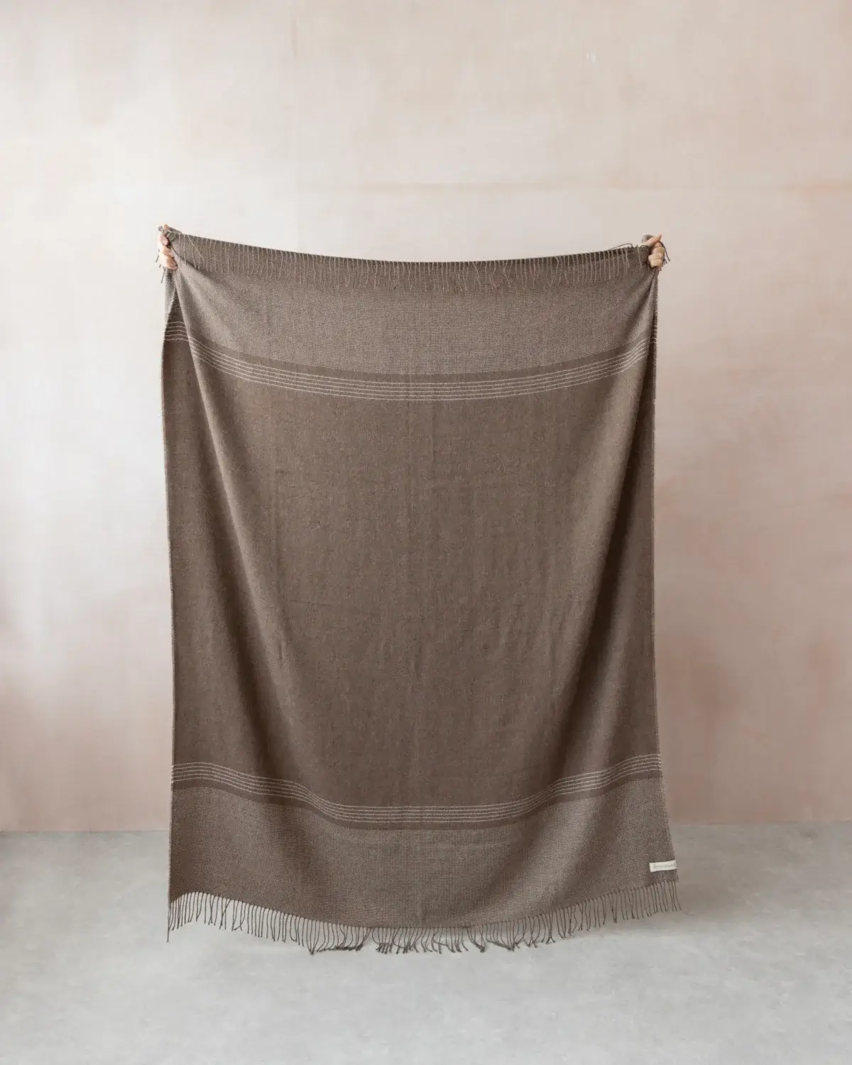 Indulge in the soft, understated luxury of this 100% Alpaca Blanket in Mocha Brown, woven in Ireland for lightweight warmth that feels as silky as cashmere yet gentle enough for sensitive skin. In a mellow coffee hue with delicate white pinstripes at either end, this throw (150 × 200 cm) brings natural texture and calm to your space—draped over sofas, layered on beds, or curled around on chilly evenings. A piece of timeless craftsmanship and thoughtful design, ideal for gifting or elevating your home décor.