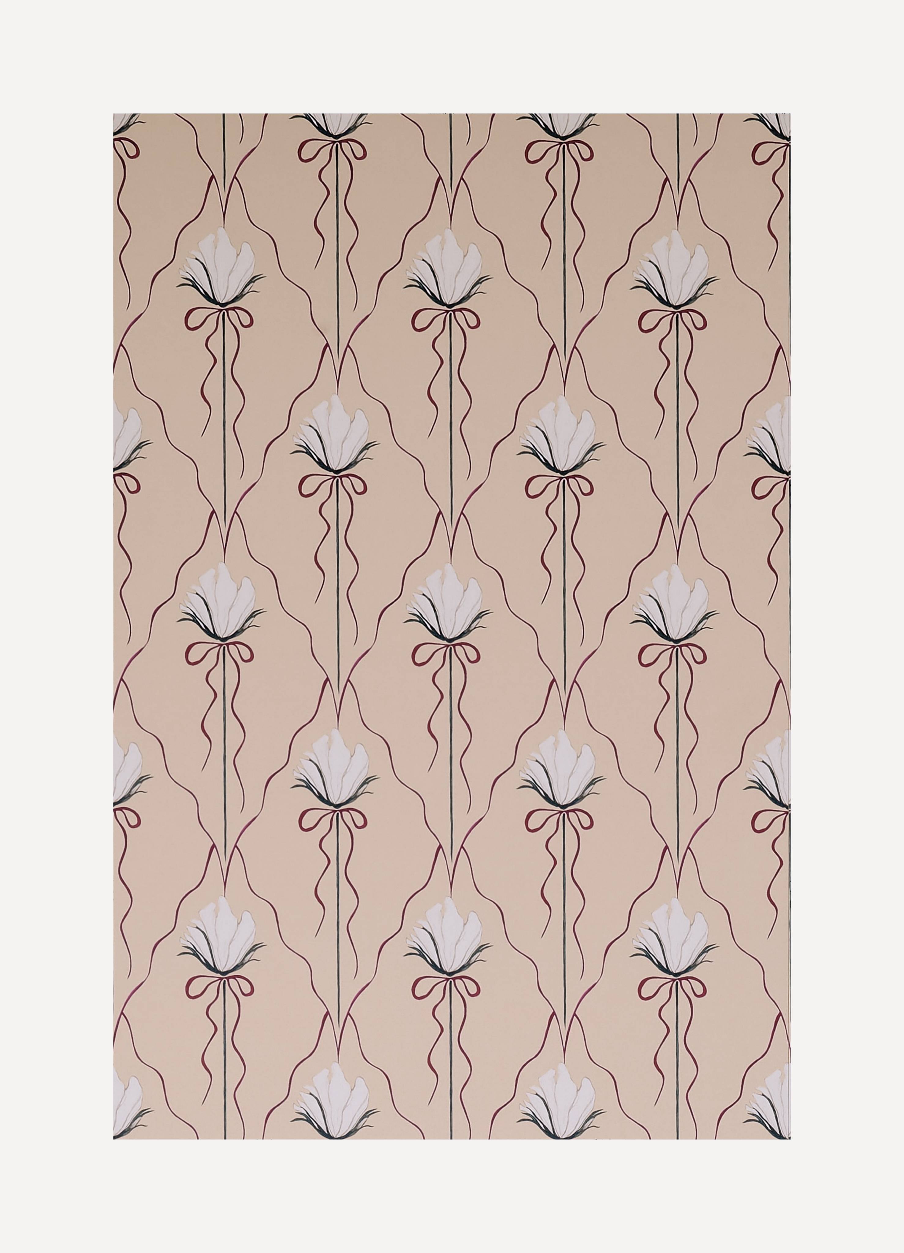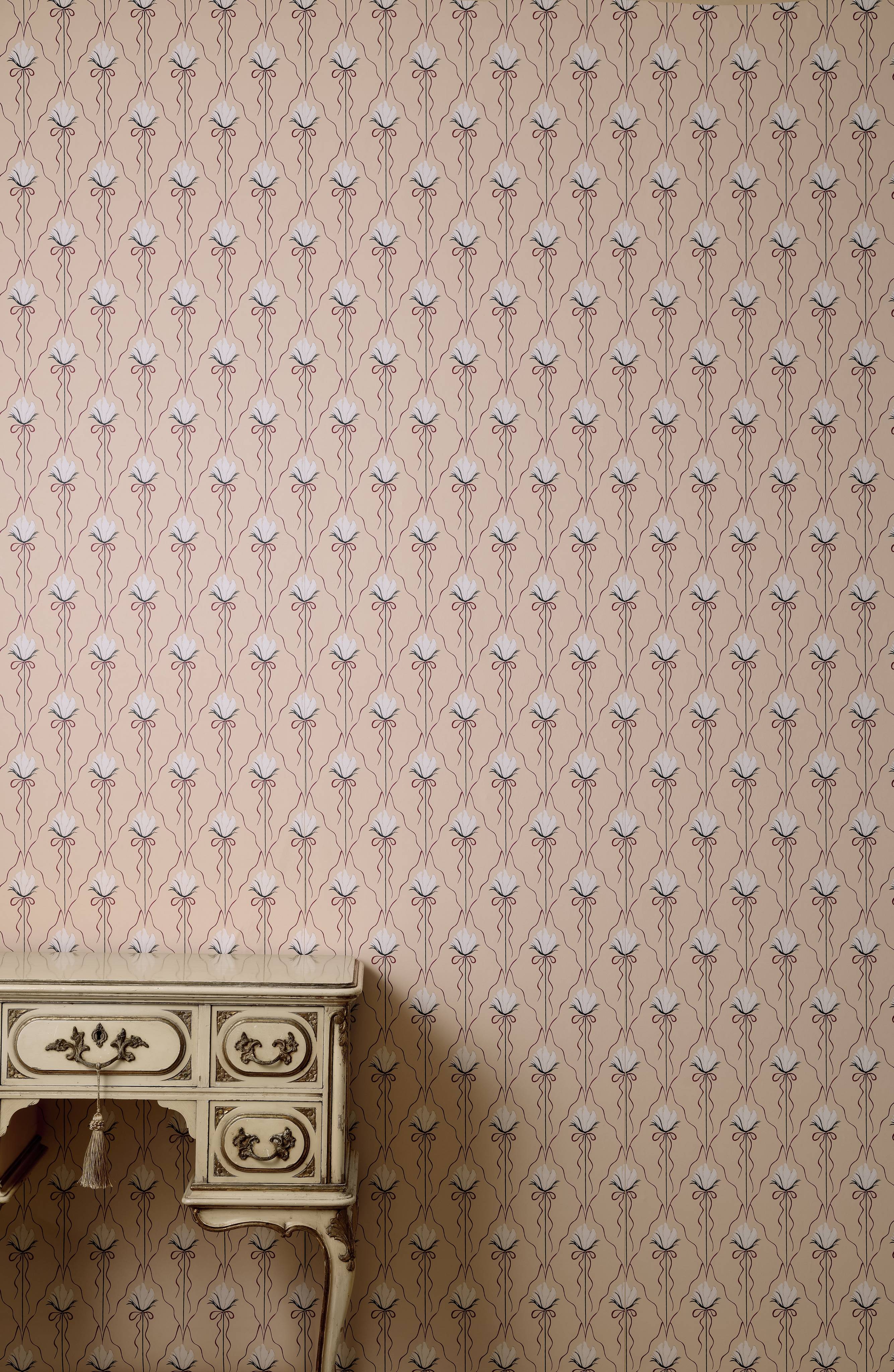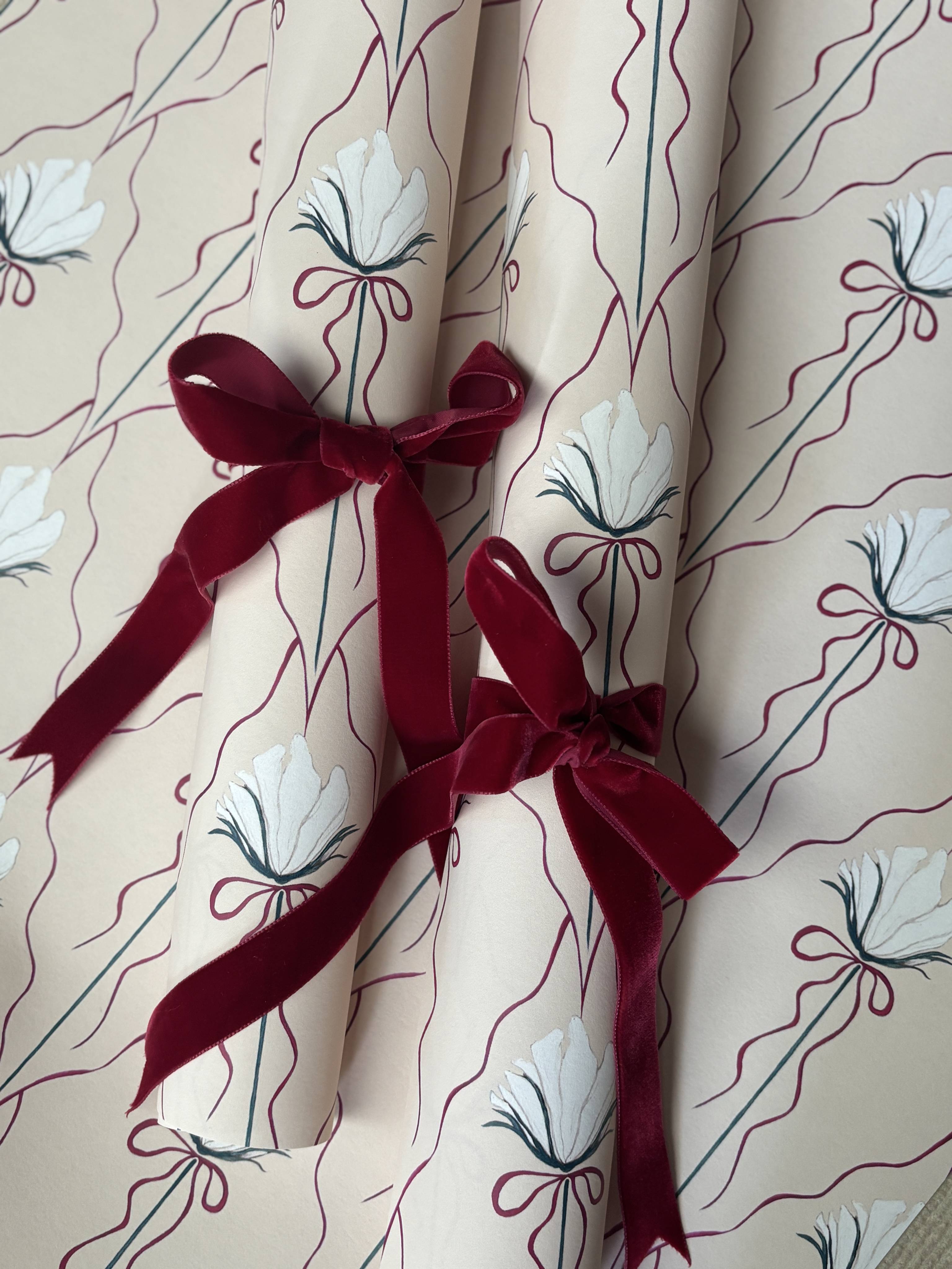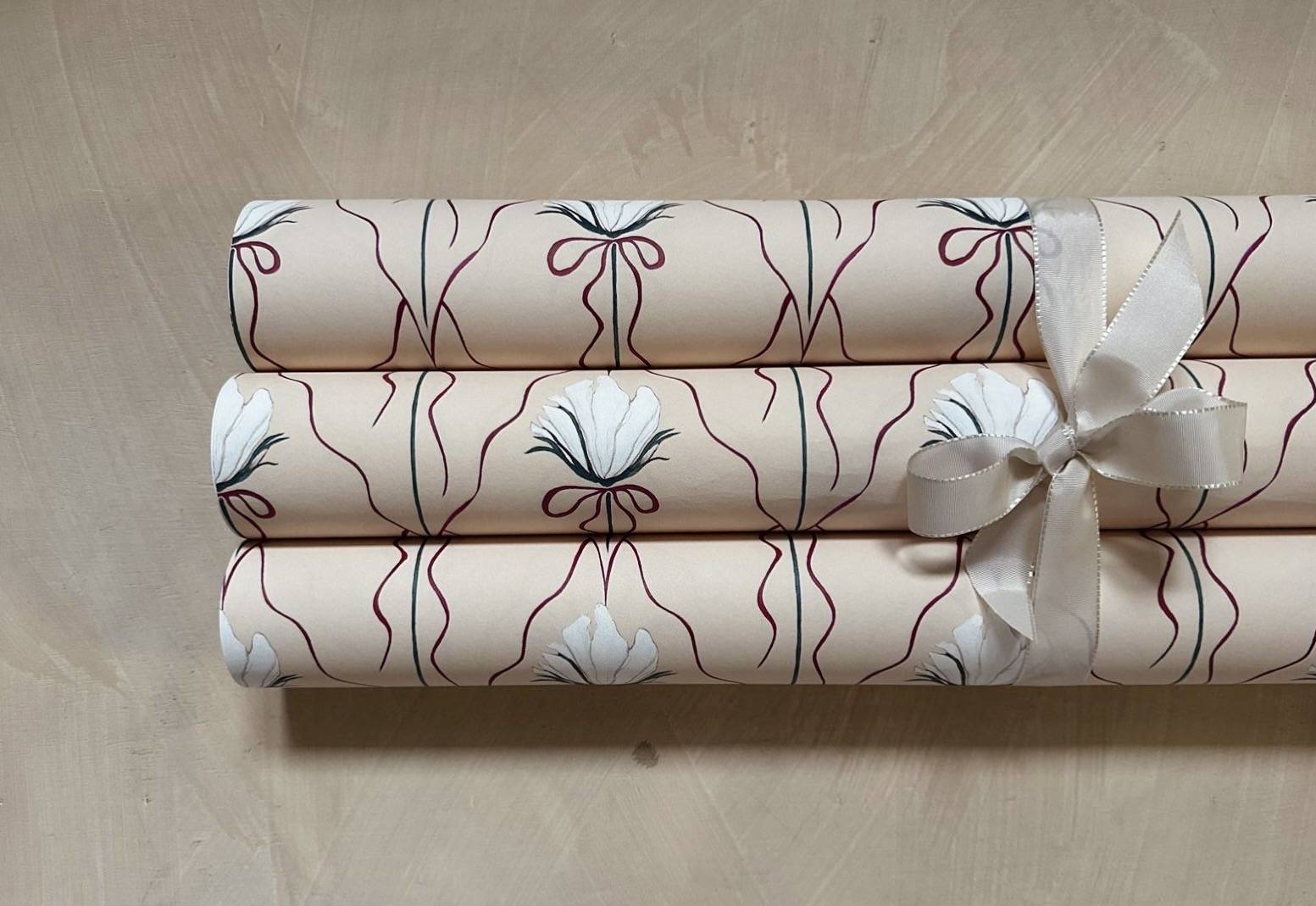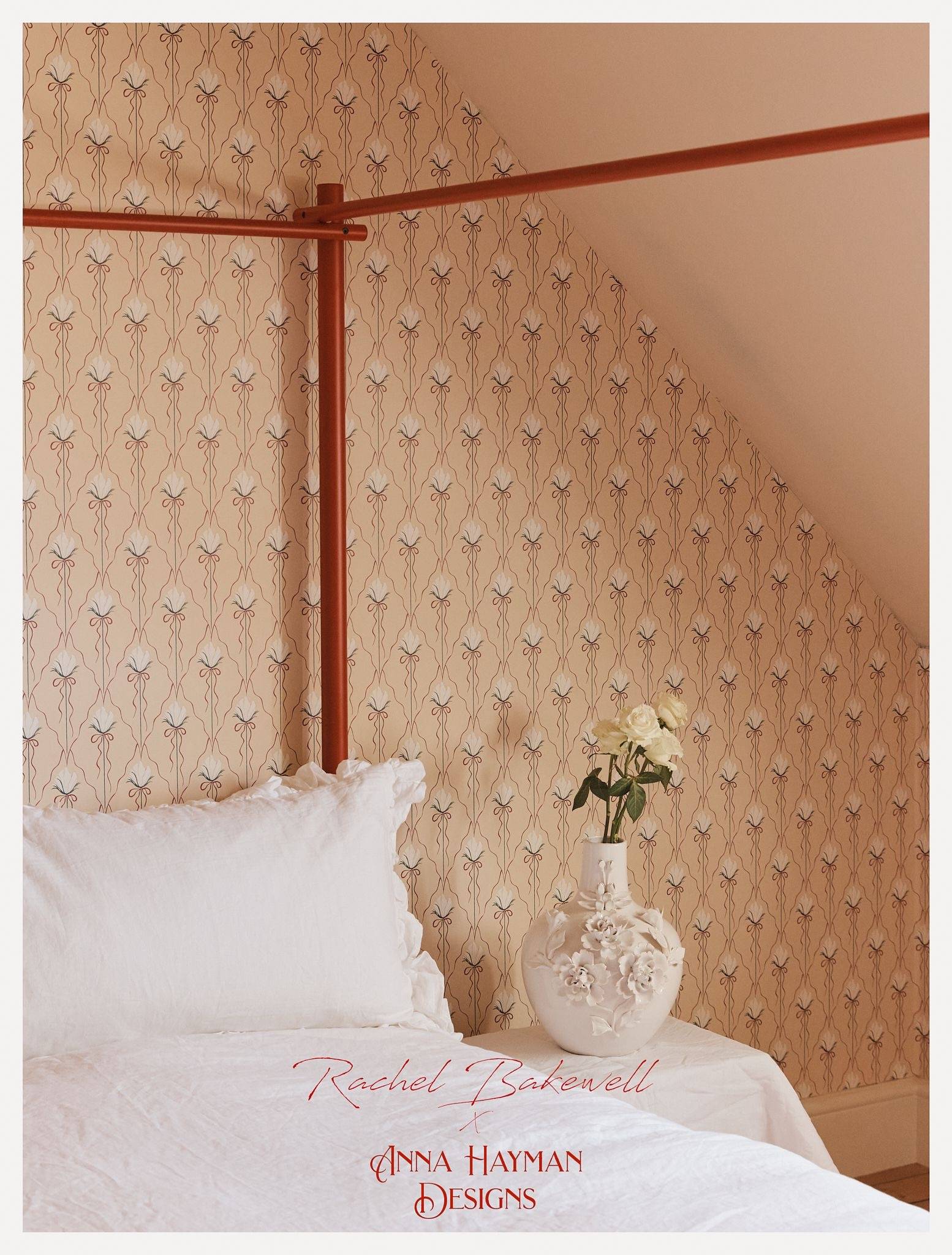 White Rose Wallpaper – in collaboration with Fashion Stylist Rachel Bakewell. ‘Childhood friends Rachel Bakewell and Anna Hayman join to collaborate on a pair of printed designs for the home. Two wallpapers and two fabrics fusing Rachel’s love of bows and roses with Anna’s signature ‘midimalist’ style.’ A lyrical and romantic pattern with strong cottagecore influence, this white rose design on a plaster colour background, with red ribbons and wavy lines is a pretty and feminine paper for Valentines day 2025.