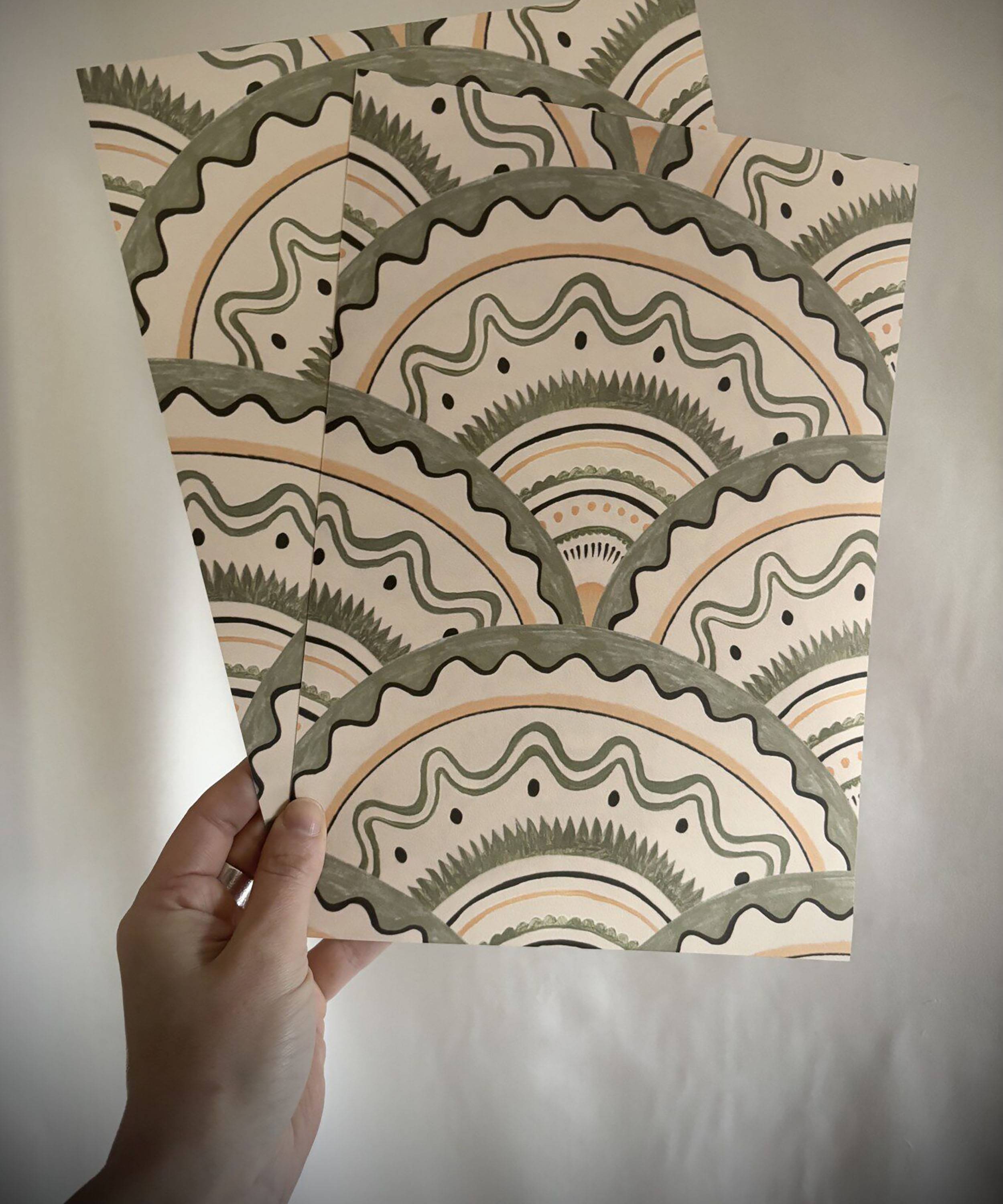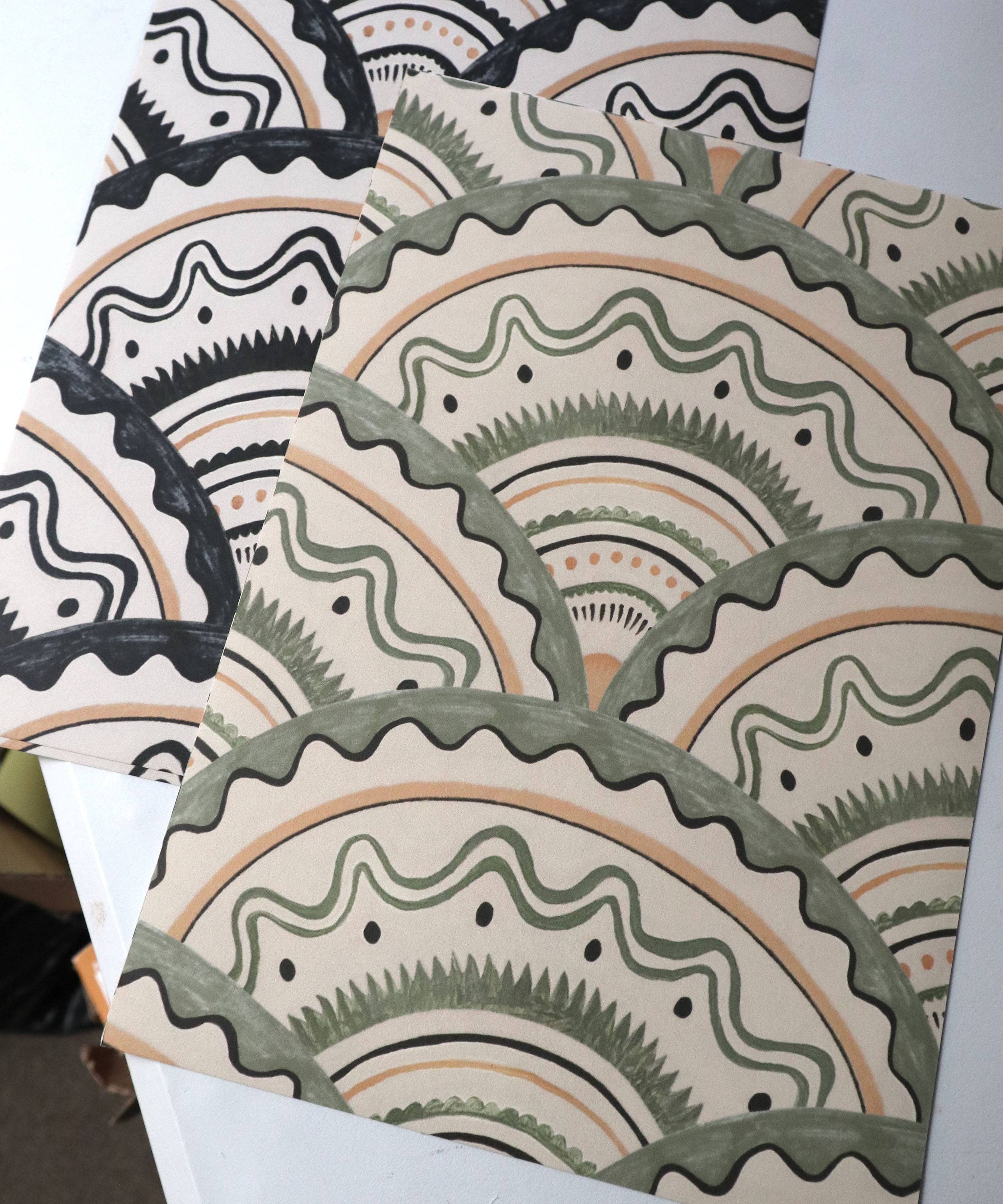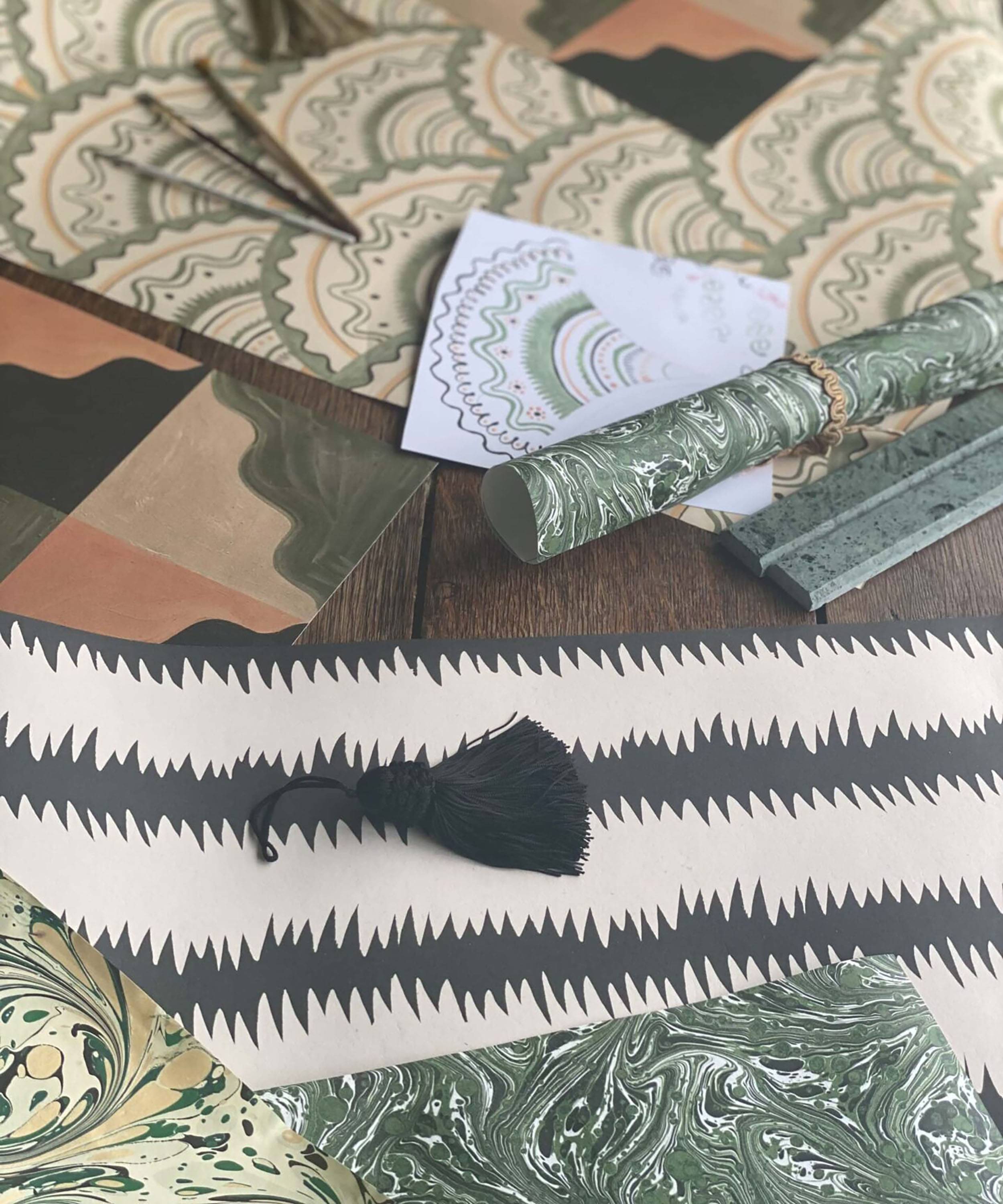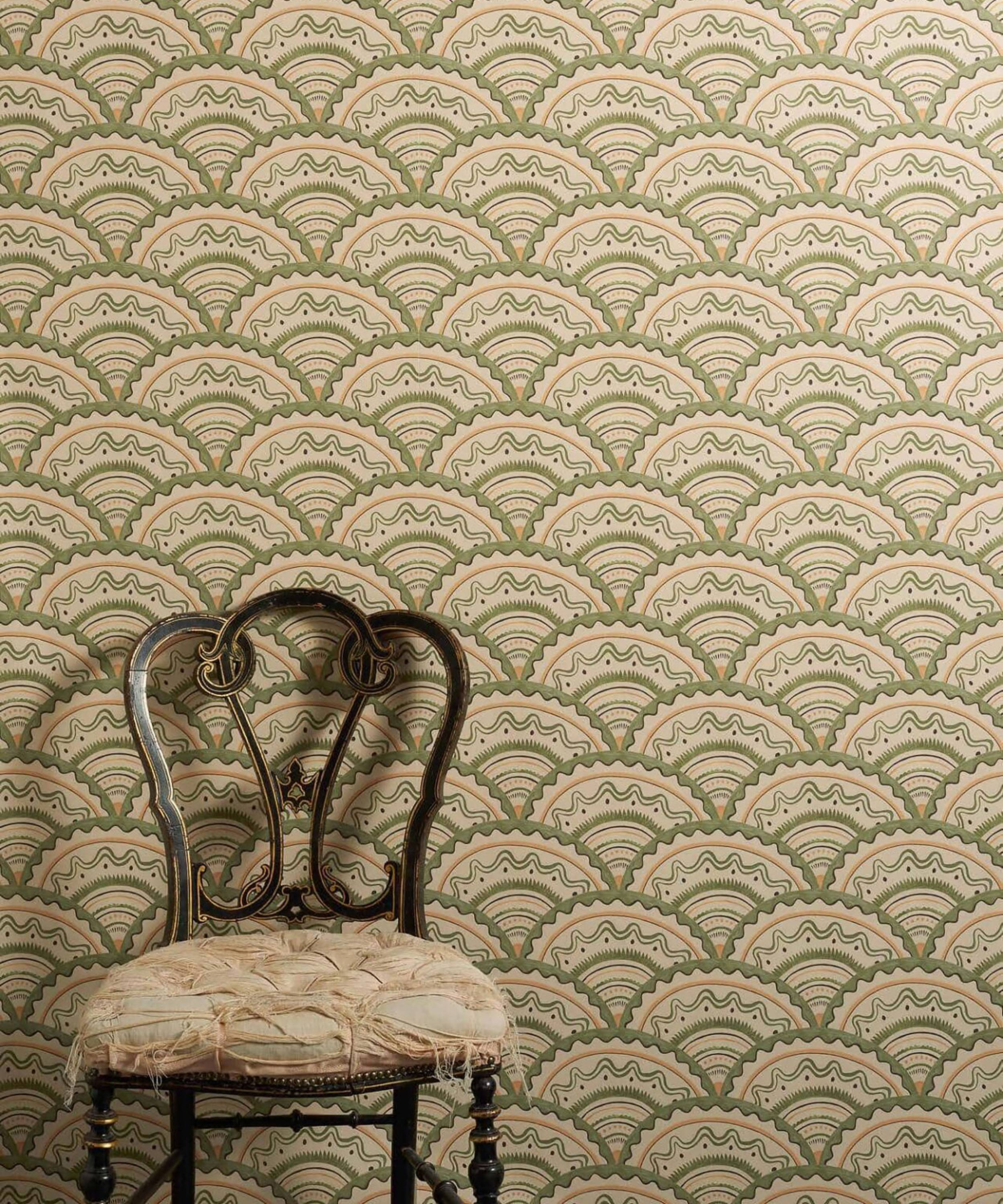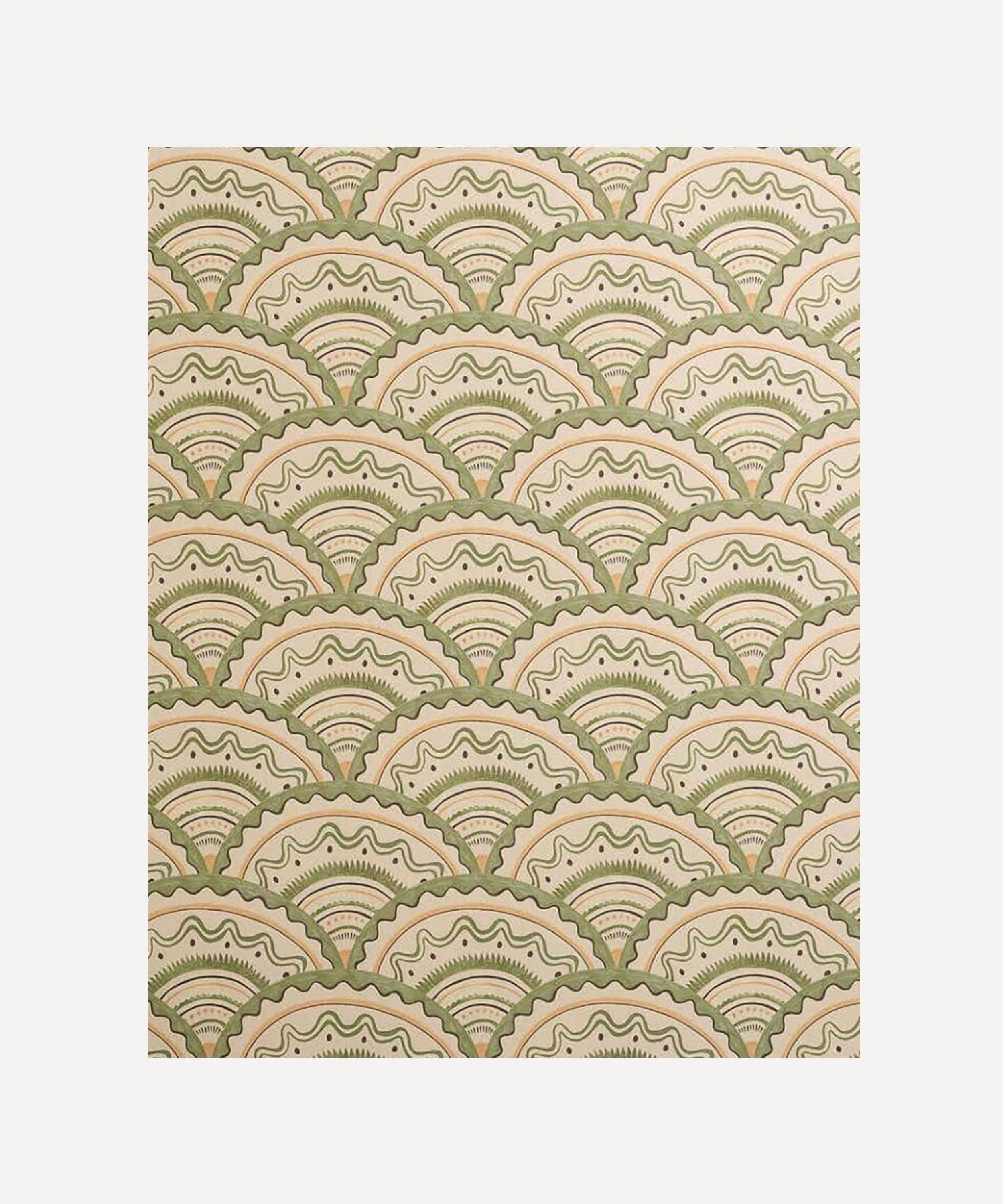 Clarice Verte is a 1930s inspired design a little reminiscent of the ceramicist Clarice Cliff. With signature scallops and painterly wiggles and zigzags, this is a cheerful print in tones of soft black, muted orange and sage green.
