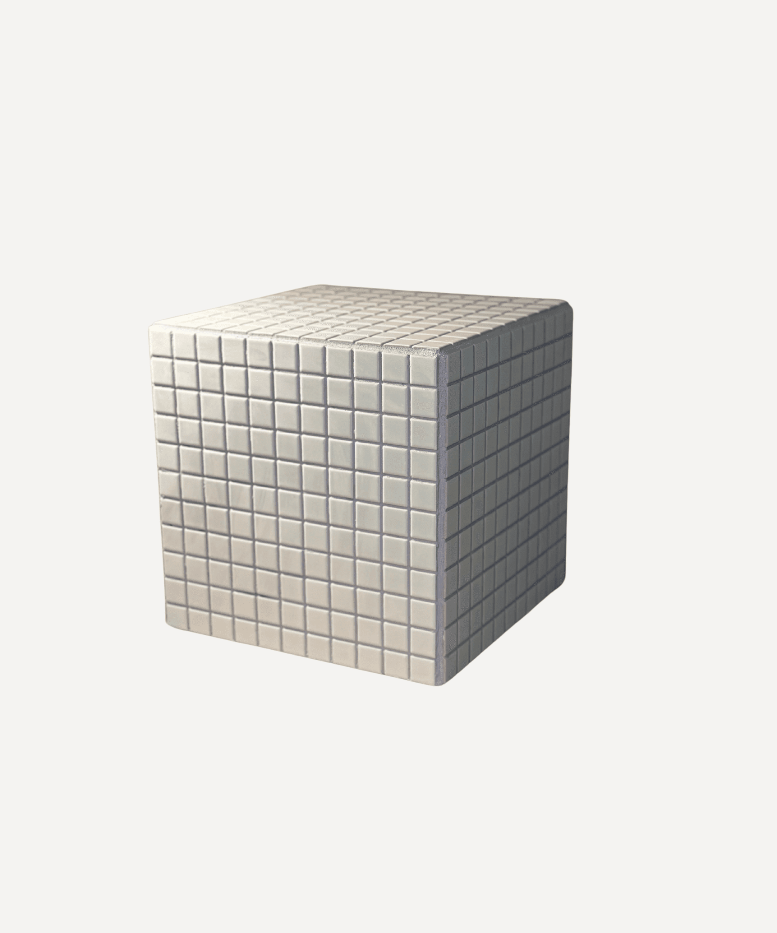 The Mini White Tiled Cube is a clean and versatile piece with a handcrafted touch. Small ceramic tiles are carefully arranged, with contrasting grout that adds subtle detail.