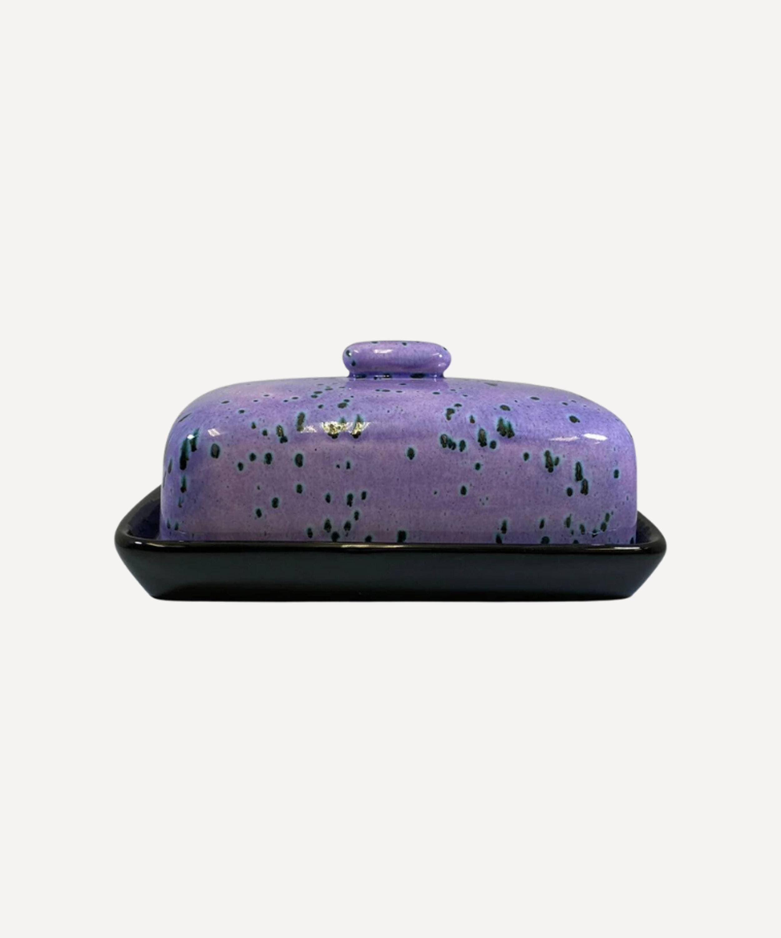An unusual ceramic butter dish with lid is earthenware pottery with a purple speckle ceramic glaze with jet black glazed dish.