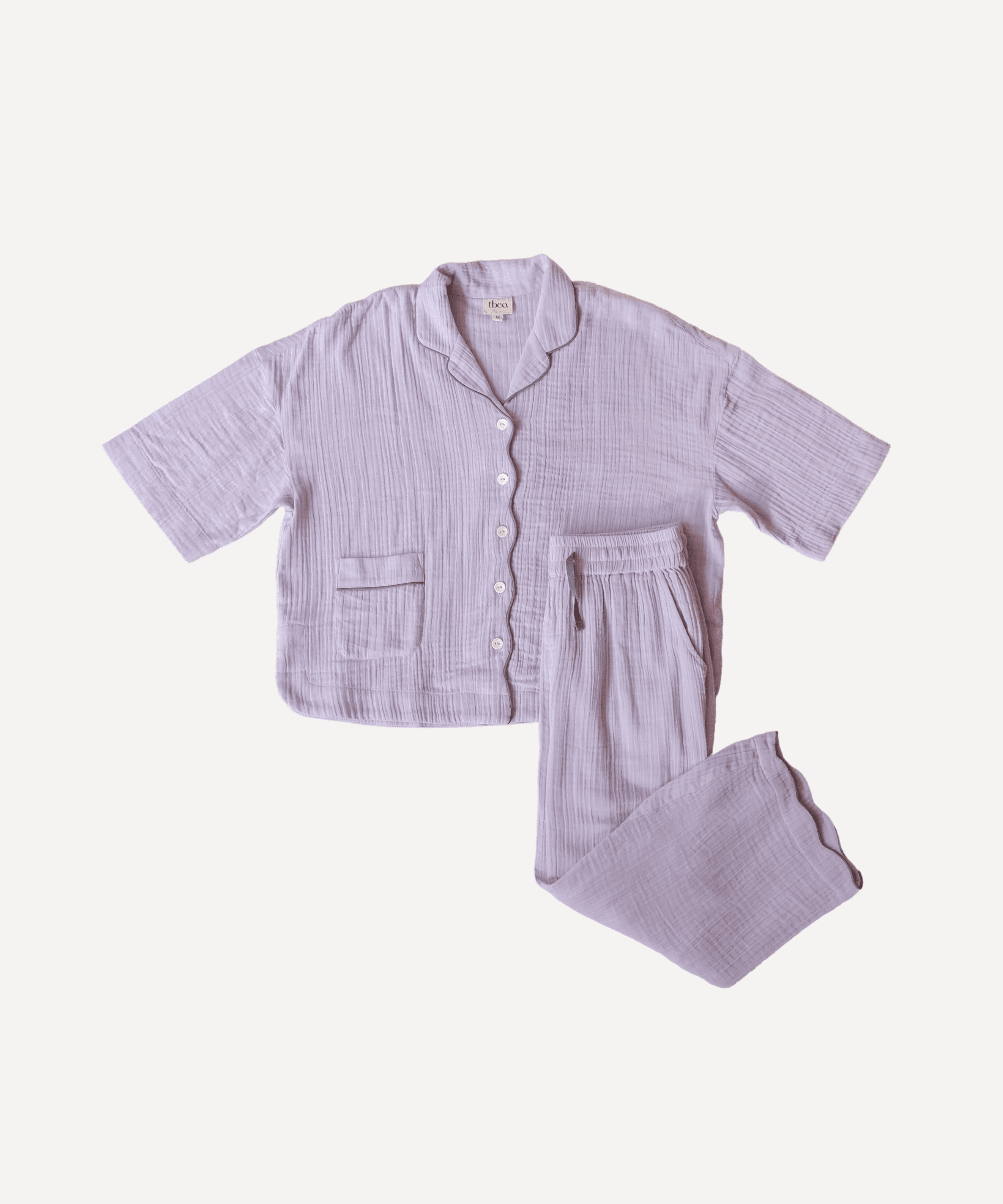 Slip into these perfectly designed PJ's in a gentle lilac. When we say we've thought of everything, we really mean it. The drawstring is stitched into the comfortable elastic waist so that you'll never lose it. The sleeves are cropped so they won't get wet when you wash your face. The buttons are made from recycled materials. The crinkle gauze cotton is breathable, keeping you at the perfect temperature while you snooze. The scalloped edge on the cropped trousers are adorable. There is a matching scrunchie. And because we all love pockets, there are two on the top and two on the bottoms.