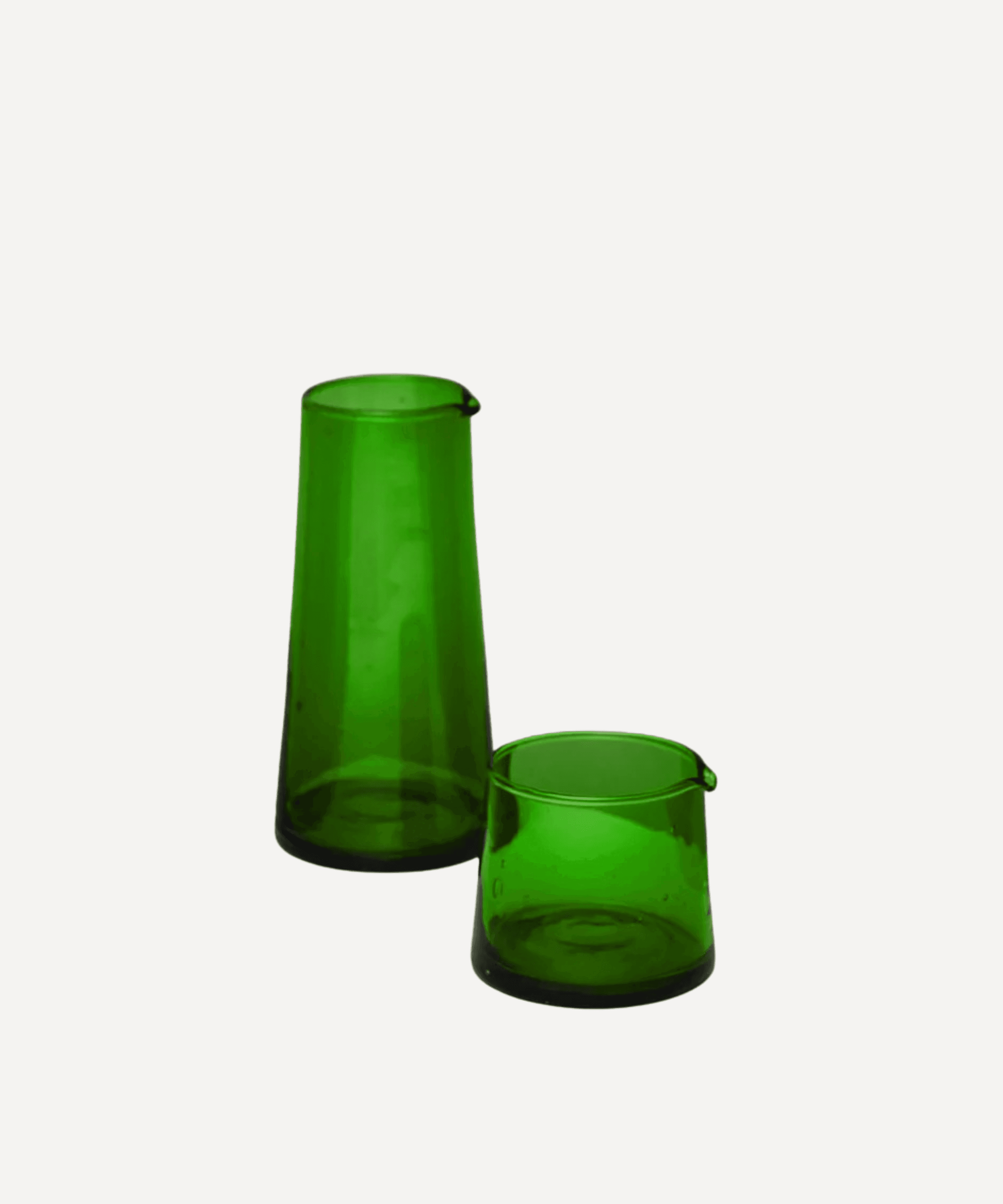 Our newest limited edition colour, made in beautiful emerald green glass. The colour comes from using 100% recycled green glass, with no toxic paint pigments use. The two-piece Jug Set consists of our Tall Jug and Low Jug. The perfect compact set for serving milk, jus and sauces.