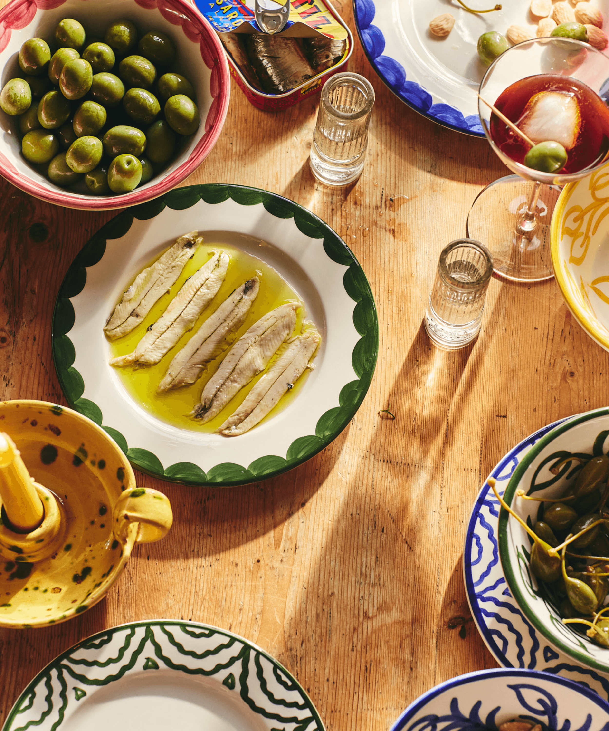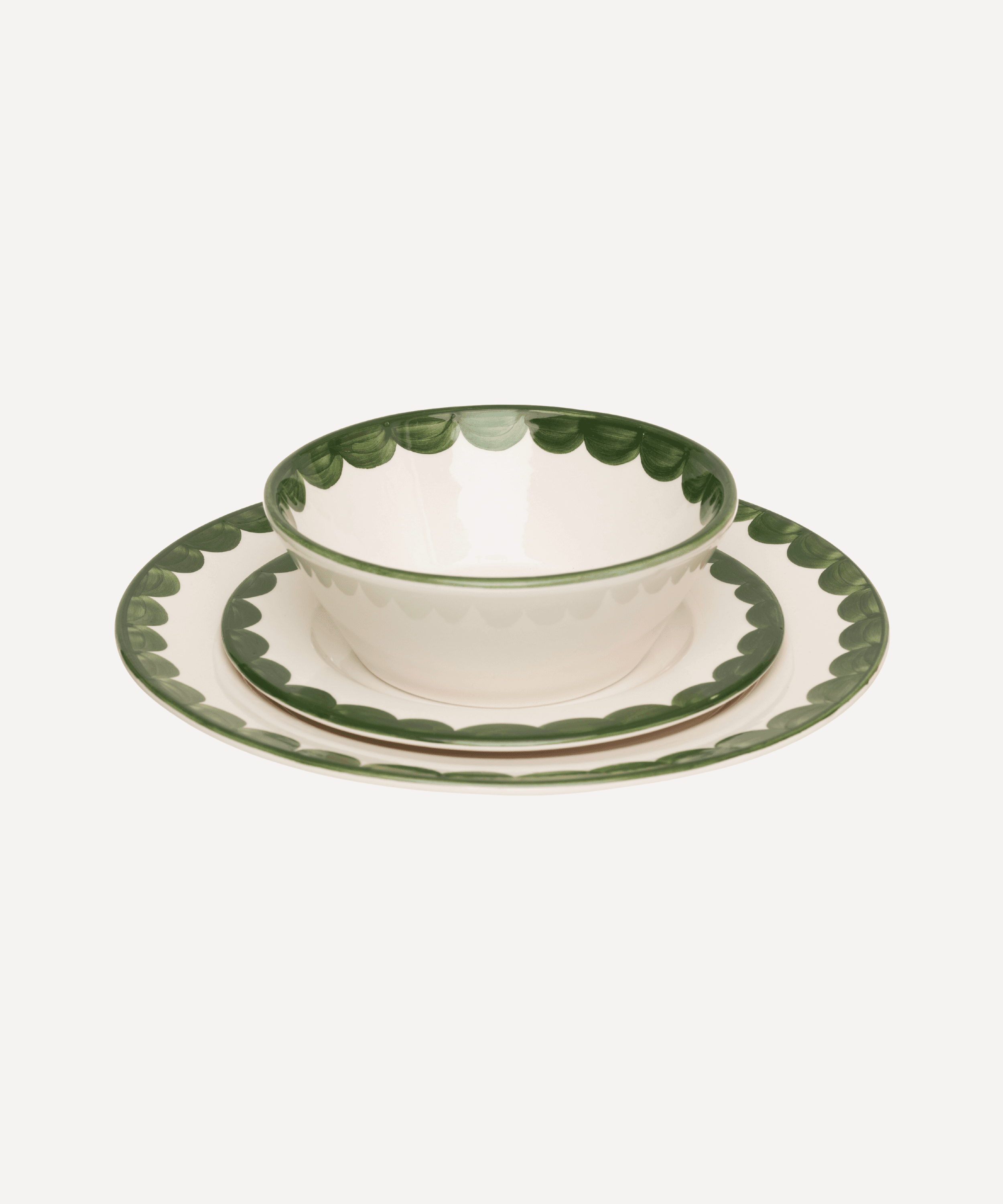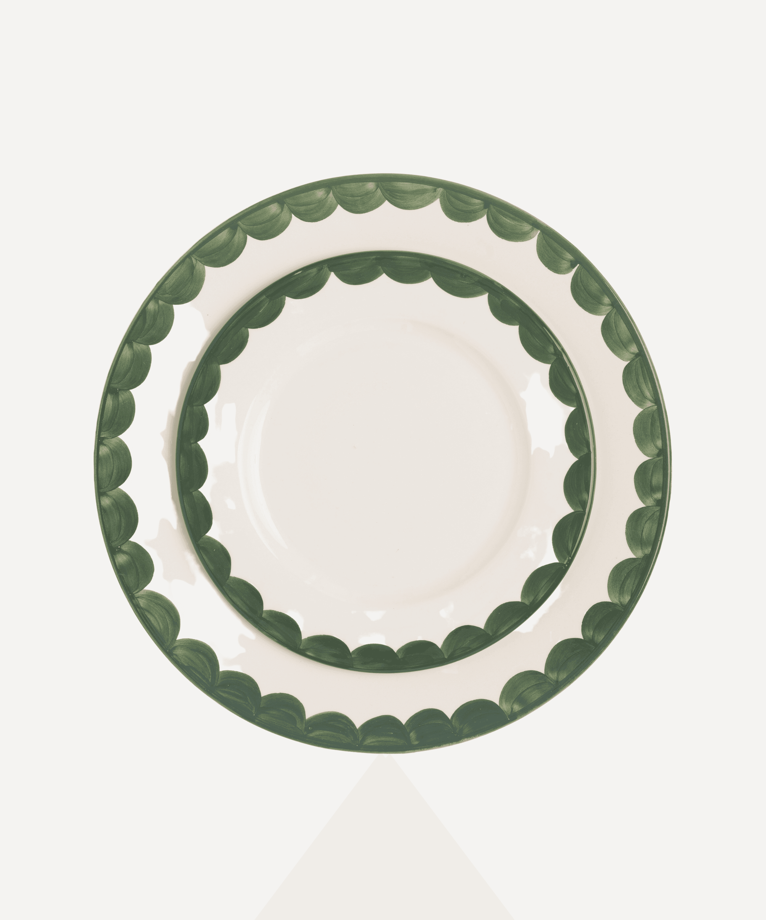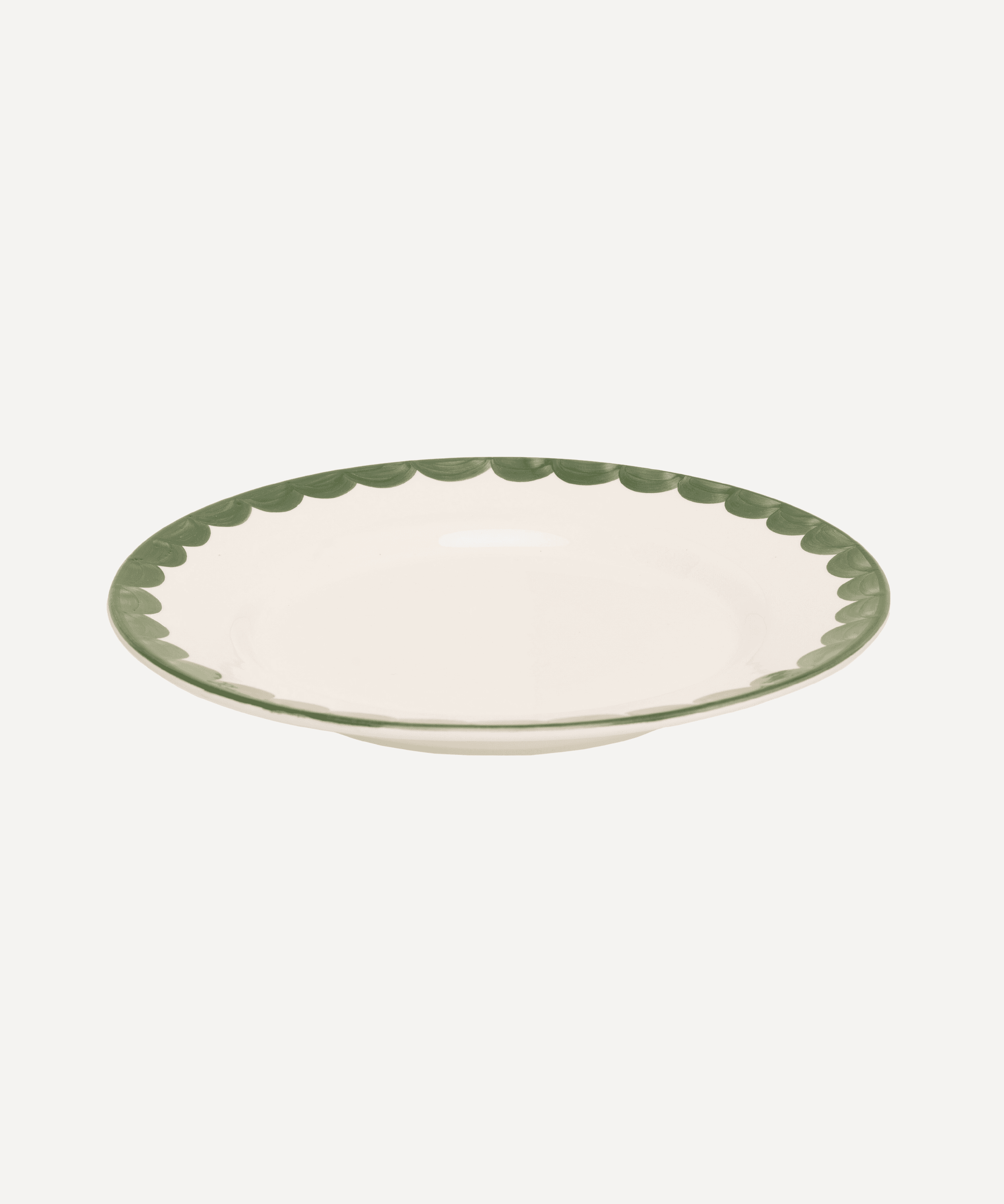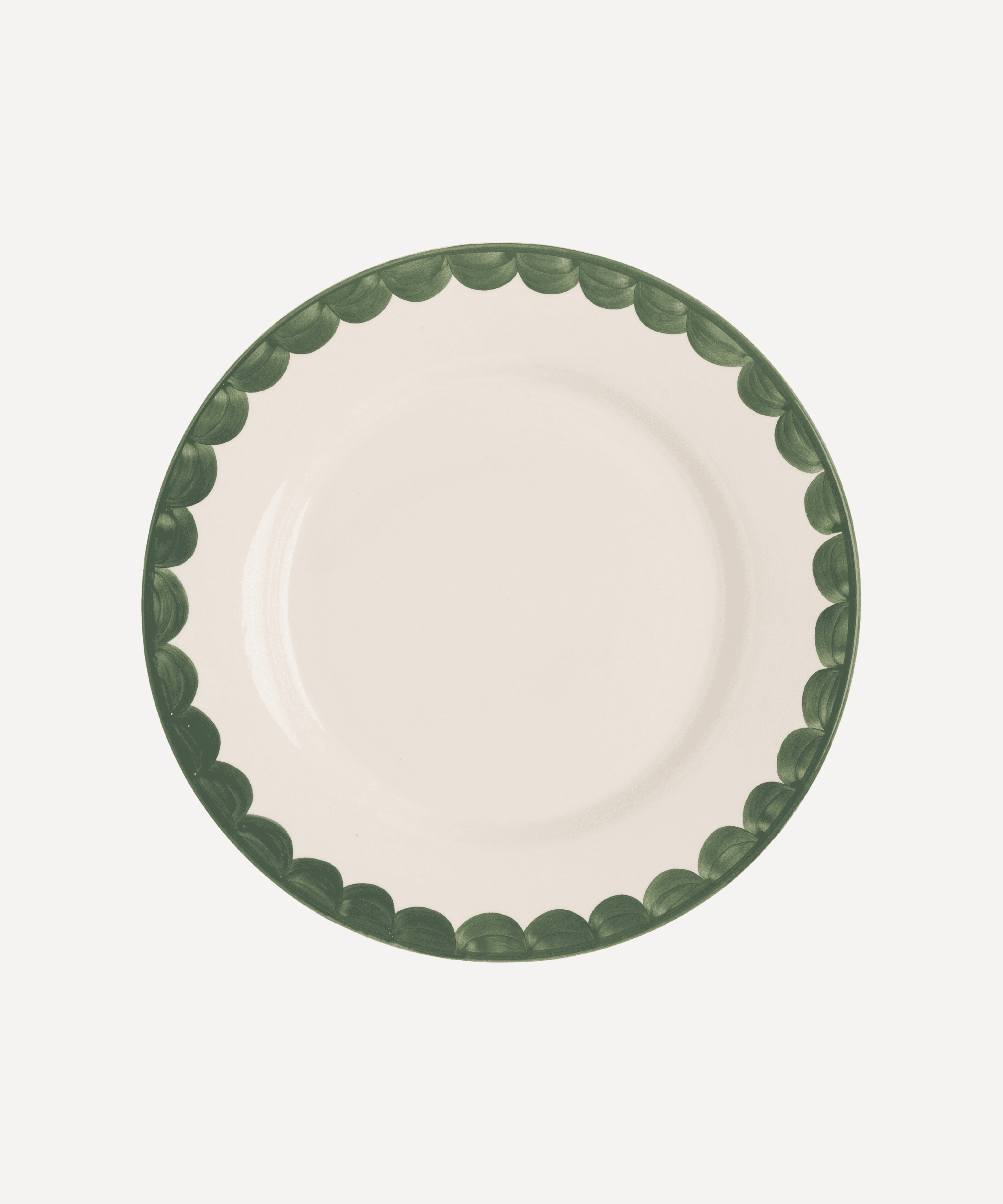 Hand-painted green scallop side plates.With designs inspired by the 'fajalauza' ceramic tradition of southern Spain, Late Afternoon's dinnerware sets speak of sunshine, long lunches and 'sobremesa': the Spanish word for the conversation over the table after a meal with family and friends.
