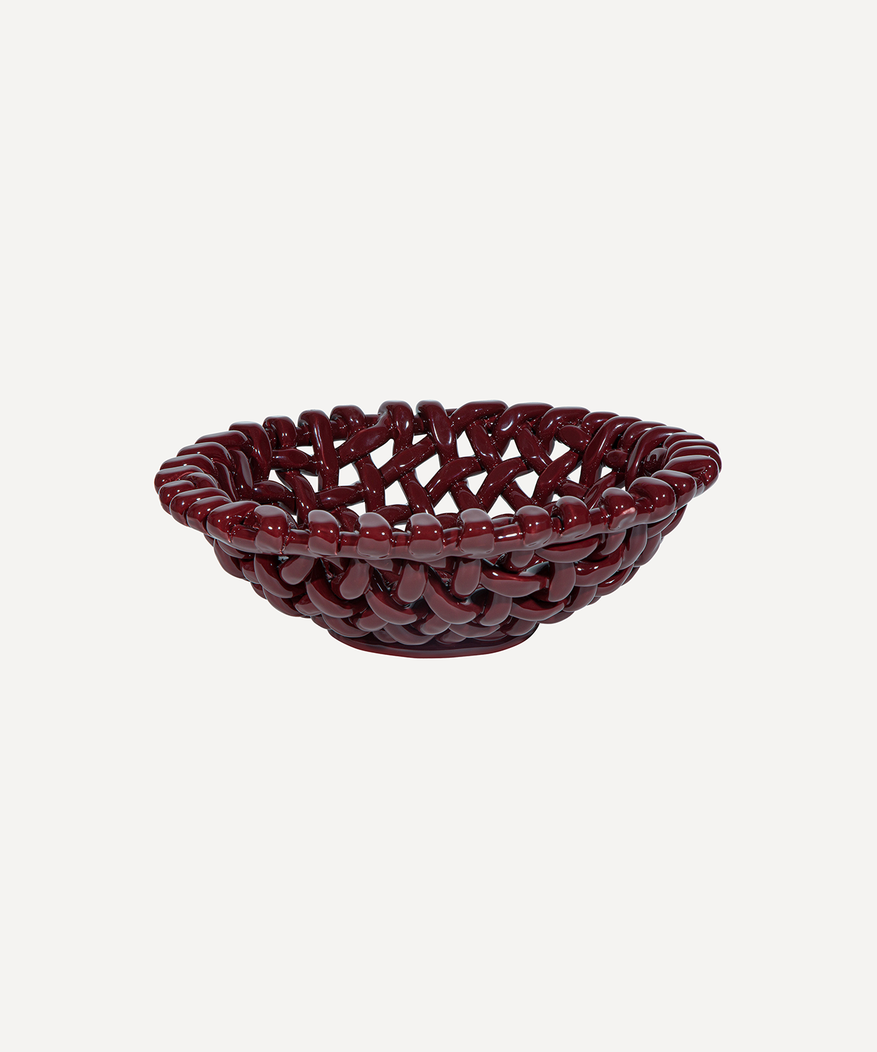 Handwoven burgundy ceramic basketweave bowl. Designed to display, these glazed bowls are the ultimate sideboard show-off.