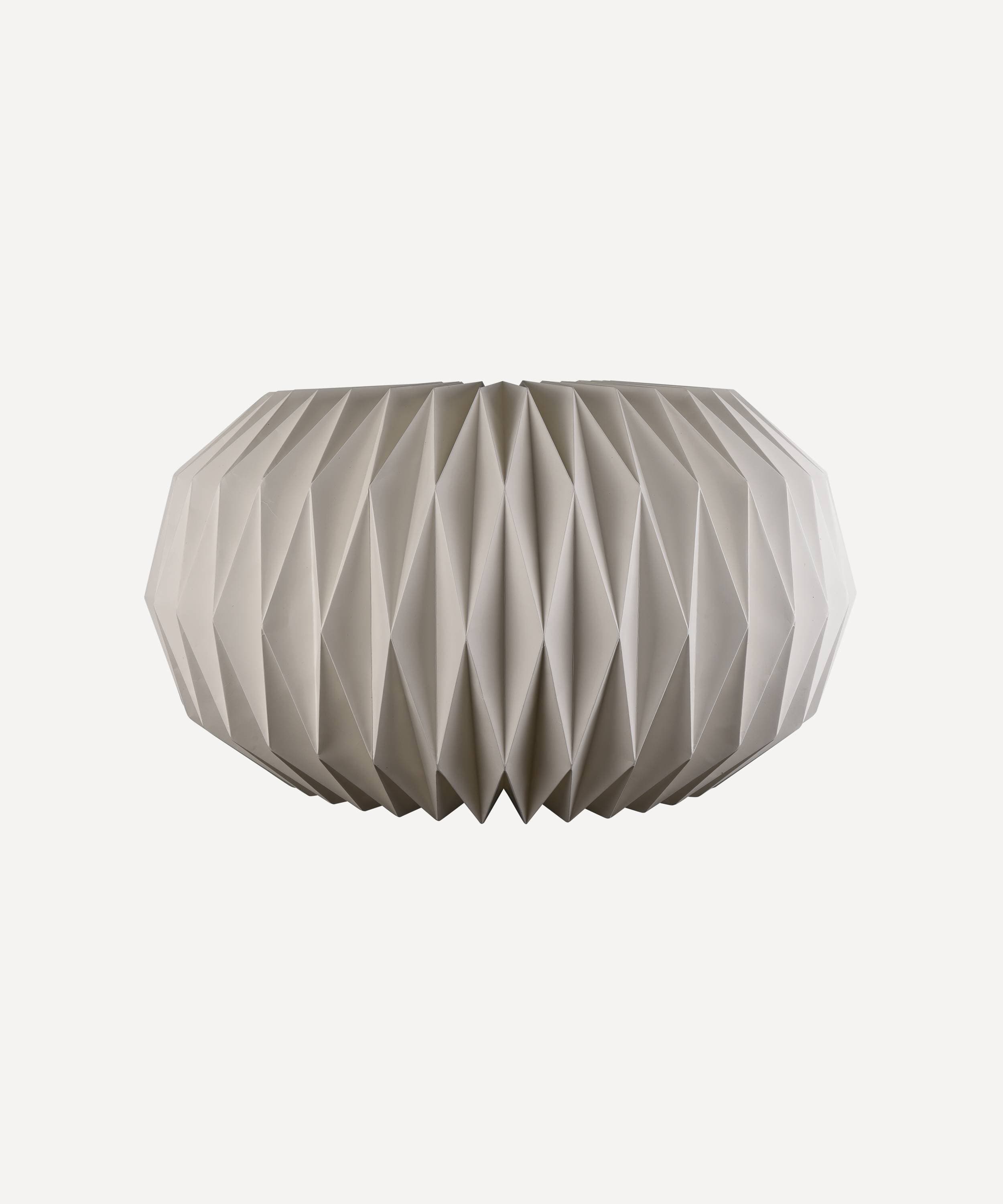 This beautifully simple and pure white paper lampshade is handmade using the traditional skill of origami. Fashioned into a huge pumpkin shape, the result is understated elegance. The folds are crisp creating exquisite clean shapes and lines when unlit. Lit, this lampshade gives off a warm ambient glow that shows the high quality of the handmade paper.