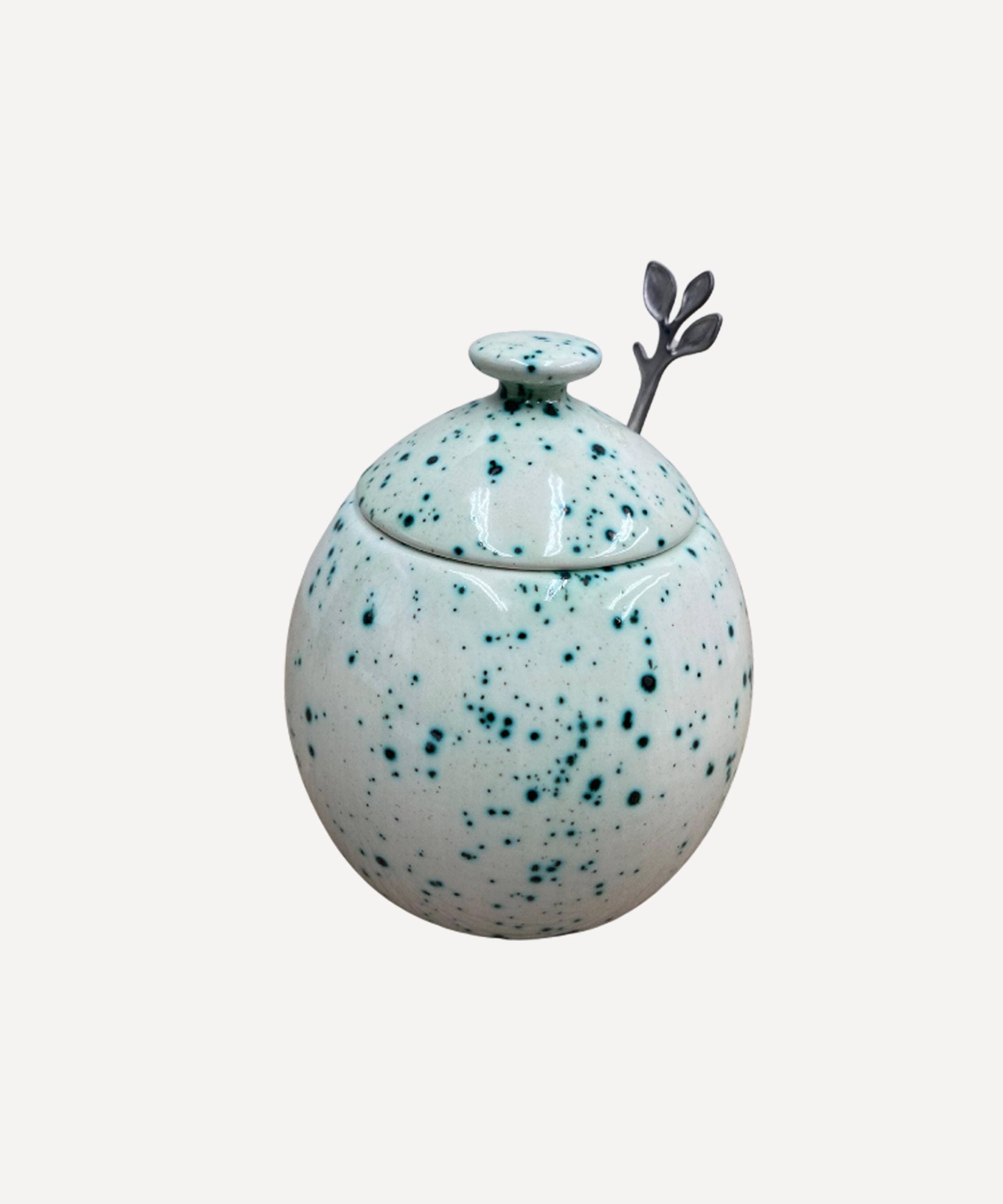 These sugar bowls are individually hand glazed and fired in my own electric kiln in Somerset, England and not mass produced in a factory in a faraway land..!Each sugar bowl and lid measures 110mm high (4 inches) 90mm in diameter (3.5 inches). The stainless steel spoon is 125mm (5 inches) long.This lovely and unusal ceramic sugar bowl with lid and spoon is finished with a high gloss food safe speckled green glaze on the outside and glossy white glaze inside.Dishwasher and microwave oven safe. Can also be used for storing sweeteners or a range of different sugars.