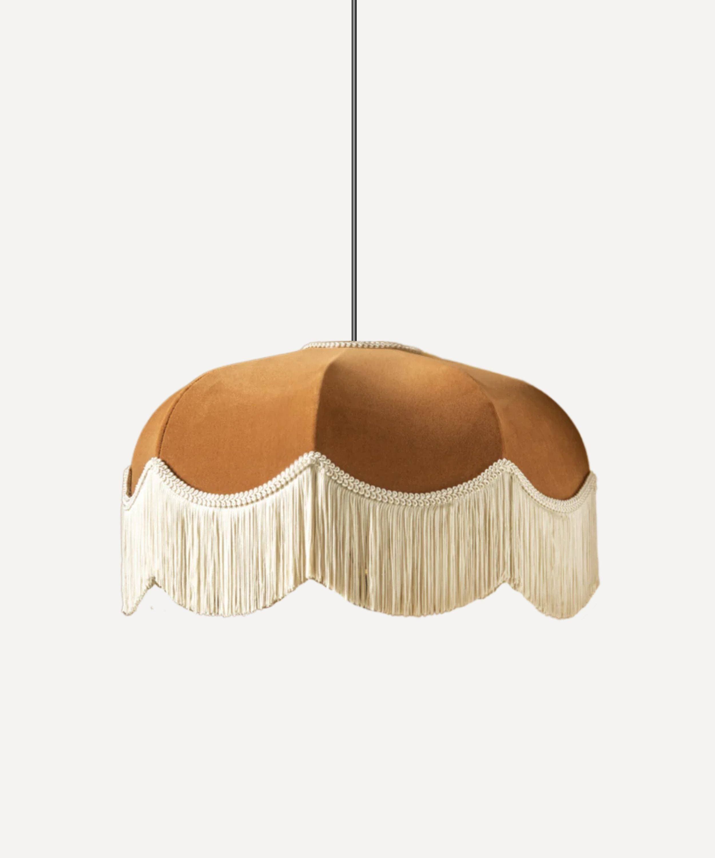Brown is the new neutral and our handmade Emmy lampshade is a simple way to channel this rich, warm hue. As seen in the gorgeous home of interior designer Patricia Rodi. The Emmy at a glance:Brown velvetIvory braiding and fringeLined in white