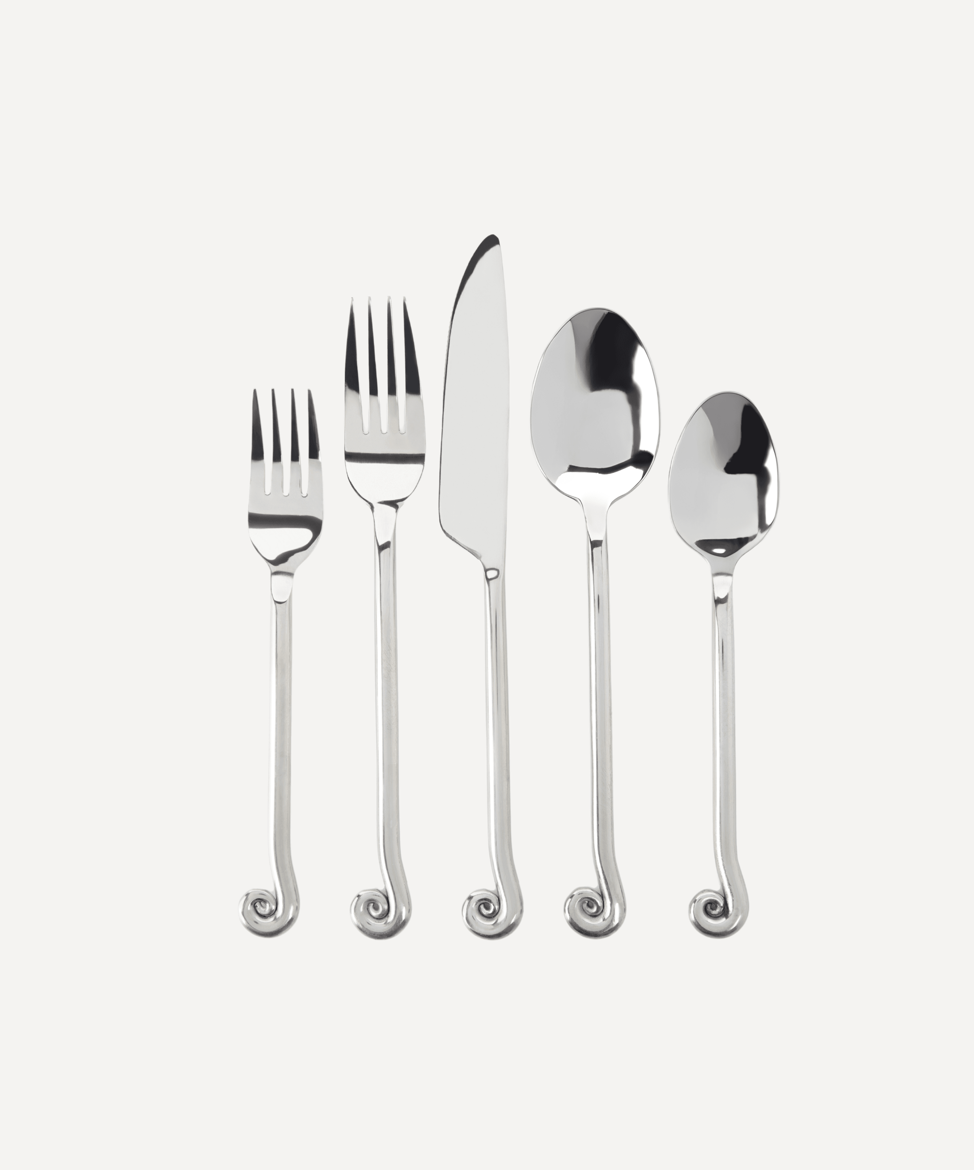 silver five-piece handmade cutlery set with spiral handle detail.