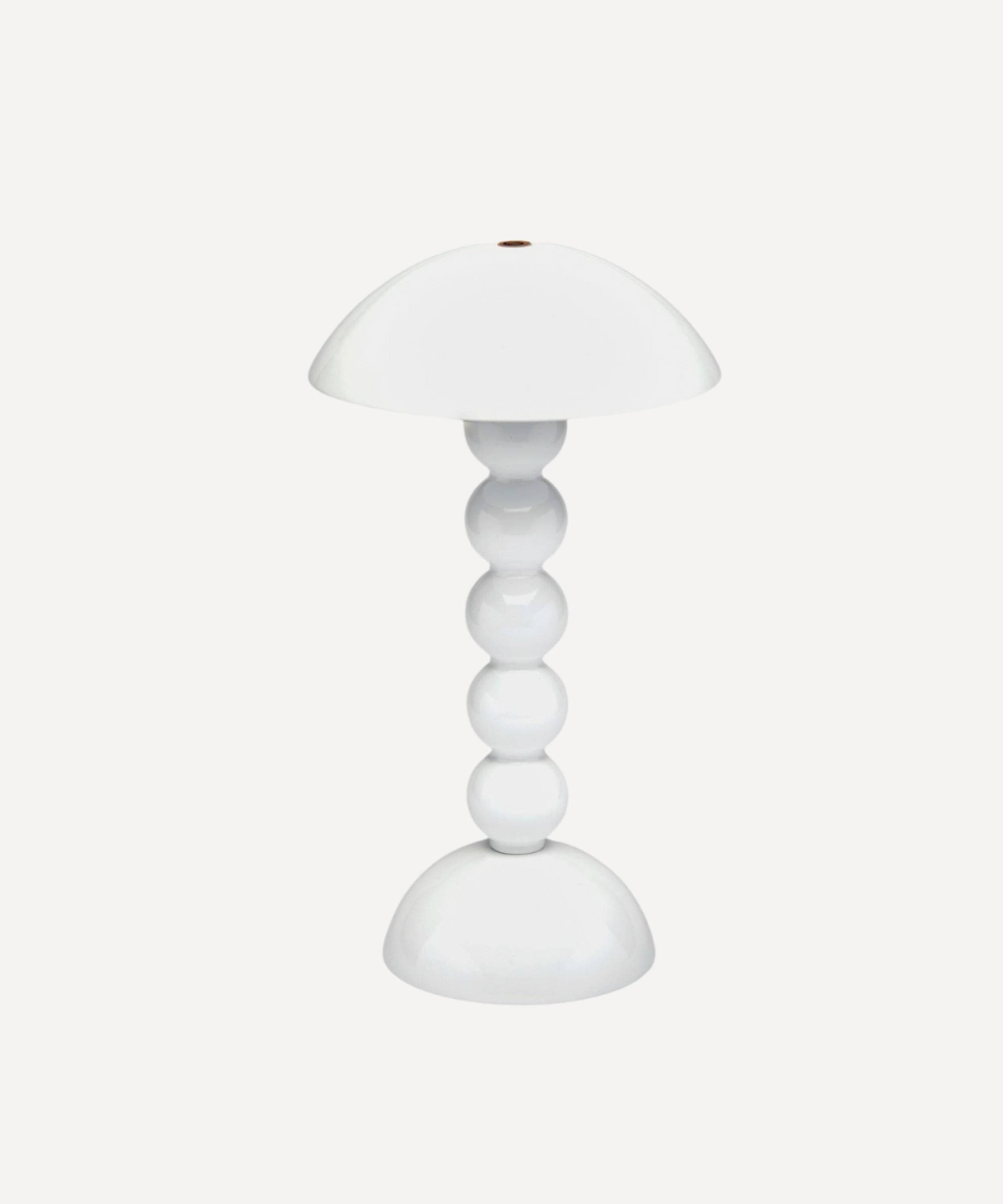 This White one-of-a-kind lamp features a Bobbin-Shaped design. It offers up to 10 hours of battery life on its brightest setting and has three adjustable light levels.