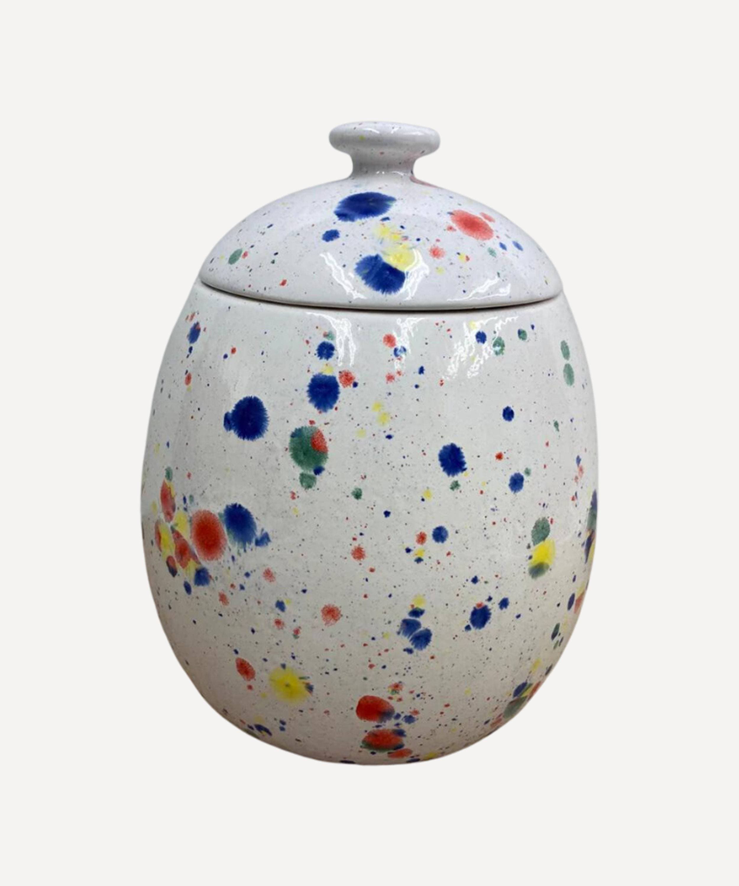 A uniquely designed handmade cookie jar/biscuit canister with unusual random splashes of colour makes an ideal housewarming gift or for that someone special a place to hide your chocolate chip cookies or digestives...!This design with the Celebration Glaze matches my Butter Dish, Sugar Bowl and Toast Rack.This cookie jar will hold lots of candy and sweets too.