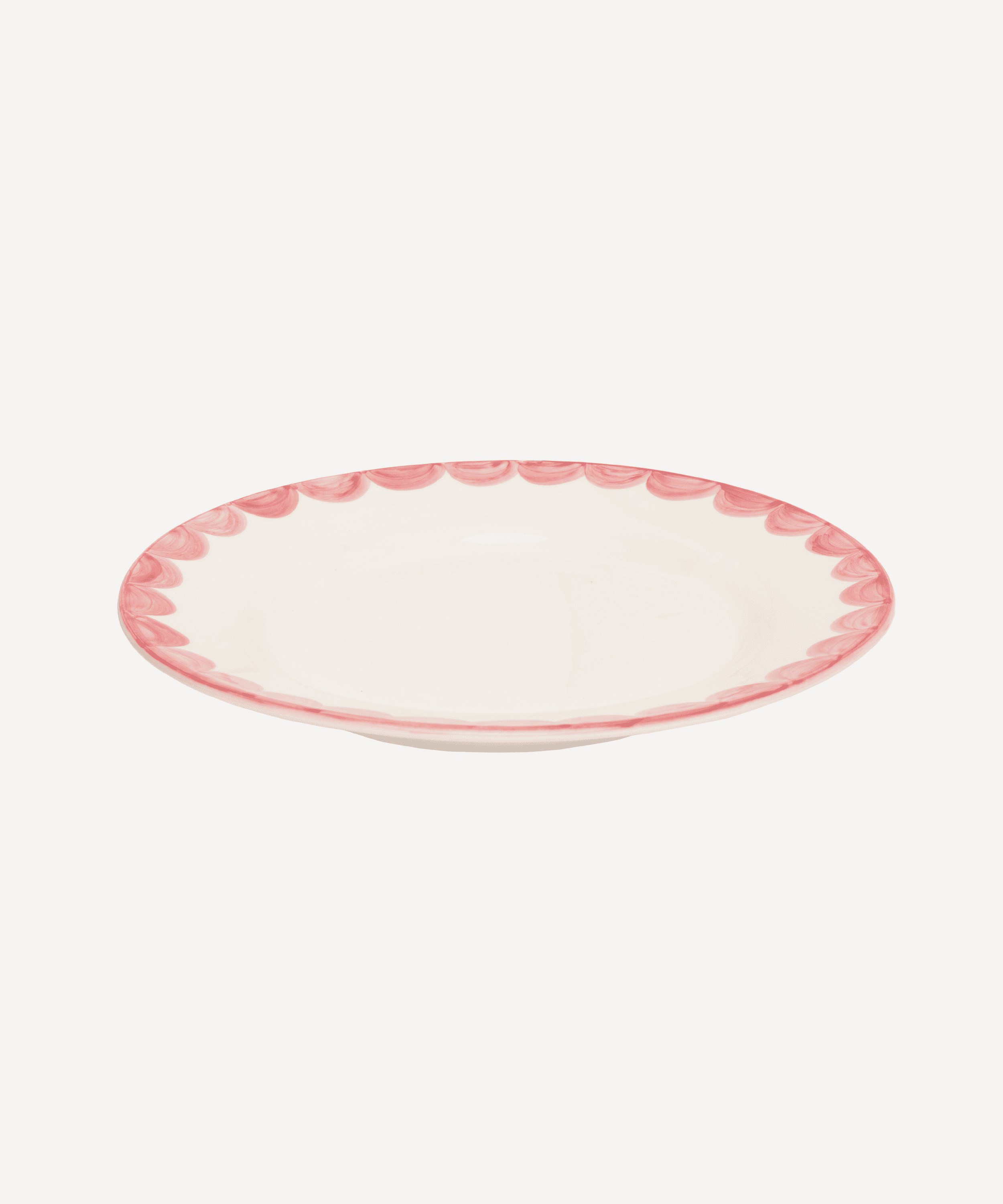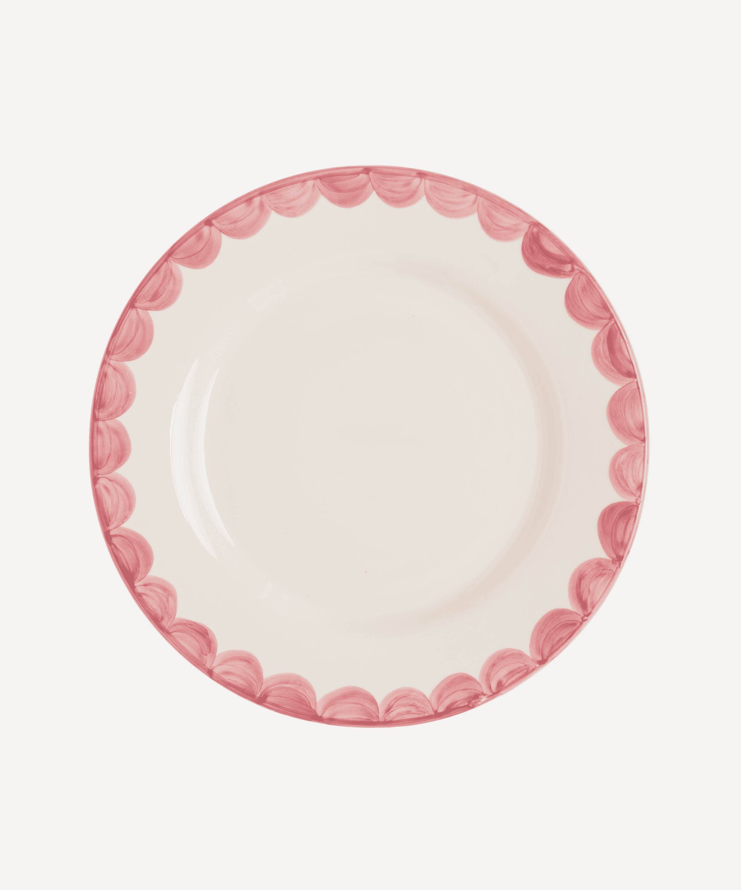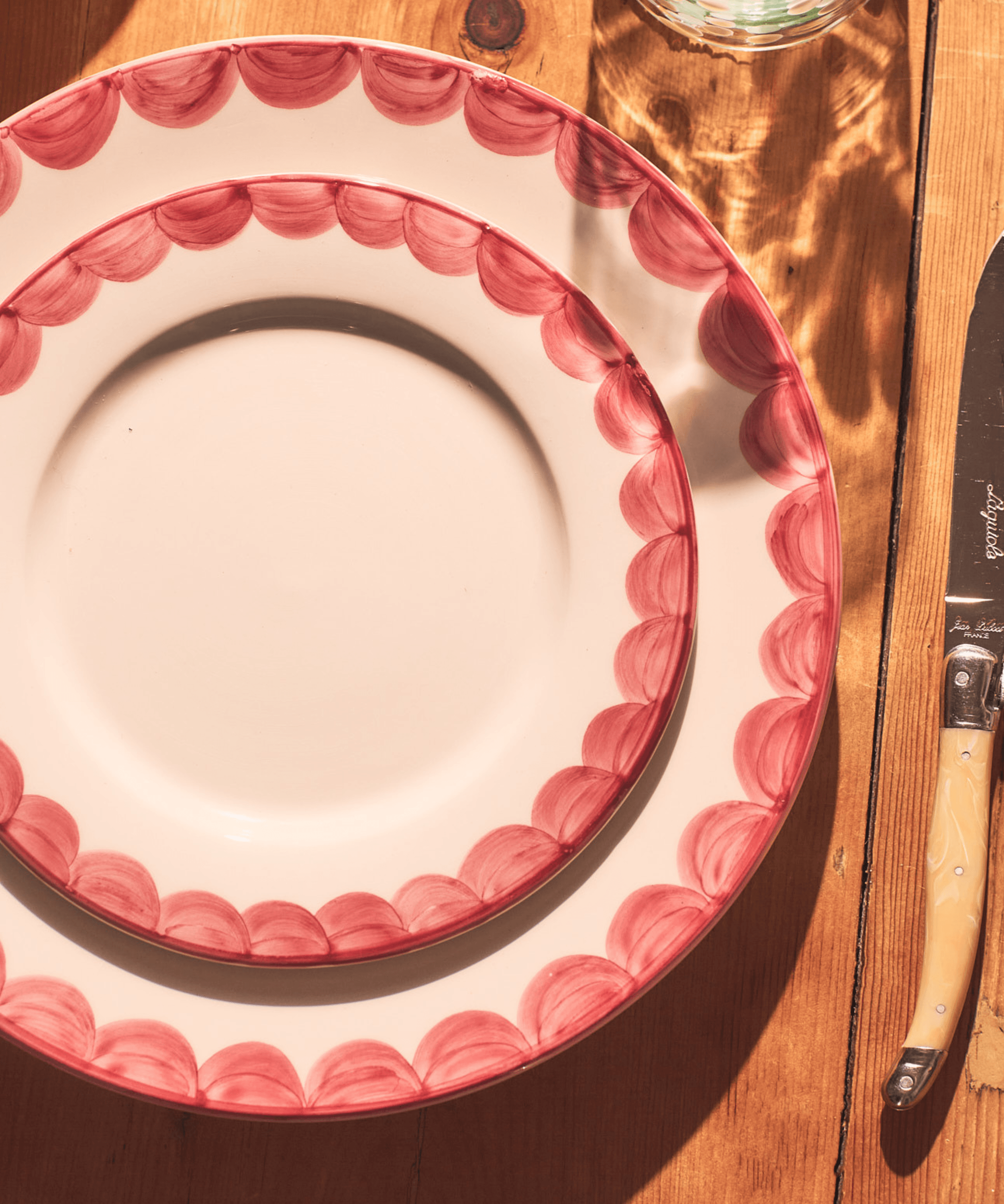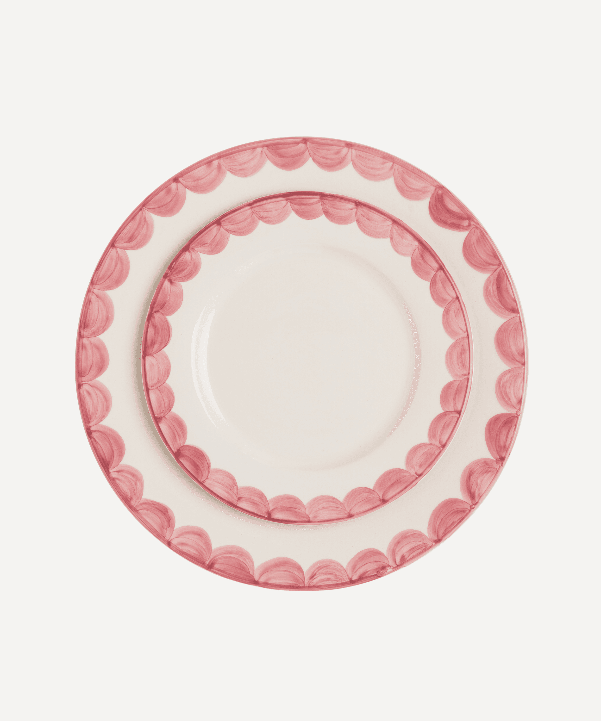 Hand-painted pink scallop side plates.With designs inspired by the 'fajalauza' ceramic tradition of southern Spain, Late Afternoon's dinnerware sets speak of sunshine, long lunches and 'sobremesa': the Spanish word for the conversation over the table after a meal with family and friends.
